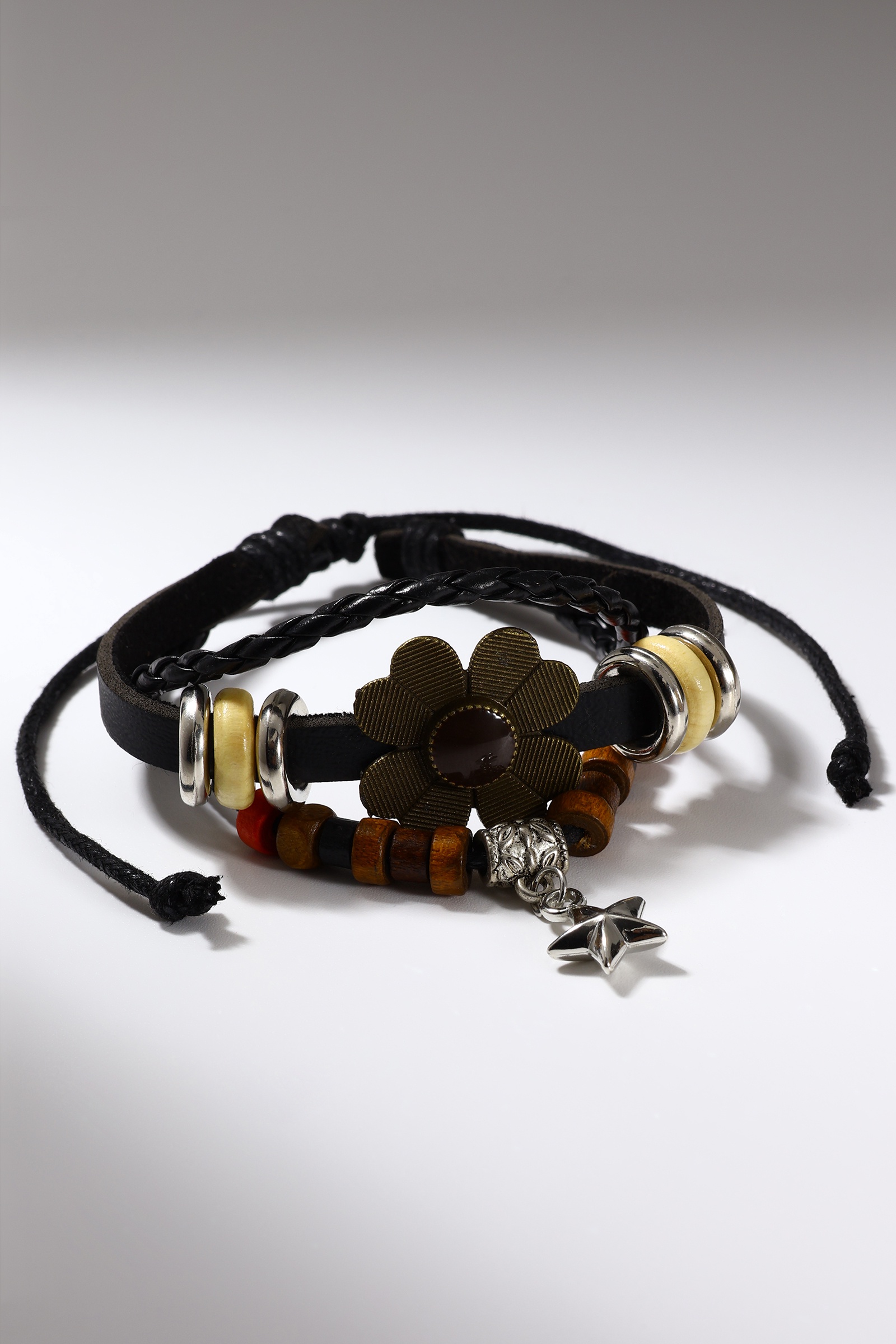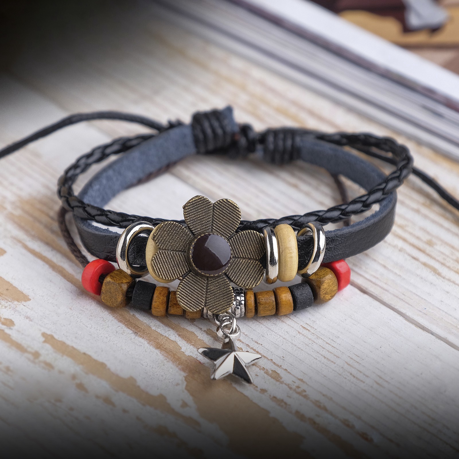 Браслет кожа «цветок со звездочкой» хиппи, коричнево-чёрный, 6 см