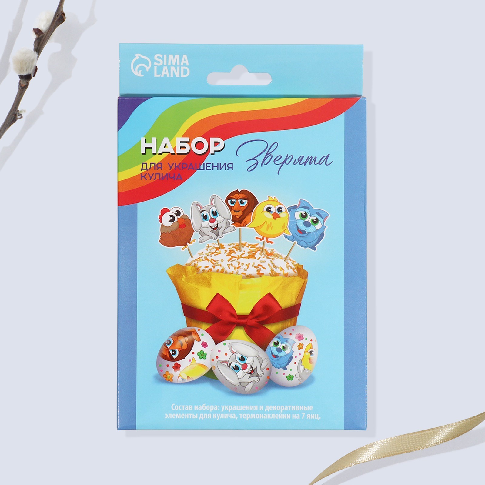 Набор для украшения кулича «зверята», 18,5 х 16 х 1 см.. Пасха - светлый праздник. По традиции все украшают варенные яица, пекут куличи, ходят друг к другу в гости и обмениваются подарками. Можно подарить маме или сделать подарок бабушке, а готовые украшенные куличи вручить родным и друзьям. Исключительно безопасные ингредиенты, которые тщательно отбираются, обеспечивают аппетитный внешний вид продукции. Данный набор - это Ваш инструмент для создания кулинарных шедевров и реализации творческого потенциала. В Пасхальный набор входит: - термонаклейки на 7 яиц; - топперы для кулича - 5 шт; - тишью для кулича - 1 шт; - лента для кулича - 1 шт. Цвет: Разноцветный Длина, см: 1 Возраст: От 2 лет Высота держателя, см: 9.5 В наборе, шт.: 14 tnved: 4911990000 Материал: Дерево Материал: Картон Материал: Бумага Материал: Текстиль Вид наклейки: Для яиц Составляющие набора: Наклейки Составляющие набора: Топпер Составляющие набора: Декор Вид: Ободки Вид: Термоплёнка Вид: Топперы Назначение: Для яиц Назначение: Для кулича, пасхи  развернуть описание ▼