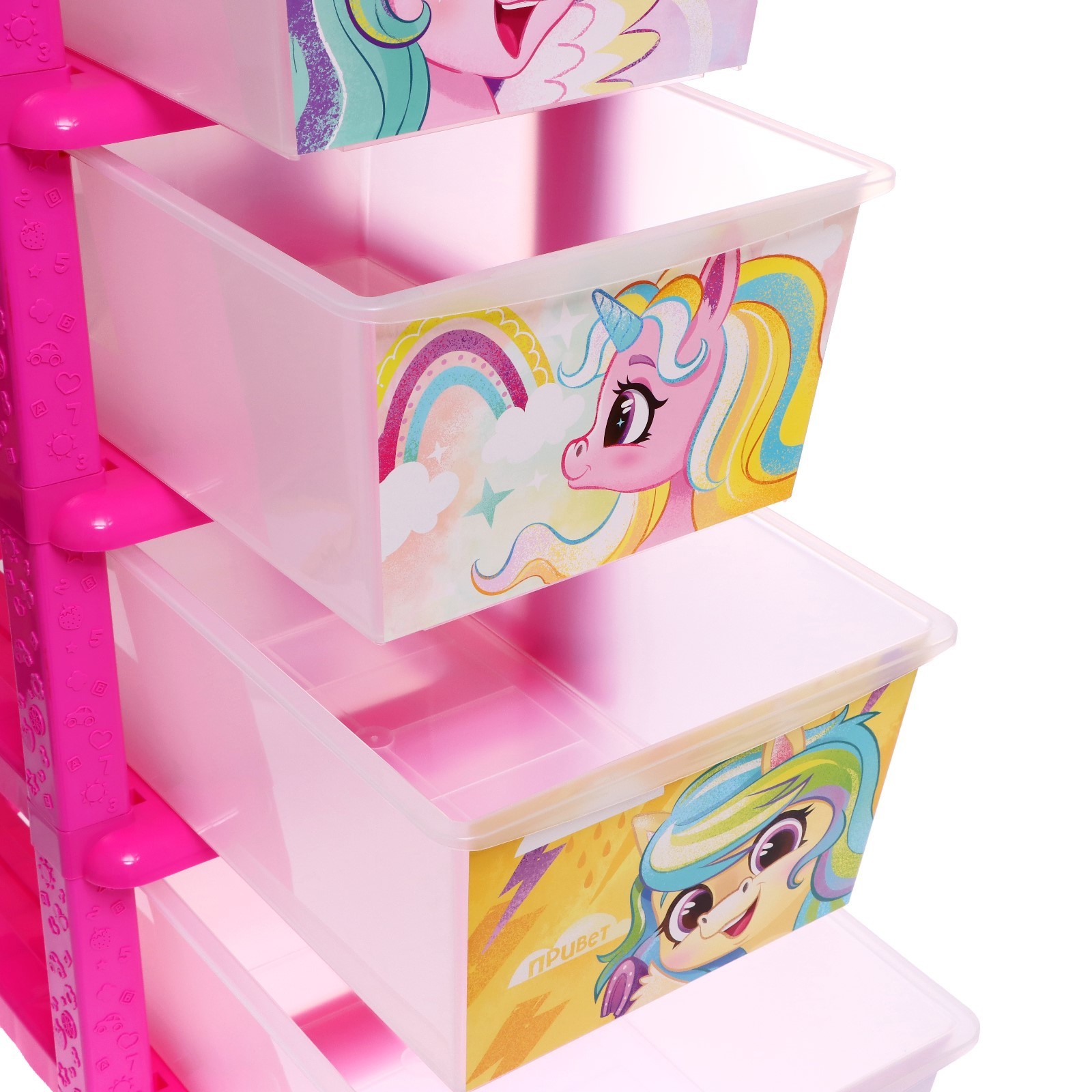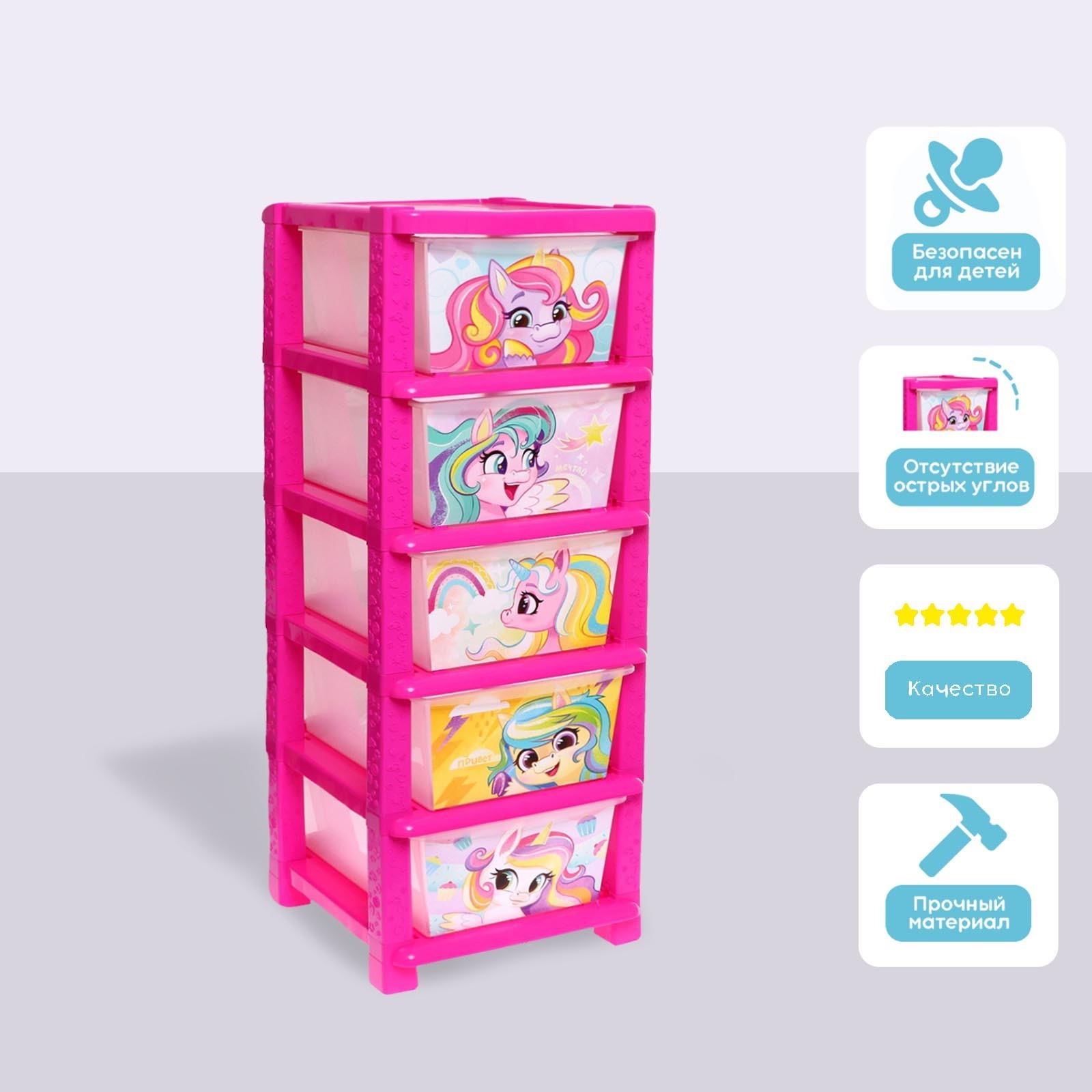 Комод «милые единорожки», 5 секций. Система модульного хранения послужит функциональным украшением для детской комнаты, а своим ярким дизайном привлечёт внимание. Вместительный и компактный Практичный комод поможет правильно организовать хранение вещей. Изделие имеет жёсткую конструкцию. Отсутствие острых углов делает его безопасным для ребёнка. Каркас и контейнеры изготовлены из экологически чистого материала, поэтому не содержат вредных веществ. Особенности: высокопрочный пластик;простая и быстрая сборка;ящики выдвигаются полностью, их легко достать и вставить обратно;простота в уходе;подходит для детской комнаты, ванной, коридора. Качество, подтверждённое сертификатами Строгий контроль на всех этапах, начиная от производства, заканчивая упаковкой товара, исключает брак и делает детали комода действительно качественными. Стыки всех элементов обрабатываются вручную, а затем проходят дополнительную проверку на отсутствие острых частей. Имеет сертификат соответствия ЕАС. Цвет: Розовый Ширина, мм: 420 Глубина, мм: 520 Высота, мм: 1270 Количество секций: 5 Цвет: Розовый Материал: Пластик Температурное ограничение: Нет Услуга сборки: Нет Поставляется в разобранном виде: Да  развернуть описание ▼