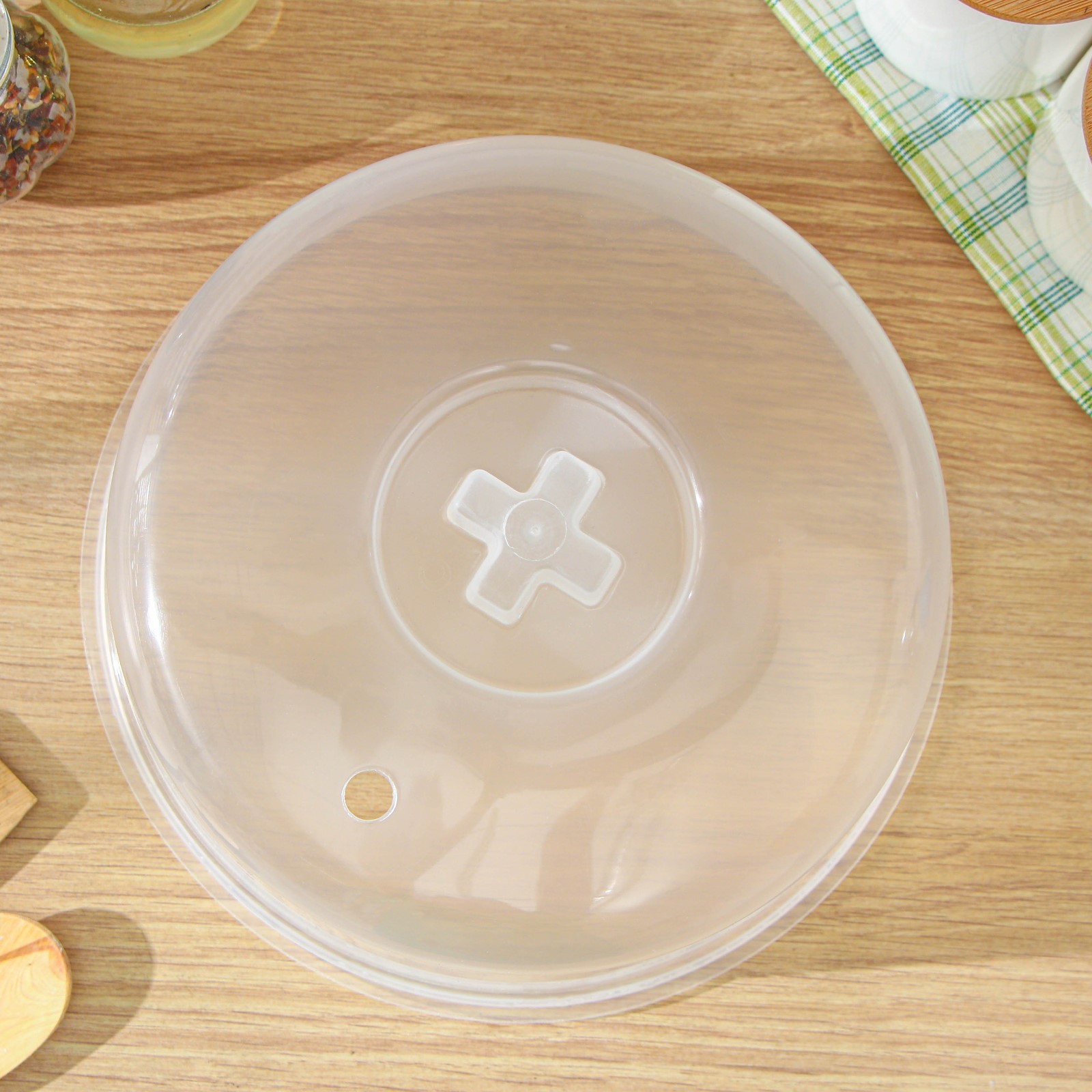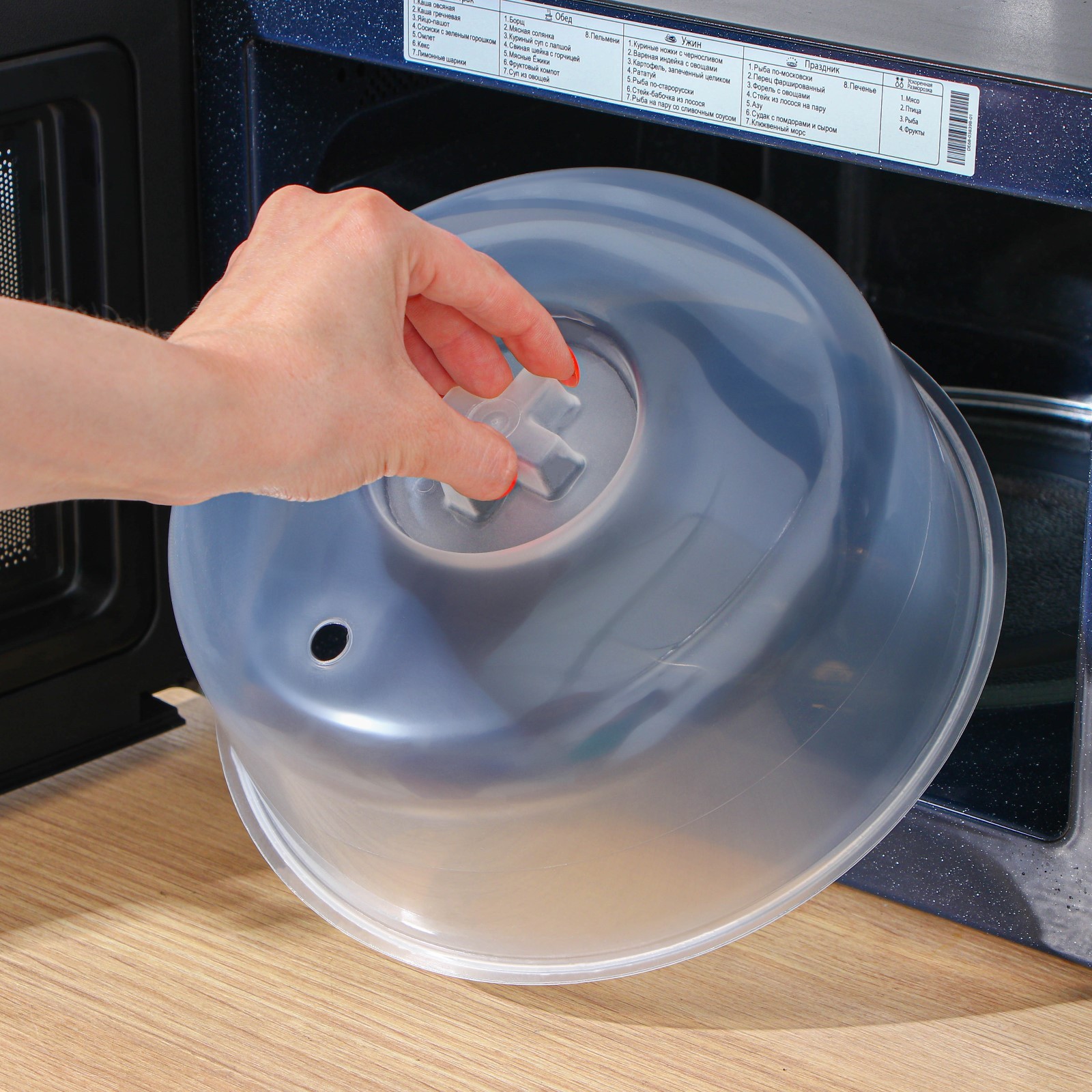 Крышка для свч, d=25 см, h=10,5 см, цвет прозрачный. Крышка для СВЧ сохранит ваши блюда сочными после разогрева в микроволновой печи, а саму печь защитит от загрязнения. Особенности крышки для СВЧ:Возможно использование при температуре от –40 до +110 °C. Имеется отверстие для выхода пара. С помощью крышки пища разогревается равномернее. Можно использовать в холодильнике как крышку для торта, сыра и т. п. Легко почистить как в тёплой, так и в холодной воде с помощью моющих средств для посуды. Нельзя применять в микроволновых печах при режиме «Гриль». Не впитывает запахи. Легка и удобна в использовании. Долговечность, практичность и экономия времени. Цвет: Прозрачный Форма: Круглая Диаметр, см: 25 Крышка: Да Материал: Пластик Температурное ограничение: Нет Форма: Круг, шар, цилиндр  развернуть описание ▼