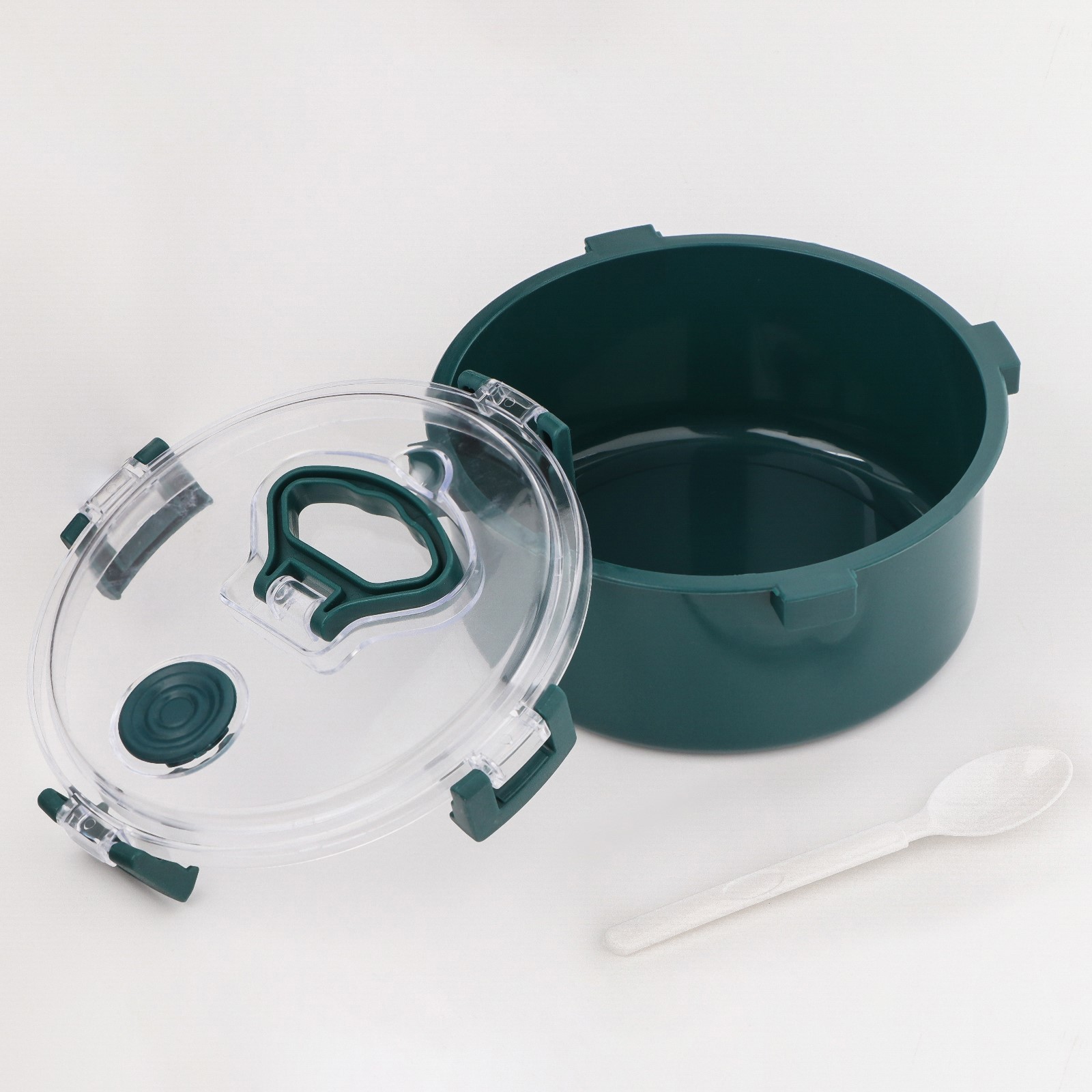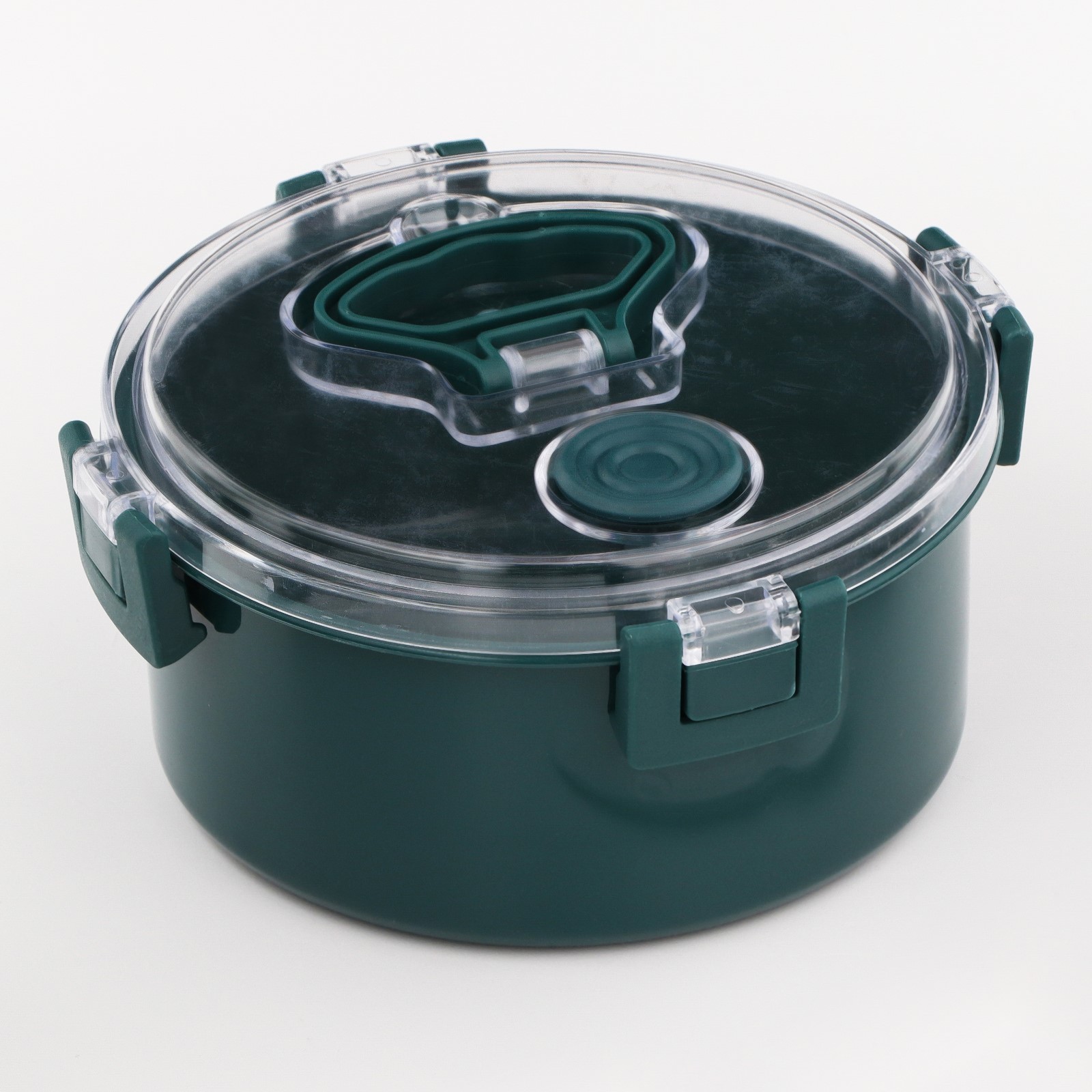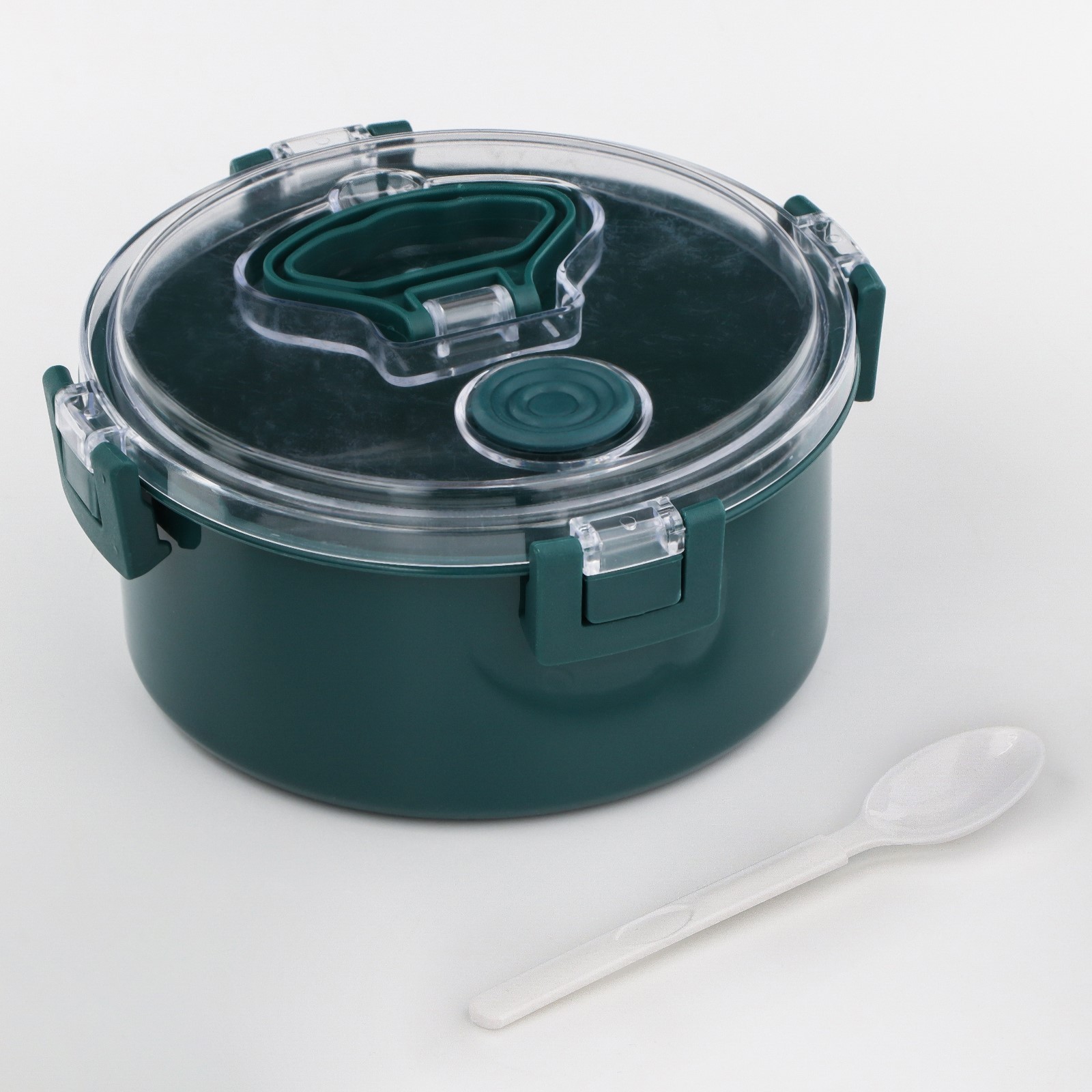 Ланч-бокс "антрима" , 1.1 л , 17,5 х 17,5 х 8,5 см. Ланч-бокс со столовыми приборами предназначен для транспортировки еды с собой на работу, в офис, на учебу, отдых и в любые другие места. Для многоразового использования! Экологичный и безопасный материал, не содержит бисфенол А и фталаты, подходит для мытья в посудомойке, хранения в холодильнике, а также разогрева в СВЧ-печи. Не впитывает запахи. Цвет: Зелёный Форма: Круглая Объём, л: 1.1 В наборе, шт.: 2 Объём, мл: 1100 Материал: Пластик Герметичная крышка: Да Можно использовать в СВЧ-печи: Да Форма: Круг, шар, цилиндр  развернуть описание ▼