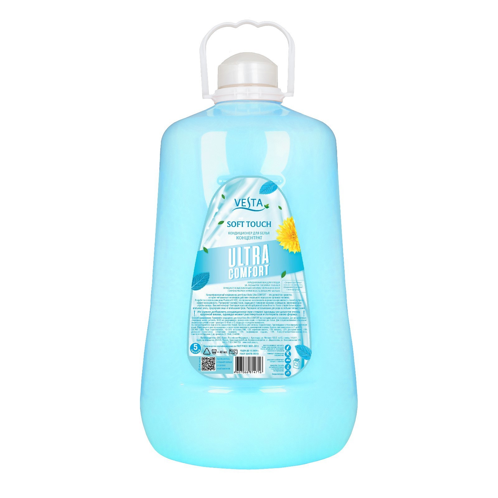 Кондиционер для белья vesta ultra comfort soft touch, парфюмированный, 5 л. Концентрированный кондиционер для белья серии «Vesta» Ultra COMFORT – это деликатное средство, разработанное для особо чувствительной кожи, нейтрализует негативное действие стирального порошка на организм человека. Высокий комфорт благодаря хорошей абсорбционной способности. Смягчающие вещества, полученные из природных источников, восстанавливают мягкость одежды и белья. Особая формула минимизирует износ ткани, увеличивая срок службы одежды. После стирки белье хорошо впитывает влагу, предохраняя вещи от впитывания грязи. Предназначен для ухода за любыми типами тканей. Способ применения: применяйте кондиционер для белья Vesta Ultra COMFORT на последнем цикле ополаскивания. Для автоматических стиральных машин добавить 10-20 мл кондиционера, разведенного водой, в отделение для белья. Для полуавтоматических стиральных машин и при ручной стирке - разведите 5-10 мл в 10 л воды для последнего полоскания. Хорошо растворяется в воде и легко смывается с тканей. Безопасно для человека, биоразлогаемый. При попадании в глаза промыть проточной водой. Состав: >30% Вода подготовленная, >5<15% катионные ПАВ, <5% акриловая кислота, <5% полимер, <5% дисперсия воска, <5% дисперсия полиэтилена (облегчение глажения), <5% парфюмерная отдушка, <5% 5-хлор-2-метил 4-изотиазолин-3-он, 2-метил 4-изотиазолин-3-он, краситель C1 19140, C1 42090. Объем: 5 л. Объём, л: 5 Аромат: Парфюм Назначение: Для всех видов тканей : 0 Особенности средства: Концентрат  развернуть описание ▼