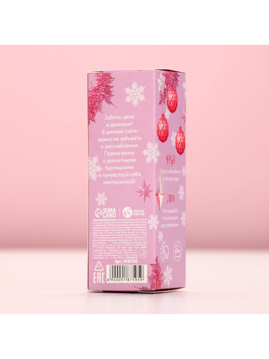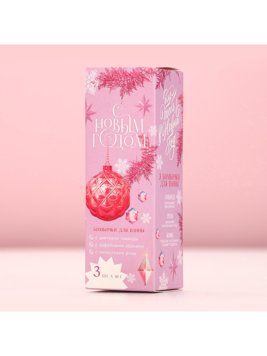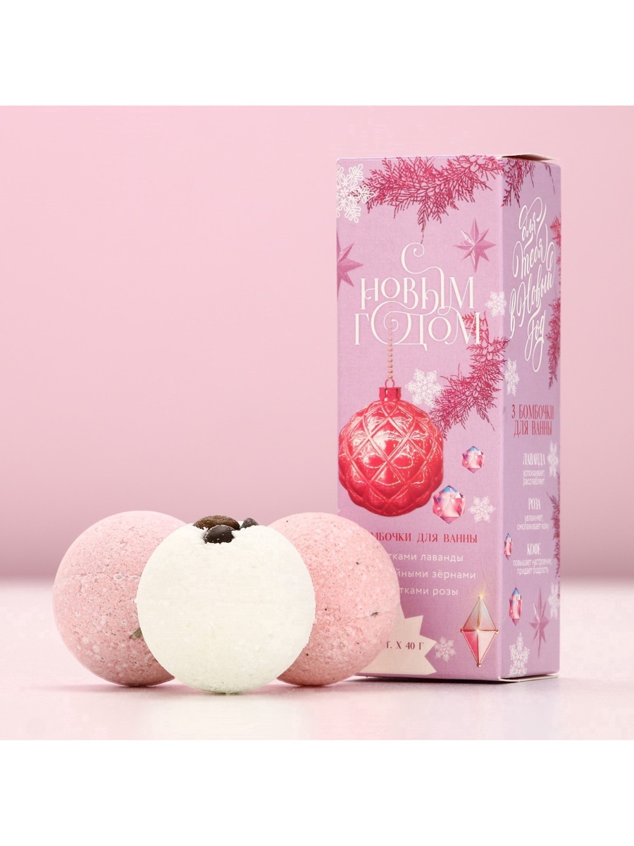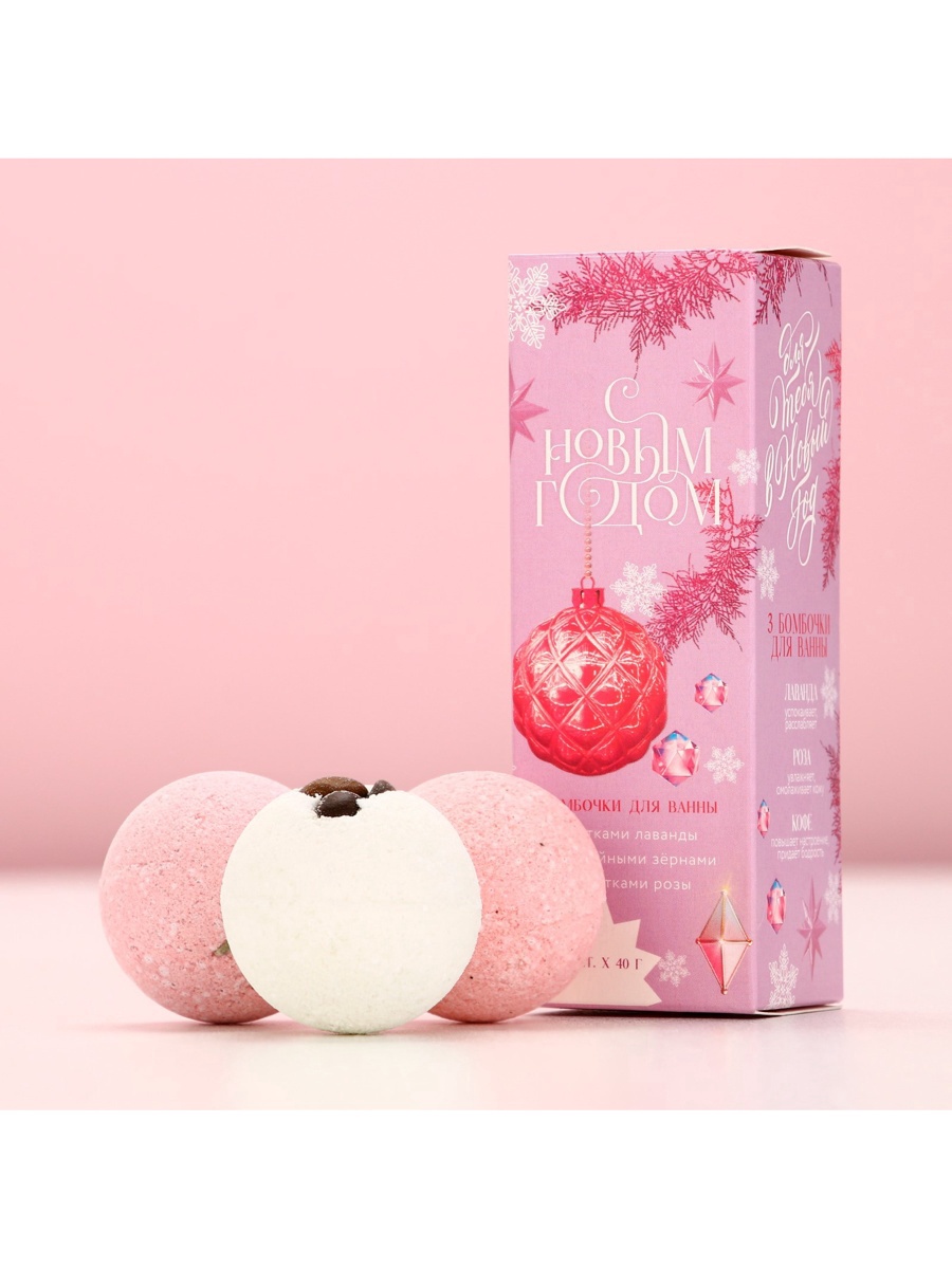 Бомбочки для ванны с добавками «с новым годом!», 3 40 г, аромат лаванда, роза, кофе, чистое счастье. Набор:Да|Цвет:Разноцветный|Для кого:Для женщины|Форма:Шар|В наборе, шт.:3|Вес, г/Объём, мл:40|Вес, г:40|Тематика:Новогодняя|Вид упаковки:Подарочная коробка|Символ года:Нет|Тематика праздника:Новый год|Адресат:Без адресата|Возраст:Взрослый|Область применения:Для тела|Аромат:Кофе|Аромат:Лаванда|Аромат:Роза|Составляющие набора:Бомбочка для ванн|Темпер. ограничение НЕ НИЖЕ :+5|Темпер. ограничение НЕ ВЫШЕ :+25|Возраст:Для взрослых|Возраст:Для всех возрастов|Назначение:Тонизирование|Особенности:С сухоцветом|Особенности:С зёрнами кофе|Страна:Россия  развернуть описание ▼