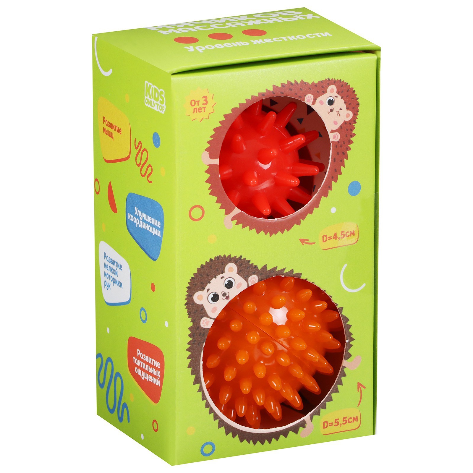 Набор массажных мячей onlytop «ёжики»: 2 шт., d=4,5, d=5,5 см, цвета микс. Набор массажных мячей предназначен для физического воздействия на биологически-активные точки на теле. Применяется с целью общего оздоровления организма, укрепления иммунитета, расслабления, снятия физического и психоэмоционального перенапряжения. Массажёр развивает моторику рук ребёнка, способствует улучшению памяти, внимания и развитию речи. Диаметр: 4. 5 см, 5. 5 см. Изделие подходит для детей и взрослых. Цвет: Красный Диаметр, см: 4.5 Диаметр, см: 5.5 Возраст: От 3 лет В наборе, шт.: 2 Материал: Пластик  развернуть описание ▼