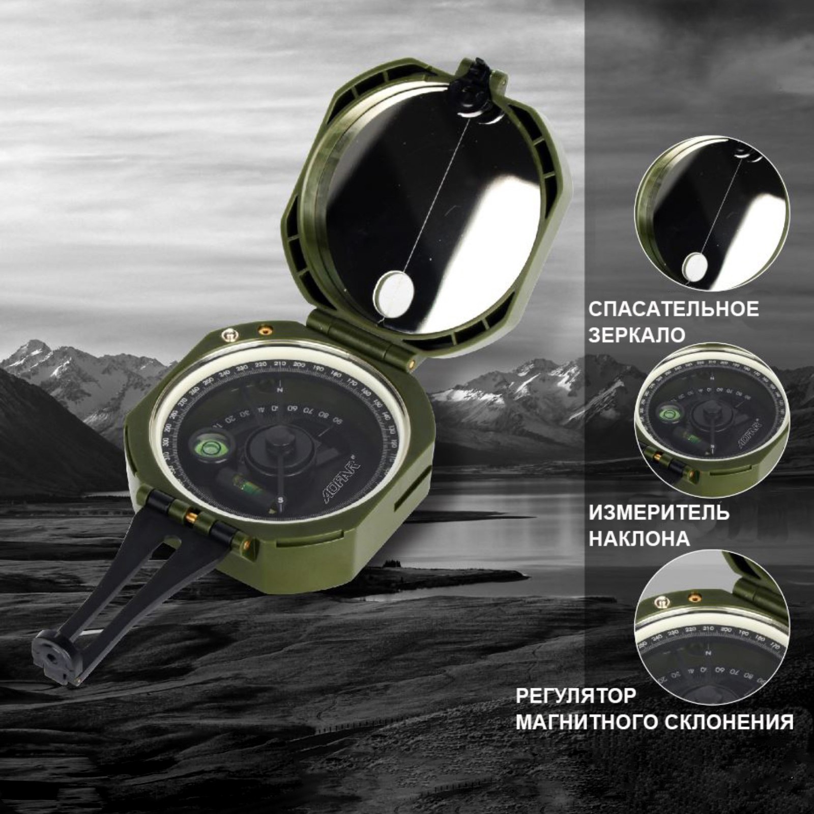 Компас многофункциональный "егерь". Функции компаса: короткий прицел (диоптр); линия прицеливания (cross hair); горизонтальный лимб; механизм магнитной стрелки; круглый уровень (circular level); соединительная петля; уровень воды; прицел; спасательное зеркало; водонепроницаемый; четкое определение позиции. Цвет: Зелёный Материал: Пластик Особенности: С крышкой Особенности: С линией прицеливания Особенности: С уровнем Особенности: С четким определением позиции Особенности: Со спасательным зеркалом Особенности: С горизонтальным лимбом Тип: Магнитный Вид: Компасы  развернуть описание ▼