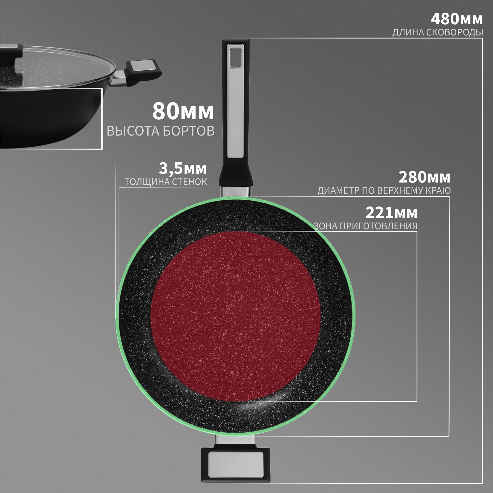 Сковорода Magistro Warrior, D=28 см, H=7,5 см, со стеклянной крышкой, ручка Soft-touch, антипригарное покрытие, индукция