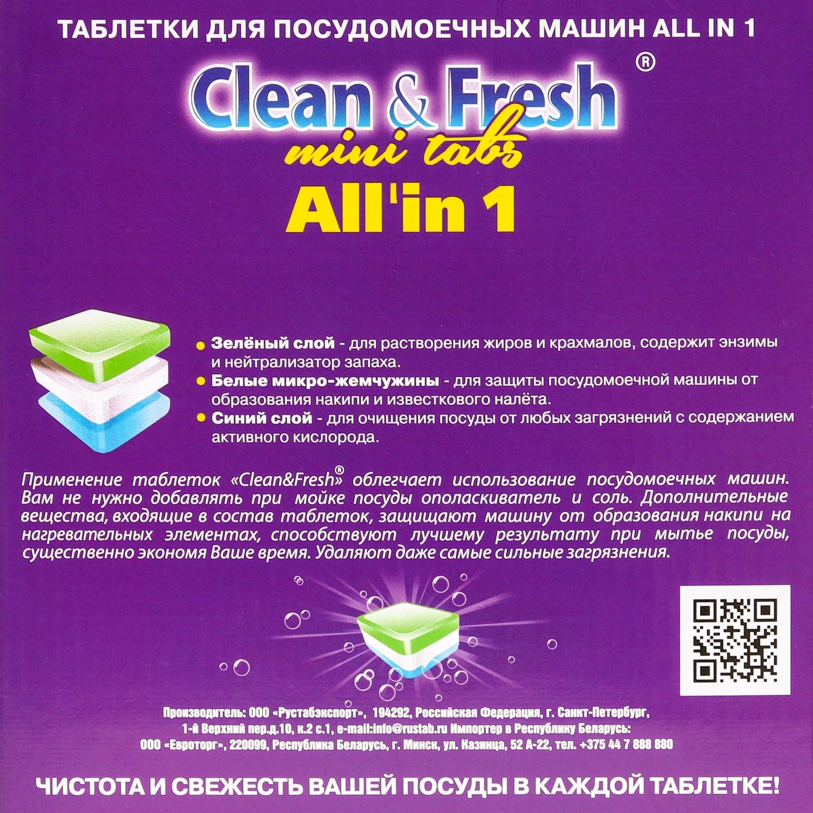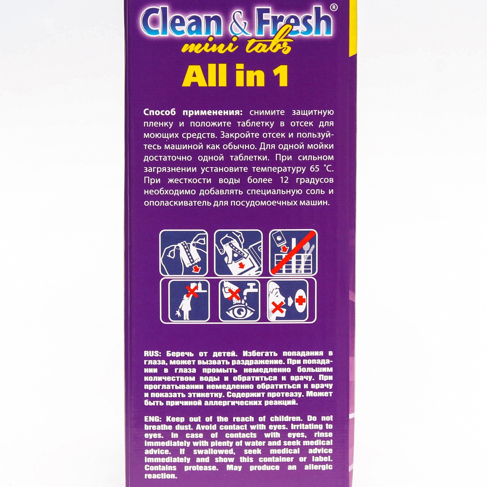 Таблетки для посудомоечных машин clean&fresh, all in1 mini tabs, 200 шт. Уникальные таблетки для посудомоечной машины предназначены для: компактных посудомоечных машин (до 45 см);неполной загрузки;короткого цикла мойки (30 минут). Мини таблетки для посудомоечных машин имеют несколько цветных слоёв: зеленый - растворение жиров и крахмалов, содержит энзимы и нейтрализатор запахов;белые микро-жемчужины - защита посудомоечной машниы от образования накипи и известкового налета;синий - очищение посуды от любых загрязнений с содержанием активного кислорода. Таблетки для посудомойки - чистота и свежесть Вашей посуды в каждой таблетке, а также незаменимое средство в категориях бытовая химия и гигиена. На качество мытья посуды в посудомоечной машины, помимо таблеток, влияют многие факторы, поэтому, пожалуйста, следите за правильной расстановкой посуды, выбирайте подходящий режим мойки, используйте соль Clean & Fresh при жесткой воде, не забывайте следить за состоянием фильтров и регулярно используйте очиститель Clean & Fresh. В упаковке, шт.: 200 Ароматизированные: Да Температурное ограничение: Нет  развернуть описание ▼