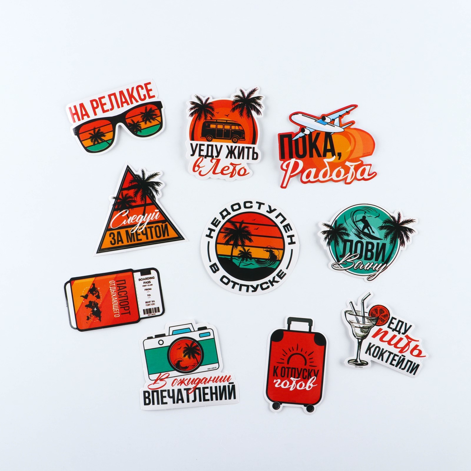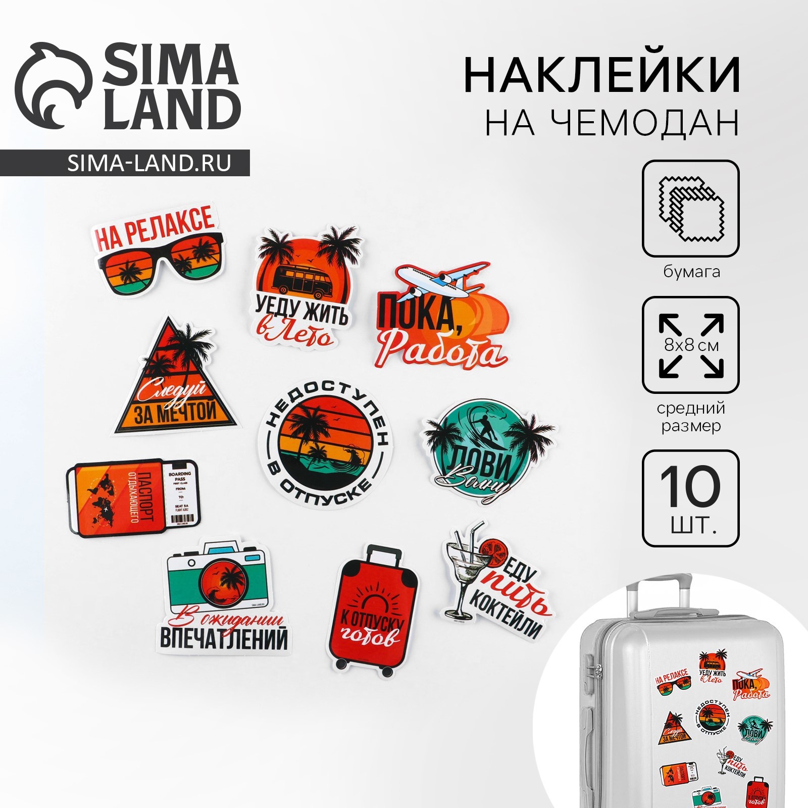 Наклейки на чемодан «на релаксе», 10 шт. Отправляясь на отдых, мы часто забываем о том, каким долгим может быть ожидание багажа и последующий поиск своего чемодана в аэропорту. Украсьте ярким и заметным наклейками ваш багаж! Тогда он точно не затеряется на ленте выдачи, и вы не спутаете его с похожим чемоданом. Перед каждым путешествием можно приклеивать на дорожную сумку новую наклейку. По ним легко посчитать, в скольких местах вы провели отличный отпуск. Такой набор будет уместен в качестве сувенира другу-путешественнику. Пусть багаж в многочисленных поездках радует его своим весёлым видом. Наклейки подходят для любых гладких поверхностей, либо слегка текстурных. Для ноутбука, чемодана, скейтборда, холодильника, шкафа, стены, гитары, автомобиля, мотоцикла, велосипеда, стакана и других предметов. Тематика: Путешествия  развернуть описание ▼
