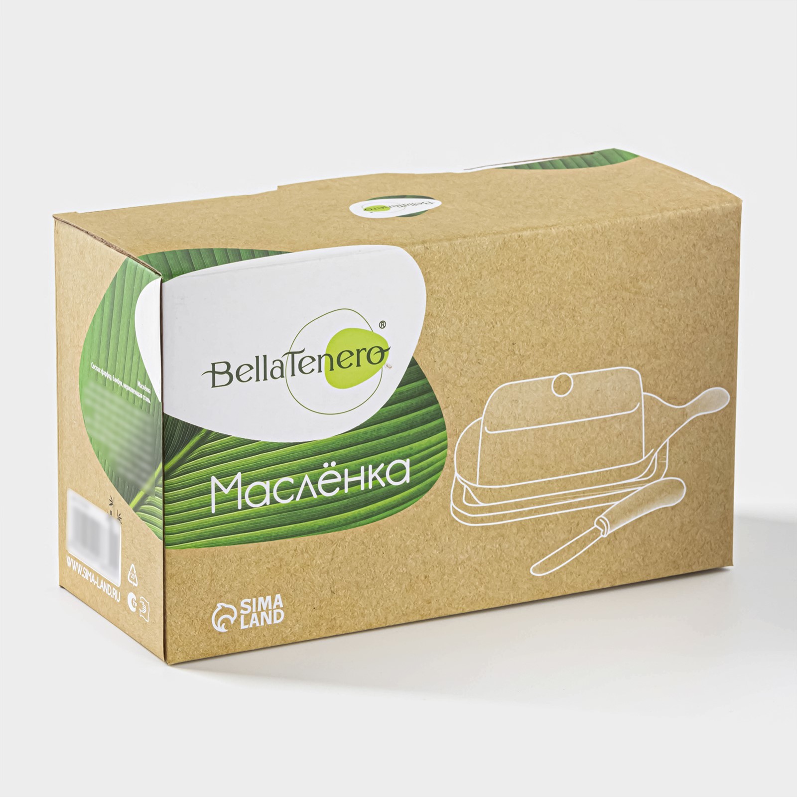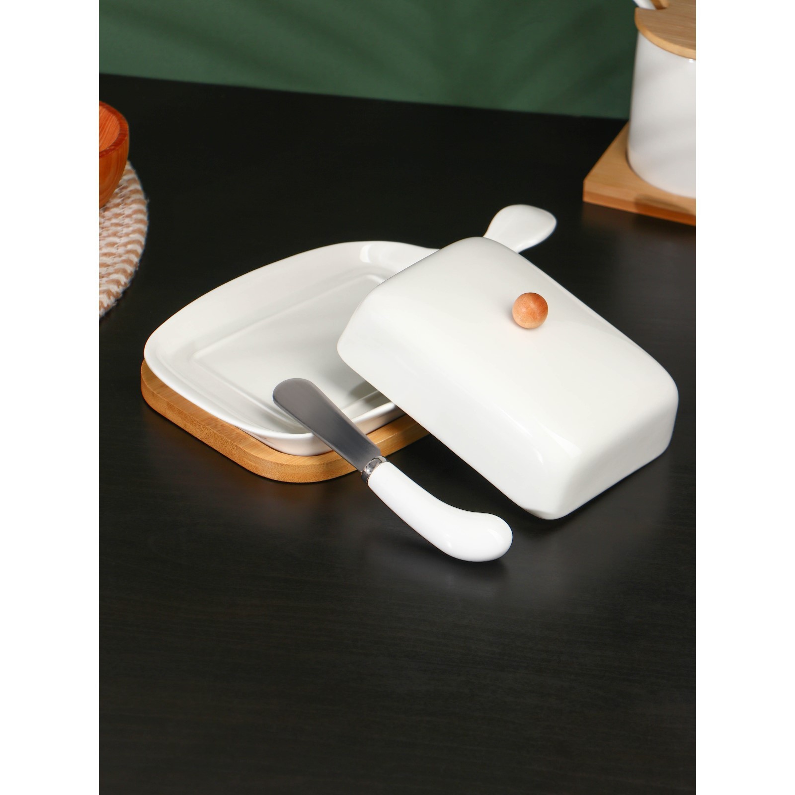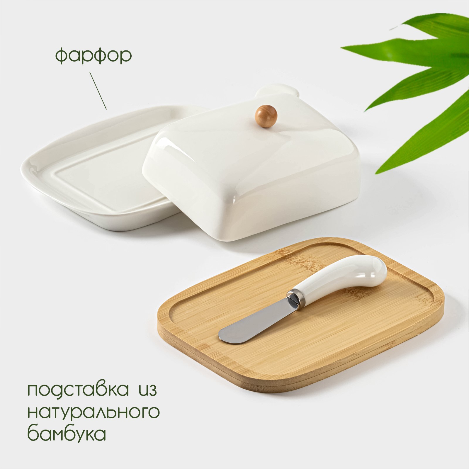 Маслёнка фарфоровая на деревянной подставке с ножом Bellatenero, 330 мл, цвет белый