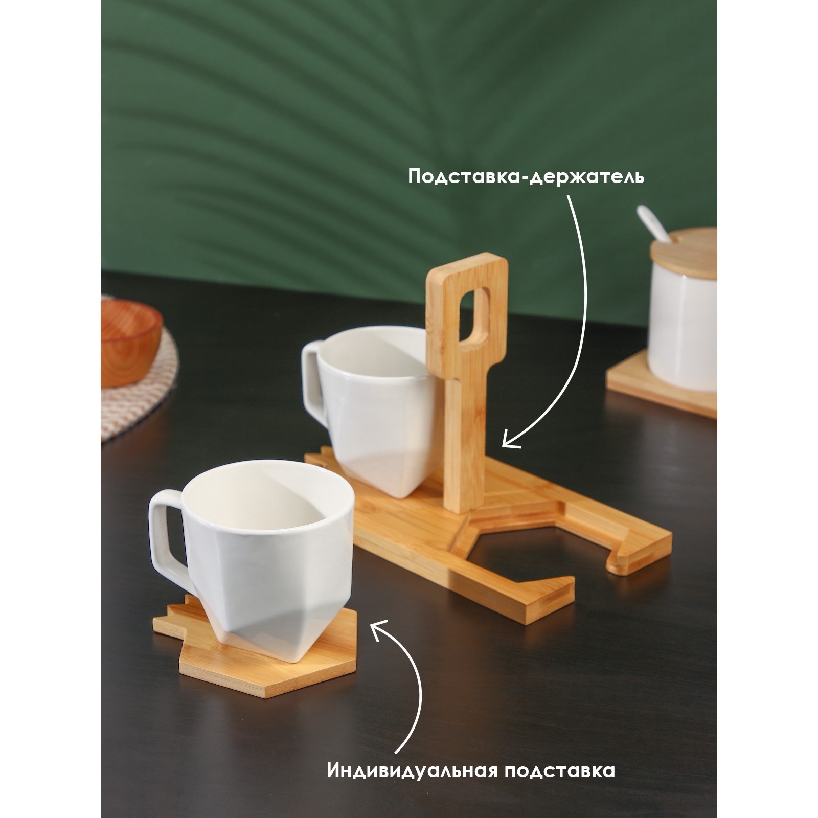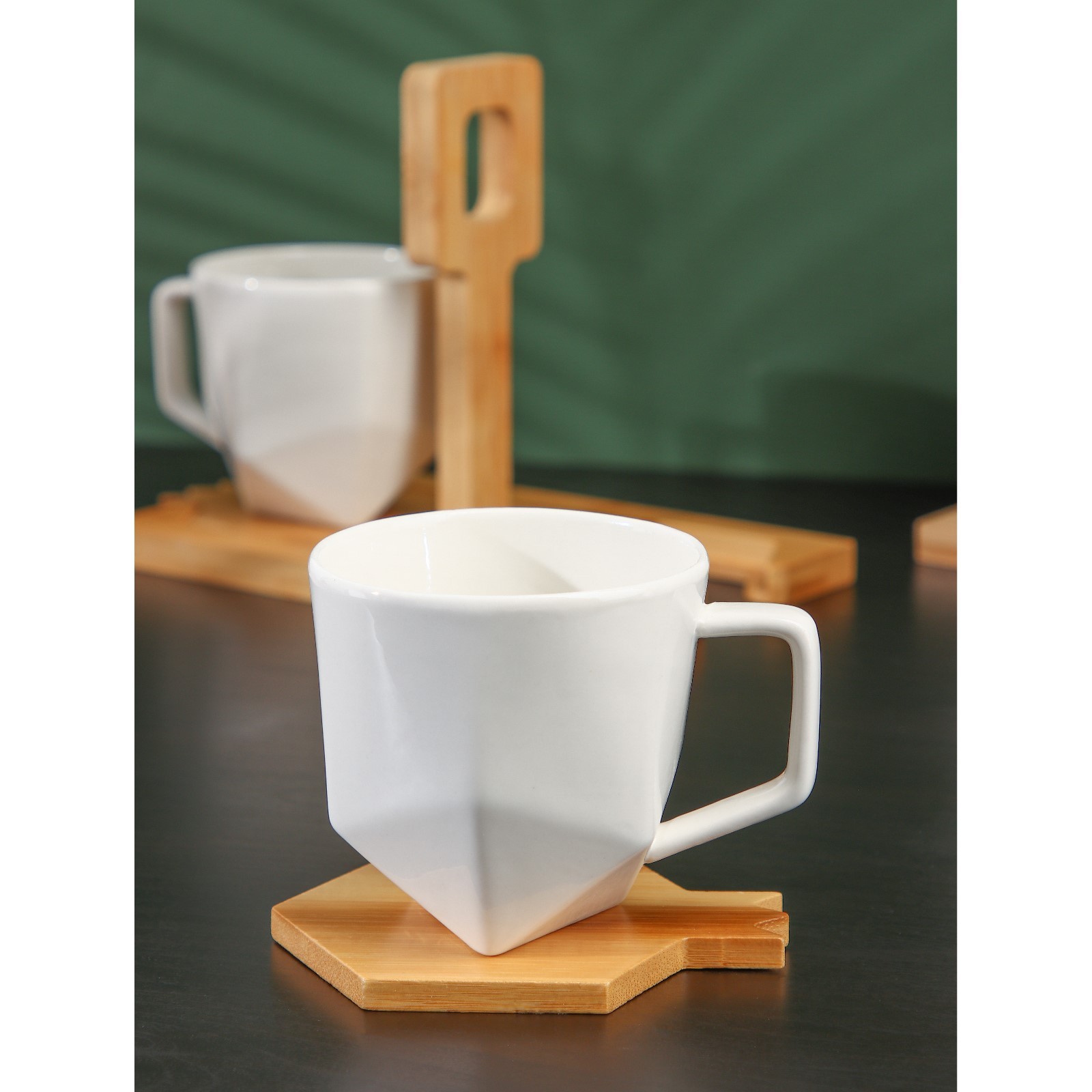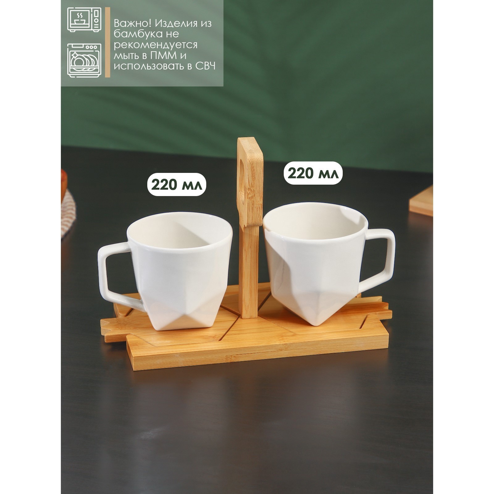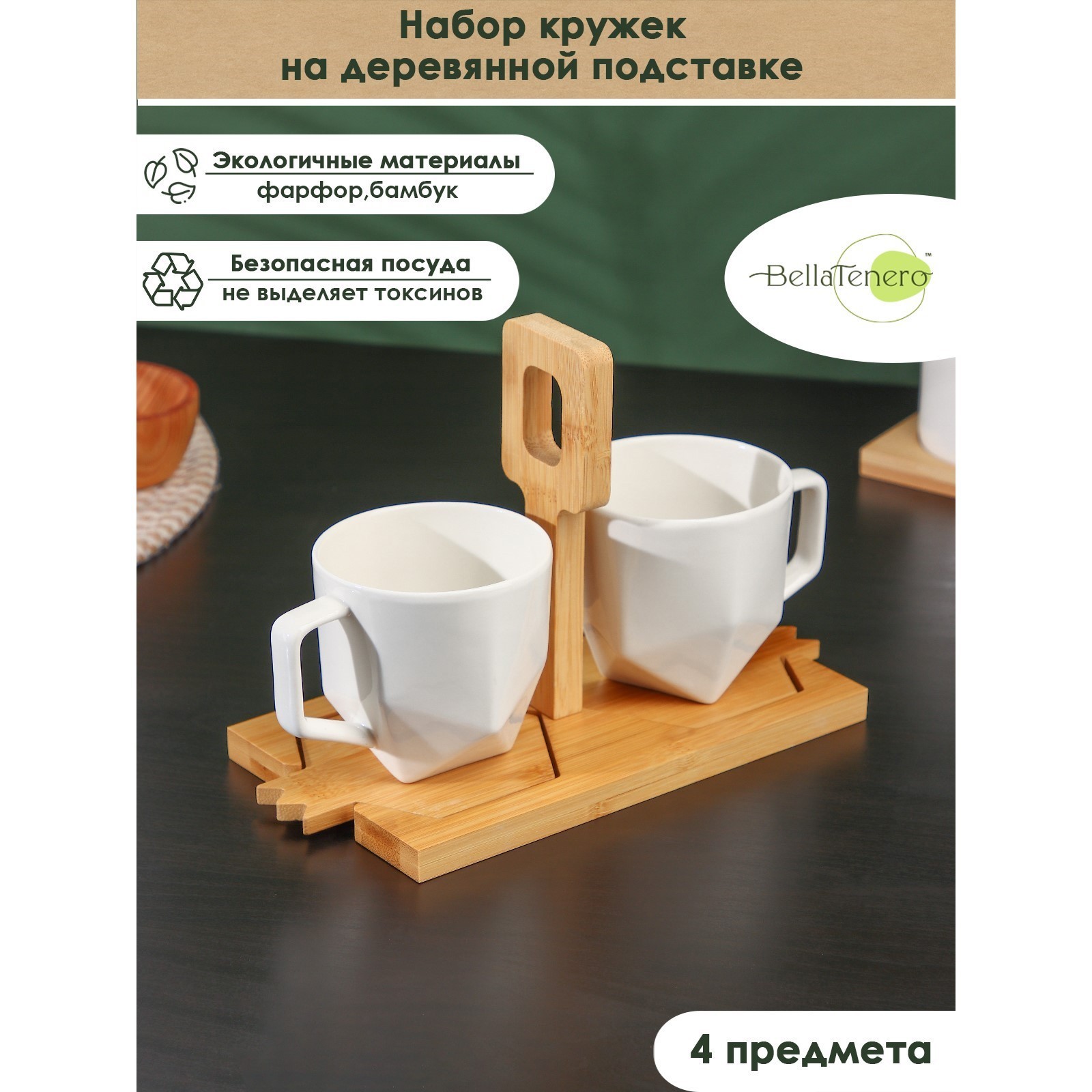 Набор фарфоровых кружек на бамбуковой подставке bellatenero, 4 предмета: 2 кружки 220 мл, 2 подставки, цвет белый. Набор кружек BellaTenero изготовлен из качественного фарфора. Посуда из фарфора отличается прочностью и надёжностью, устойчива к появлению царапин и резким перепадам температур. Благодаря оригинальному дизайну набор отлично впишется в интерьер вашей кухни, а также прекрасно подойдёт в качестве подарка. Можно использовать в посудомоечной машине. Цвет: Белый Форма: Фигурная parts count: 0 Количество персон: 2 В наборе, шт.: 4 Объём, мл: 220 tnved: 6911100000 Тематика: Однотонная Материал: Фарфор Дополнительный аксессуар: Подставка Наличие подставки: Да Можно мыть в посудомоечной машине: Да Можно использовать в СВЧ-печи: Да Текстура: С рельефом Тип: Чайная пара Особенности: На подставке Матовая поверхность: Да Запрет реализации по сегментам: 00000000485  развернуть описание ▼