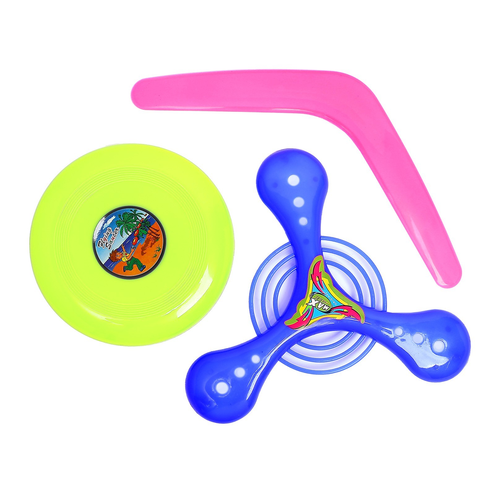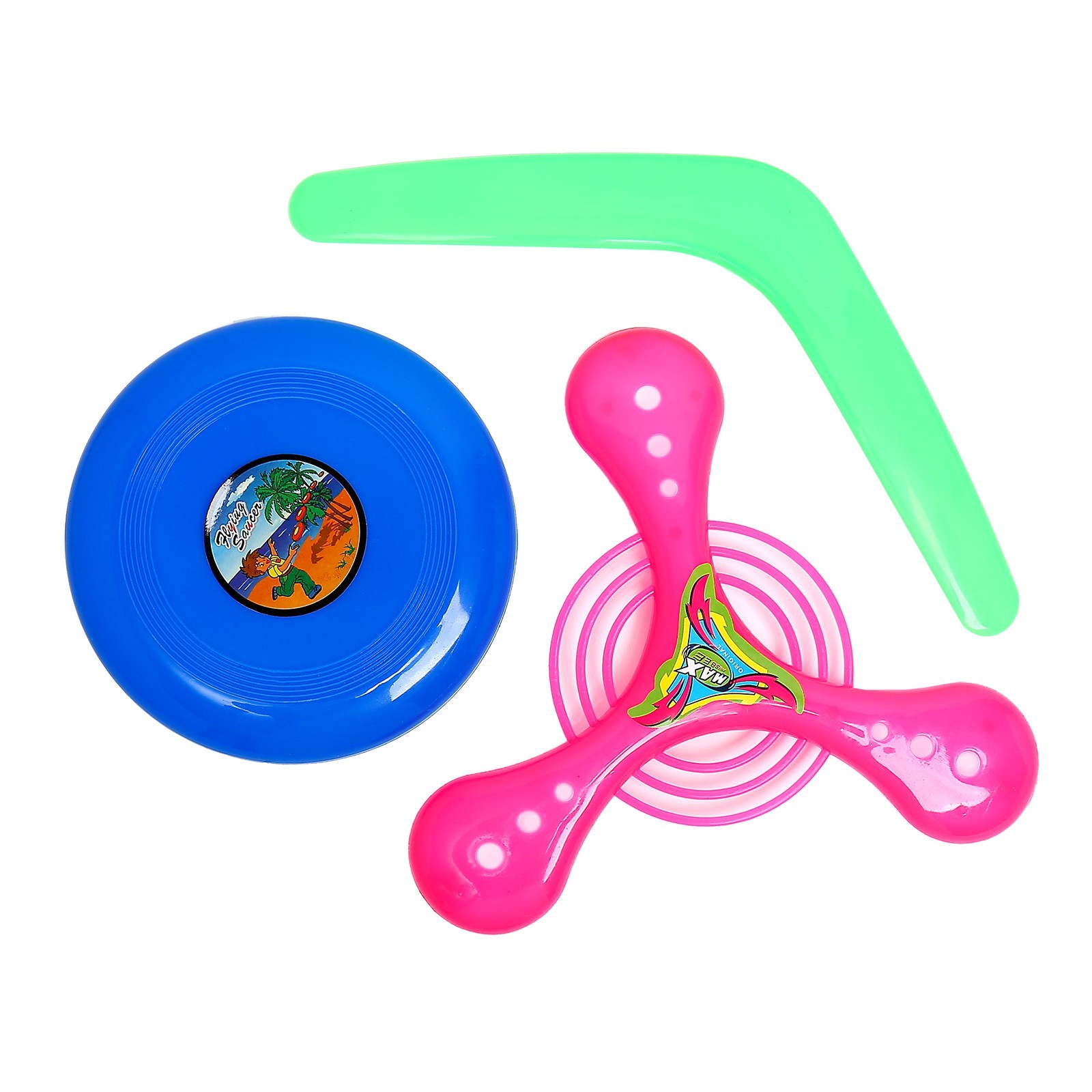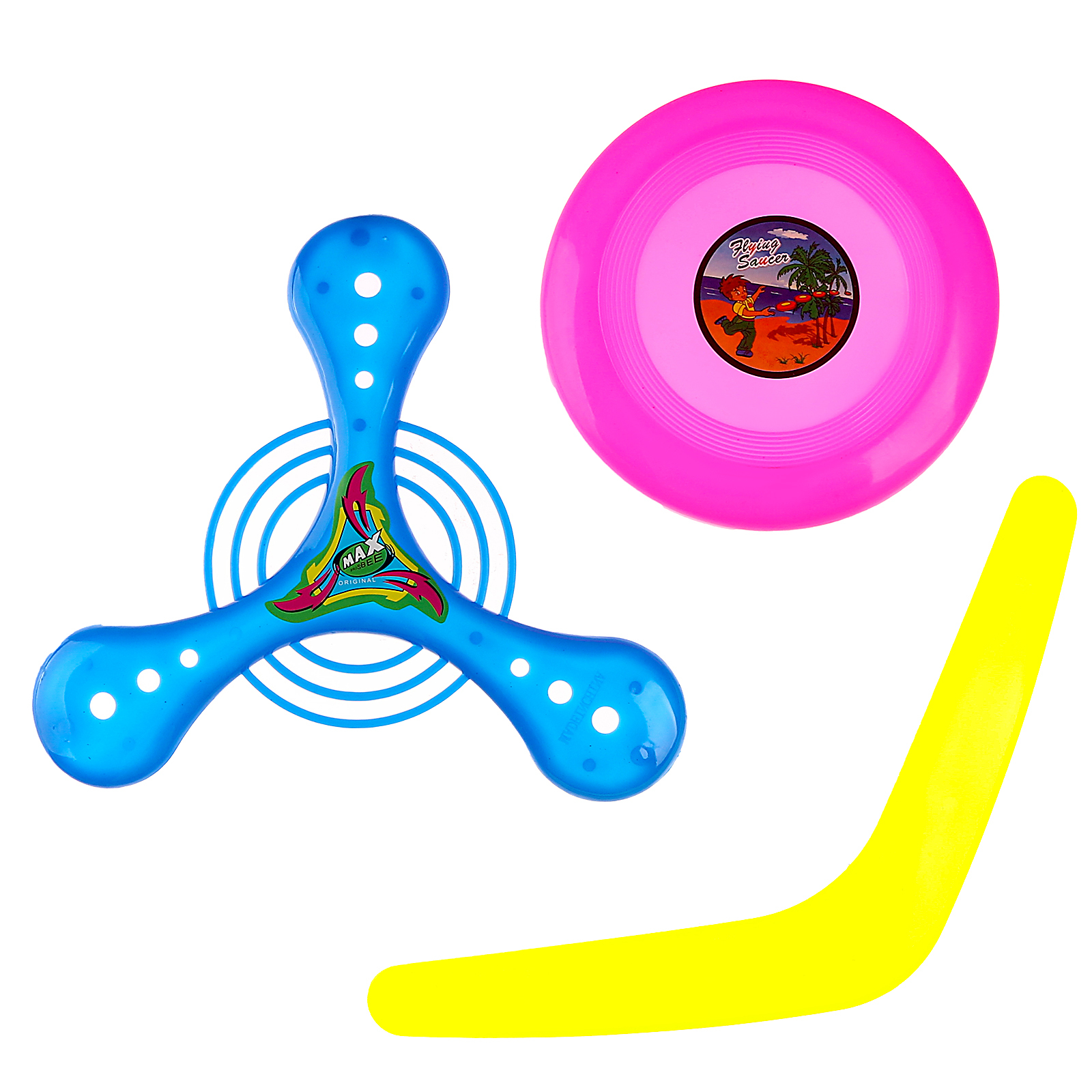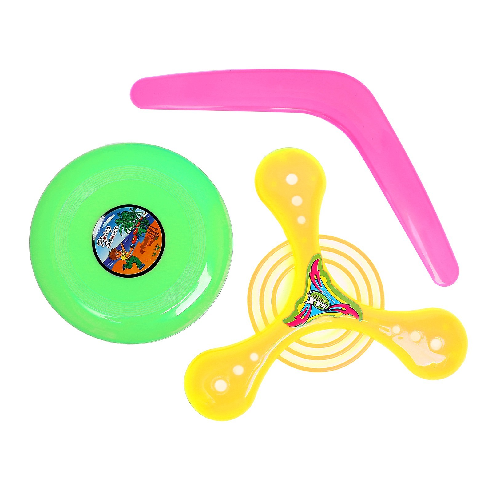 Бумеранг, набор 3 штуки, цвета микс. Набор бумерангов — это яркое и увлекательное развлечение для детей и взрослых. В набор входят четыре разноцветных бумеранга различных форм, что позволяет выбрать наиболее удобный и интересный для игры. ОсобенностиБумеранги выполнены в ярких цветах, что привлекает внимание детей и делает игру более интереснойНабор включает бумеранги различных форм, что позволяет экспериментировать и выбирать наиболее подходящий для игрыБумеранги изготовлены из мягкого пластика, что делает их безопасными для игрыИгра в бумеранг способствует развитию координации движений, ловкости и меткостиБумеранг – это отличный способ провести время на свежем воздухе и получить заряд бодростиНабор бумерангов — это отличный подарок для детей и взрослых, который подарит море положительных эмоций и станет незаменимым спутником в активных играх на свежем воздухе. Цвет: МИКС Возраст: От 3 лет Материал: Пластик Количество игроков: 1 игрок Вид игрушки: Бумеранги Вид: Бумеранг/летающая тарелка  развернуть описание ▼