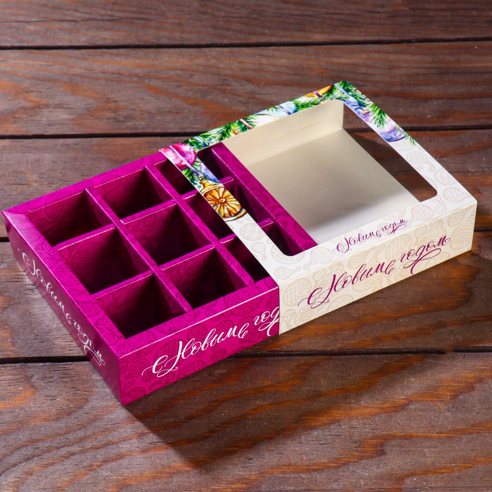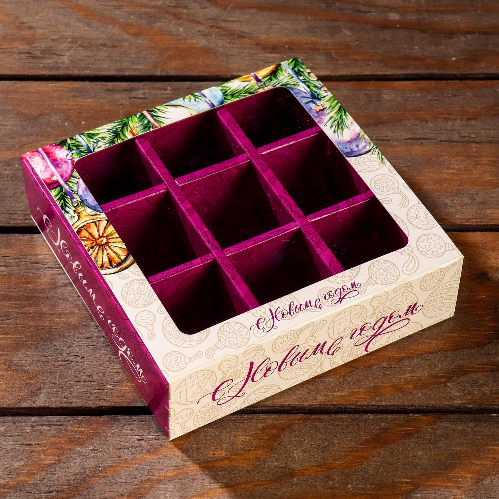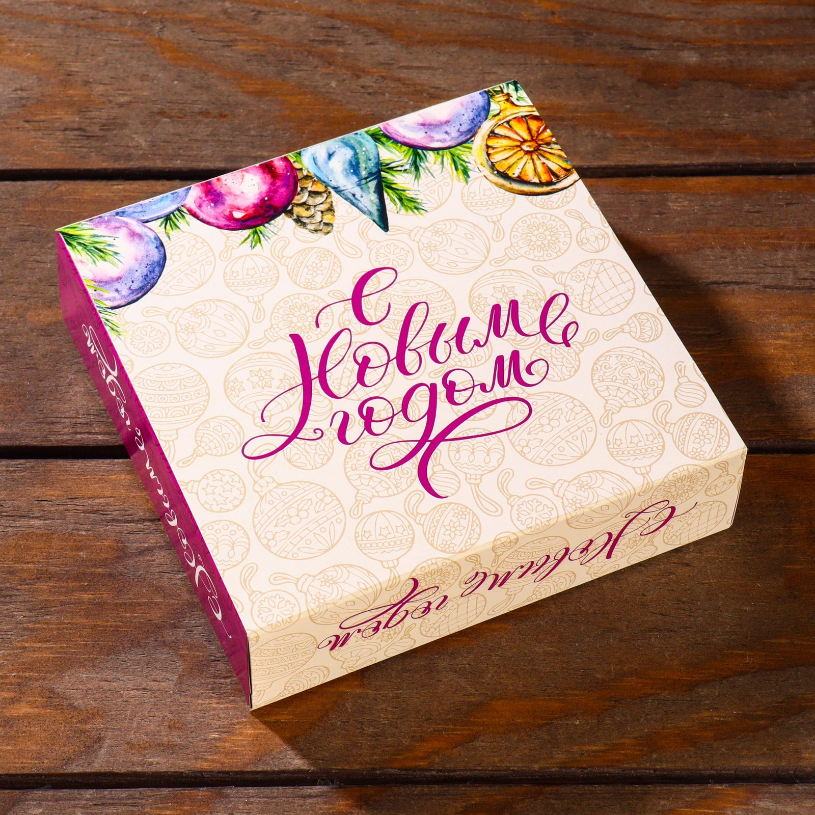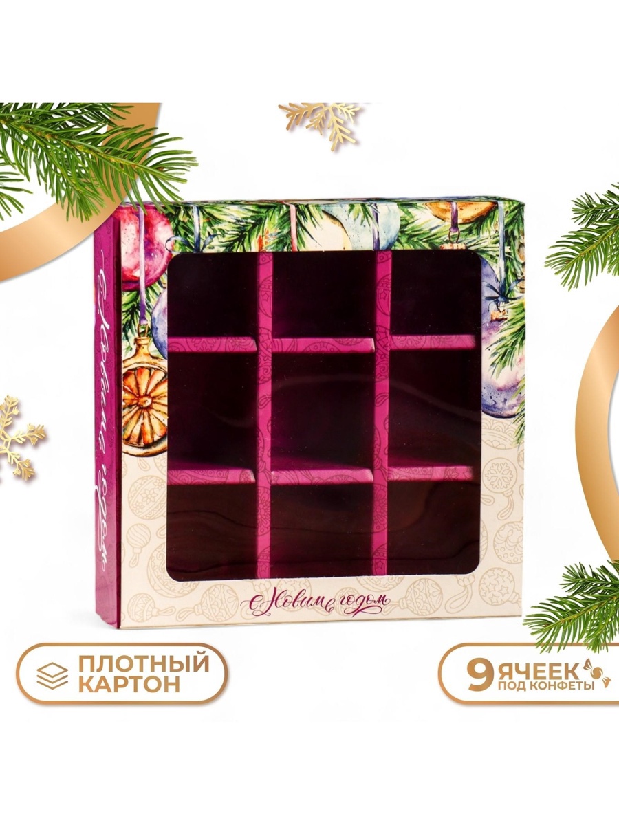 Коробка новогодняя под 9 конфет с обечайкой «с новым годом», 13.5 13.5 3.5 см. Новогоднее настроение в сладком формате! Коробка для 9 конфет «Ёлочные шары» (13,7 13,7 3,5 см) — праздничное решение для сладких подарков. Яркий дизайн с ёлочными игрушками создаёт праздничное настроение даже до вскрытия упаковки. Готовое новогоднее оформление: Красочный принт с ёлочными шарами не требует дополнительного декора. Коробка сразу готова к использованию.Удобная система хранения: 9 отдельных ячеек надёжно фиксируют конфеты. Плотный картон 300 г/м защищает содержимое от повреждений.Компактный квадратный формат: Размеры 13,7 13,7 3,5 см удобны для хранения и транспортировки. Подходят для стандартных конфет и шоколадных изделий.Универсальное применение: После использования коробка может служить шкатулкой для мелочей или основой для творческих поделок.Почему выбирают эту коробку: Идеальный вариант для новогодних подарков коллегам, учителям или друзьям. Содержит оптимальное количество конфет для небольшого, но приятного сюрприза. Стильный дизайн делает подарок завершённым без дополнительных затрат на упаковку. Вид упаковки:Для конфет|Цвет:Разноцветный|Цвет:Розовый|Форма:Квадратная|Плотность, г/м :300|Длина, см:13.7|Ширина, см:13.7|Высота, см:3.5|Количество ячеек:9|Вместимость, шт.:9|Тематика:Новогодняя|Символ года:Нет|Тематика праздника:Универсальная тематика|Тематика праздника:Новый год|Материал:Картон|Вид:Кондитерские коробки|Вид еды:Для десертов|Вид еды:Для конфет|Вид еды:Для шоколада|Вид:Складные коробки|Размер:Малый (11-17 см)|Страна:Россия  развернуть описание ▼