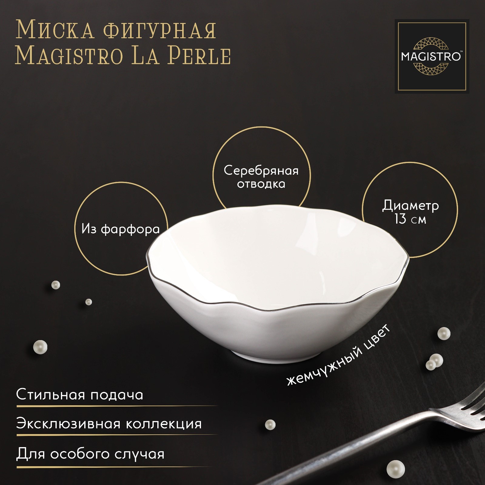 Миска фарфоровая фигурная magistro la perle, 300 мл, d=13 см, цвет белый. Посуда Magistro серии La Perle покорит лаконичным дизайном и молочной белизной натурального фарфора. Современная форма предметов подчеркнута элегантной серебряной окантовкой. Изделия из линейки La Perle можно использовать как в повседневной, так и в праздничной сервировке. Посуда станет чудесным подарком и дополнит коллекцию столового семейного фарфора. Не рекомендуется мыть изделия в посудомоечной машине. В качестве ухода нельзя применять абразивные или кислотосодержащие моющие средства, запрещено ставить в СВЧ-печь. Цвет: Белый Форма: Фигурная Диаметр, см: 13 Объём, л: 0.3 В наборе, шт.: 1 Объём, мл: 300 Тематика: Однотонная Крышка: Нет Материал: Фарфор Вид тарелки: Глубокая Можно мыть в посудомоечной машине: Нет Можно использовать в СВЧ-печи: Нет Текстура: Гладкая Особенности: С серебряной отводкой Матовая поверхность: Нет Для горячего: Да Запрет реализации по сегментам: 00000000485  развернуть описание ▼