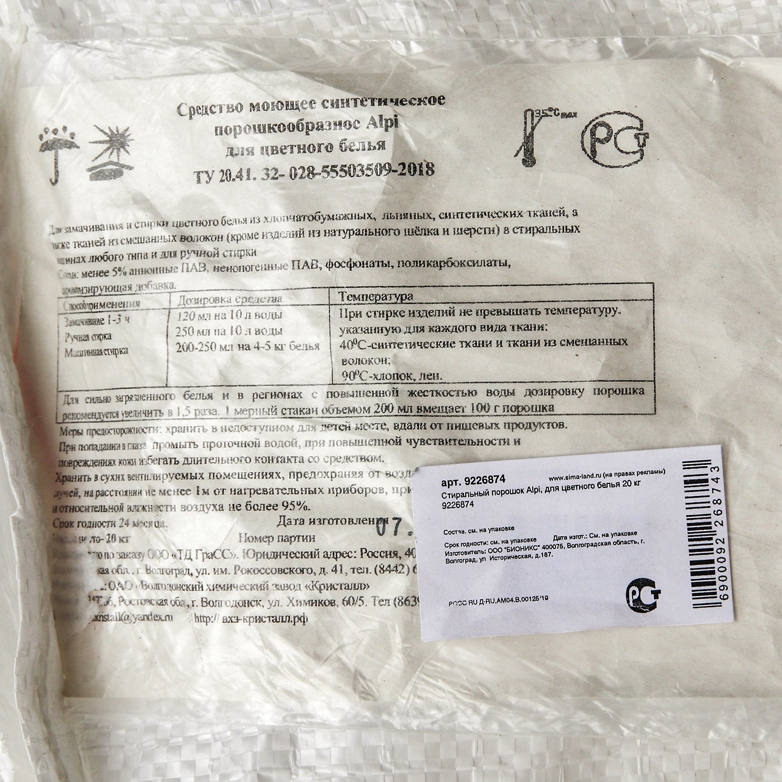 Стиральный порошок Grass Alpi, для цветного белья 20 кг