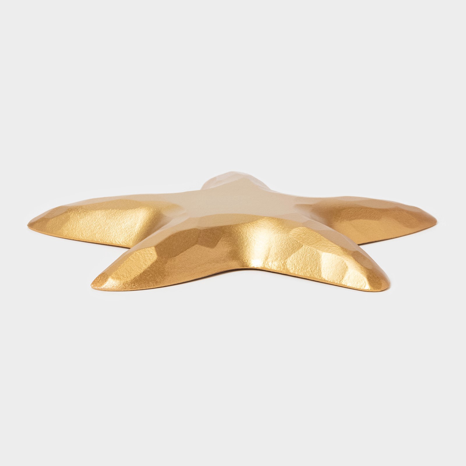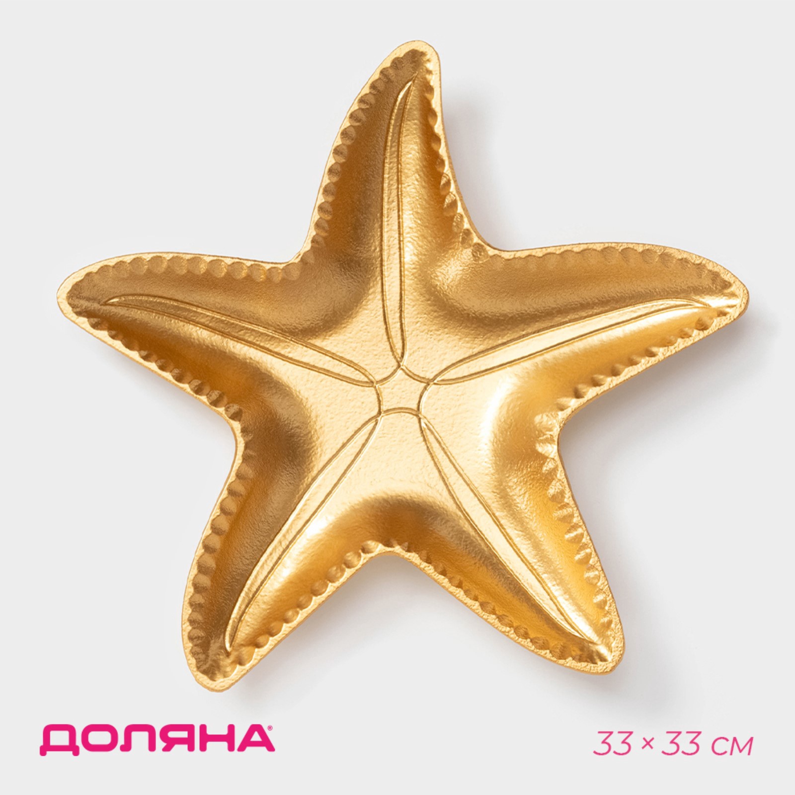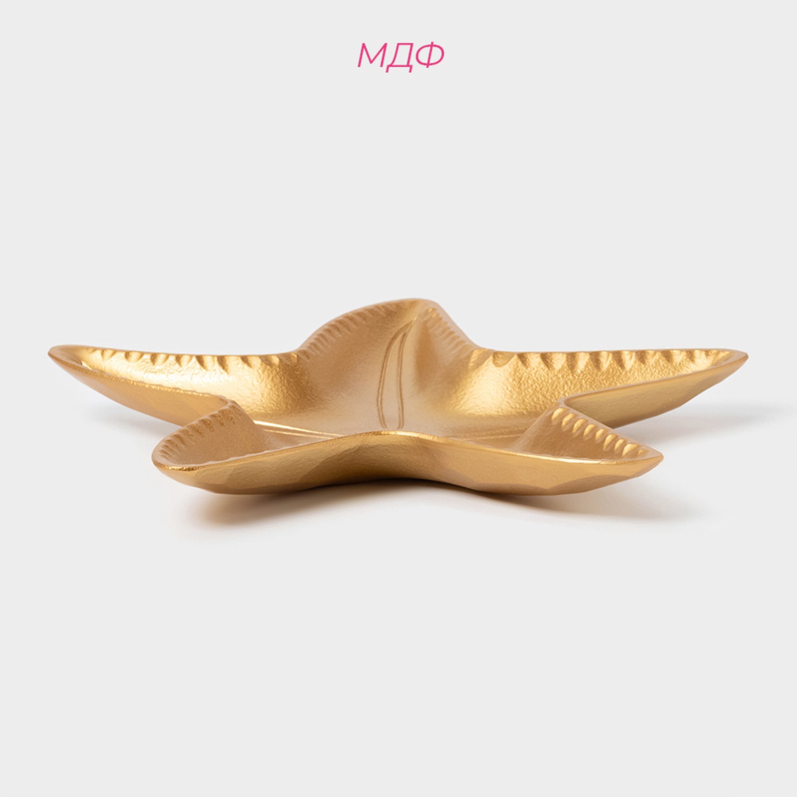 Блюдо для фруктов доляна «морская звезда», 33 33 см, золотистое. Фактурное блюдо можно использовать не только для интересной подачи сухих закусок, свежих фруктов и овощей, но и в качестве декоративного элемента в интерьере. Например, разместить изделие на открытой полке, закрепить на стене или комоде. Плоская чаша подойдёт для хранения хозяйственных мелочей и бижутерии. Особенности: блюдо выполнено из МДФ;изделие нельзя мыть в посудомоечной машине;допускается только сухая чистка.Яркая посуда станет акцентом сервировки стола, она не останется без внимания гостей дома или посетителей ресторана. Набор:Нет|Цвет:Золотистый|Тематика:Морская тематика|Рисунок:Нет|Крышка:Нет|Вид дерева:МДФ|Материал:МДФ|Можно мыть в посудомоечной машине:Нет|Текстура:С рельефом|Страна:Китай  развернуть описание ▼