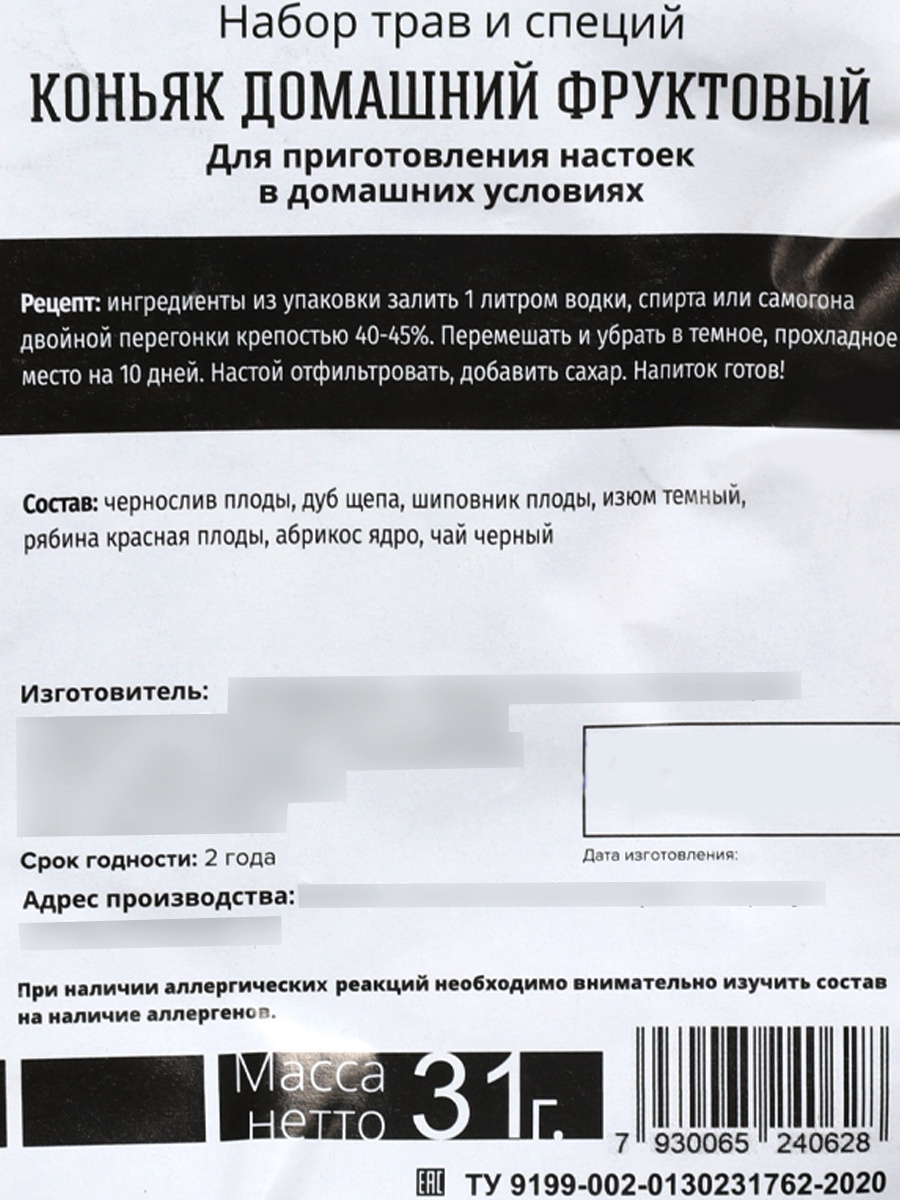 Подарочный набор для приготовления настойки «коньяк фруктовый»: набор трав и специй 31 г., штоф 500 мл., инструкция