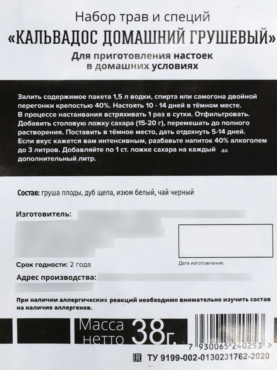 Подарочный набор для приготовления настойки «кальвадос грушевый»: набор трав и специй 38 г., штоф 500 мл., инструкция