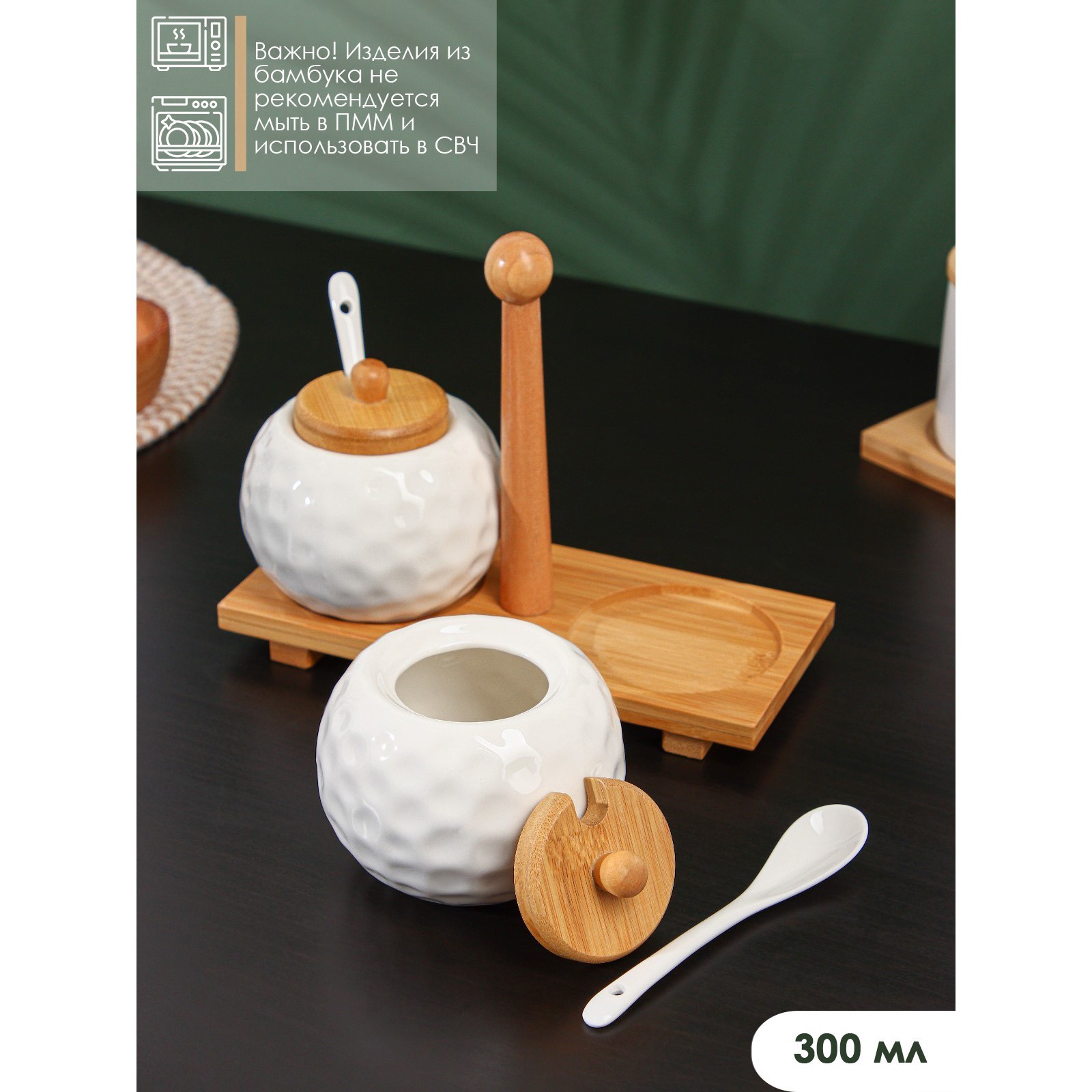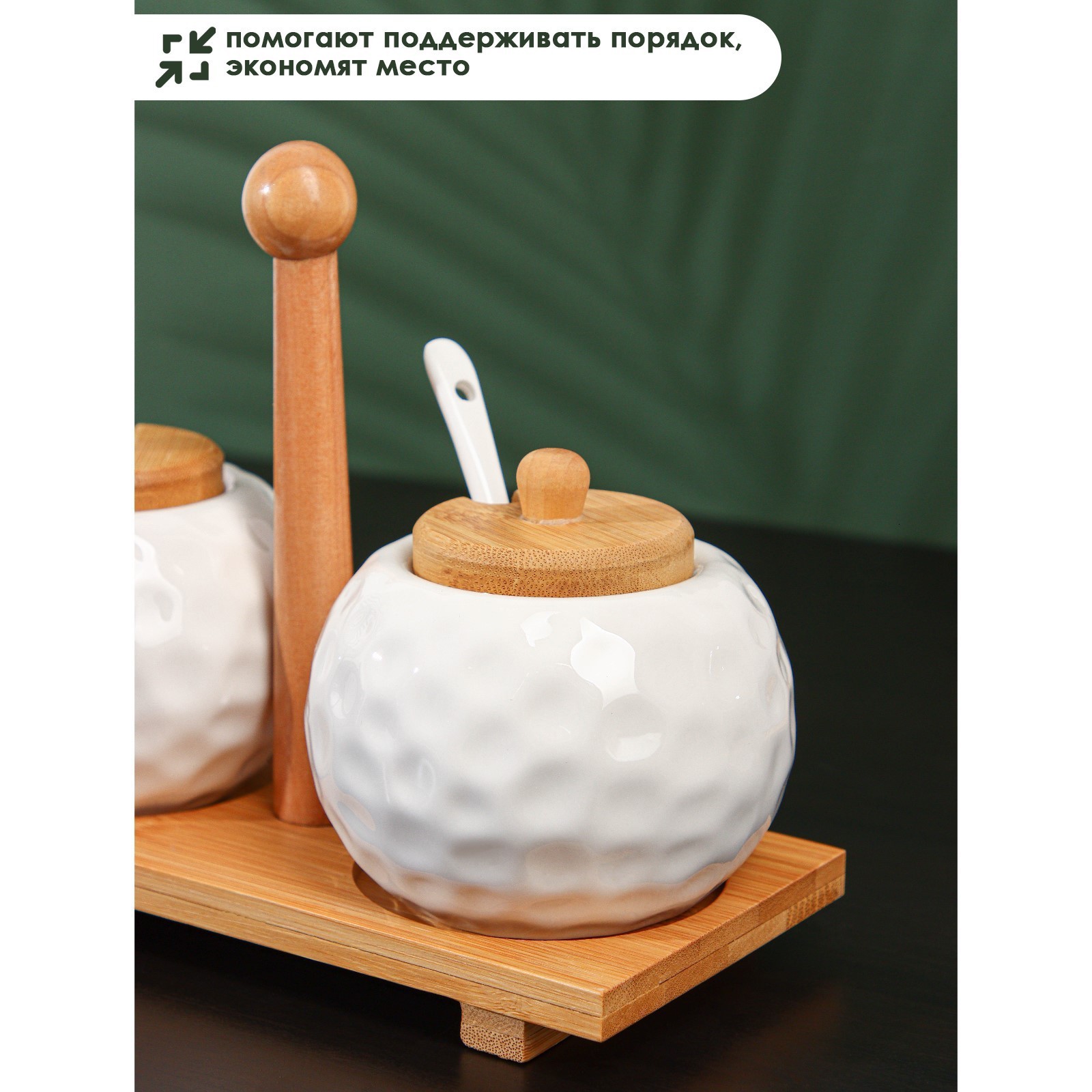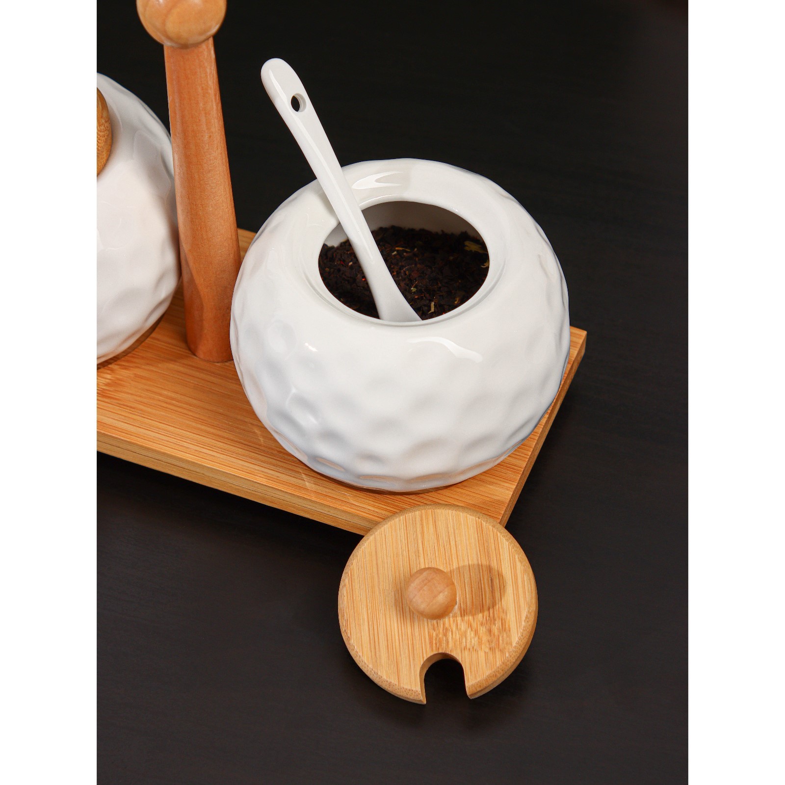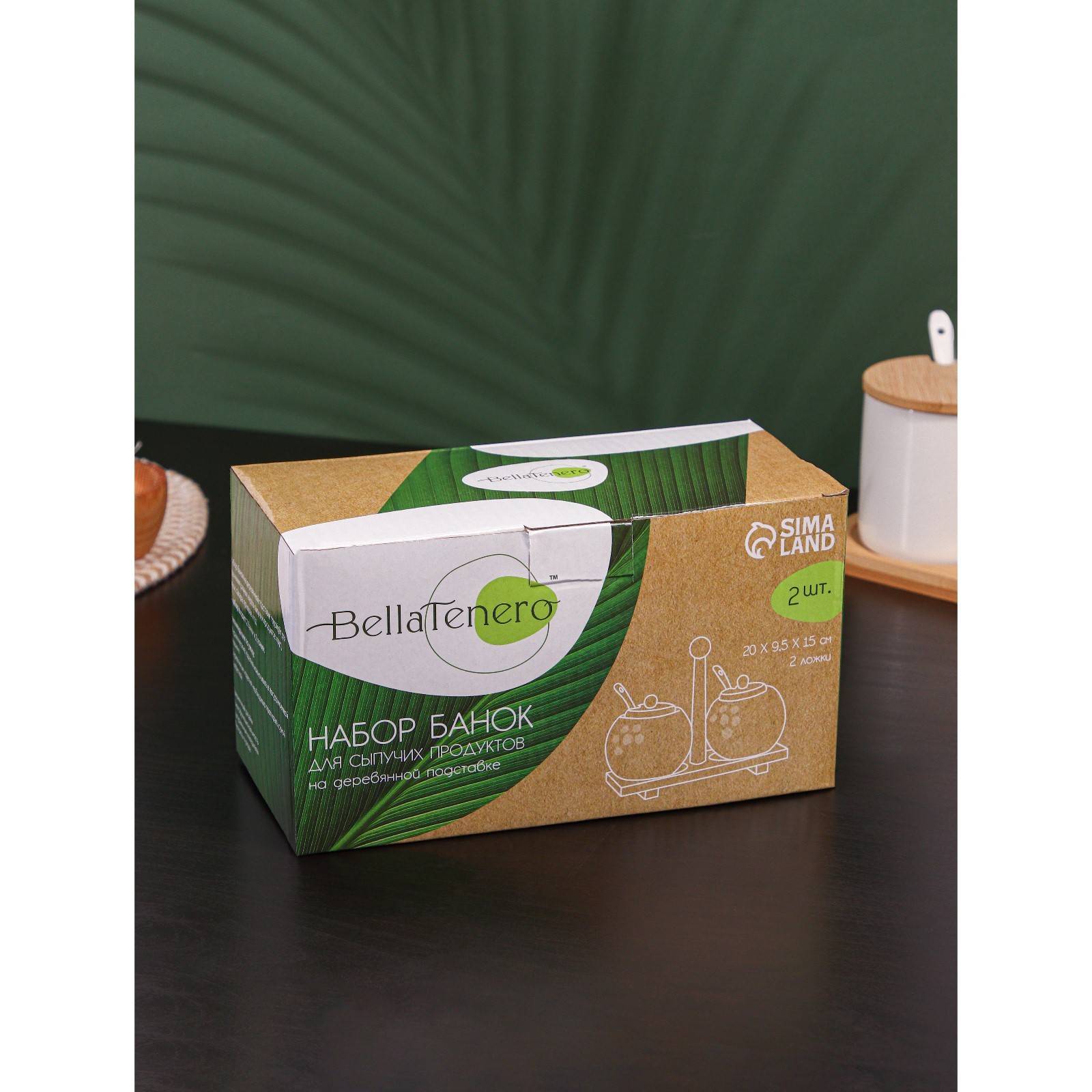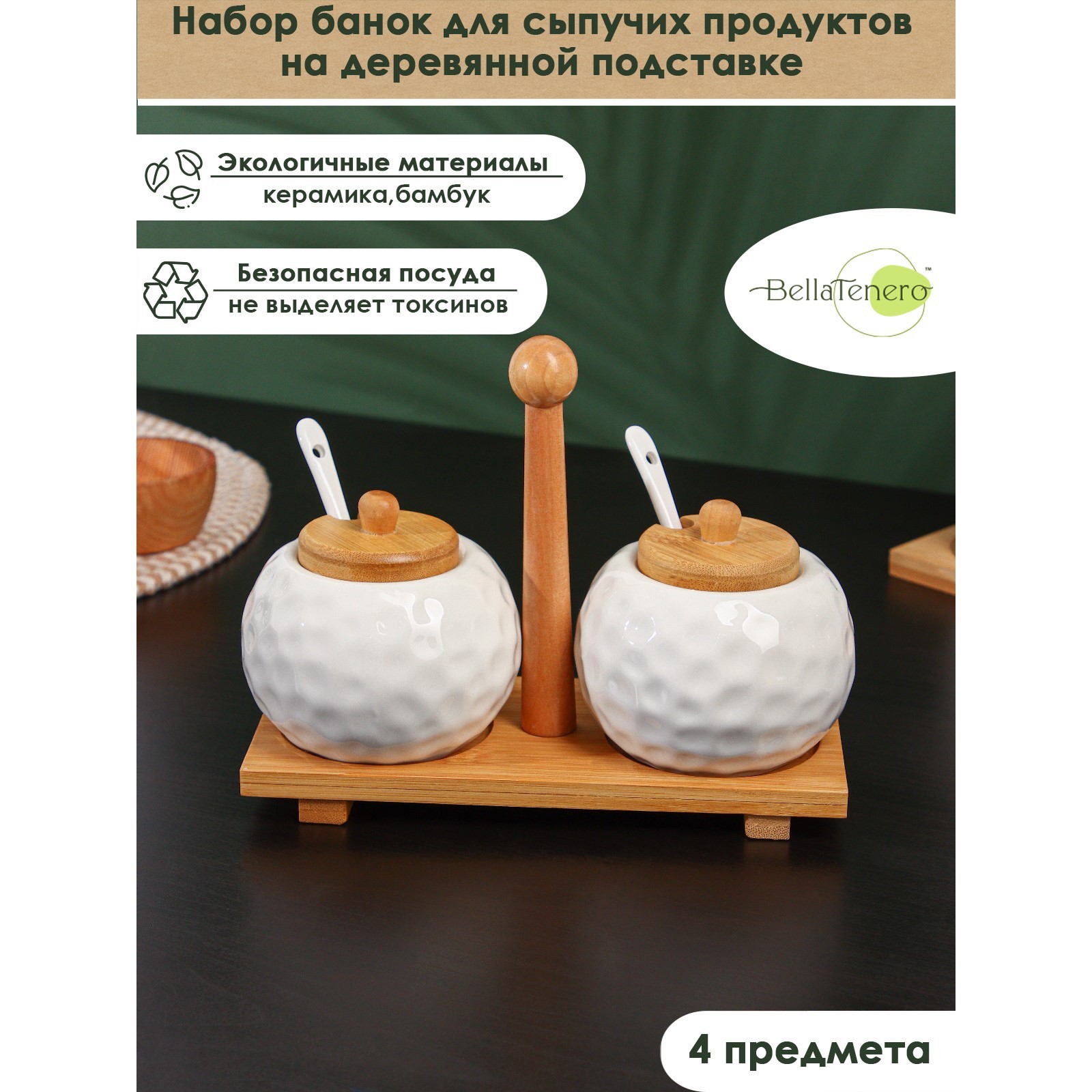 Набор банок керамических для сыпучих продуктов на деревянной подставке Bellatenero, 4 предмета: 2 банки 250 мл, 2 ложки, цвет бе