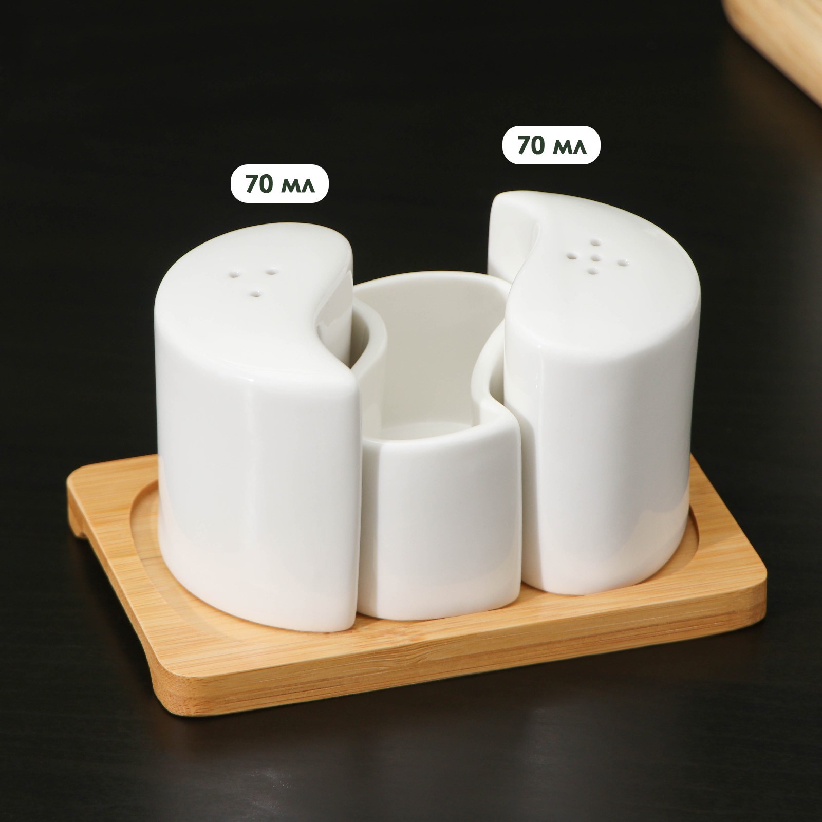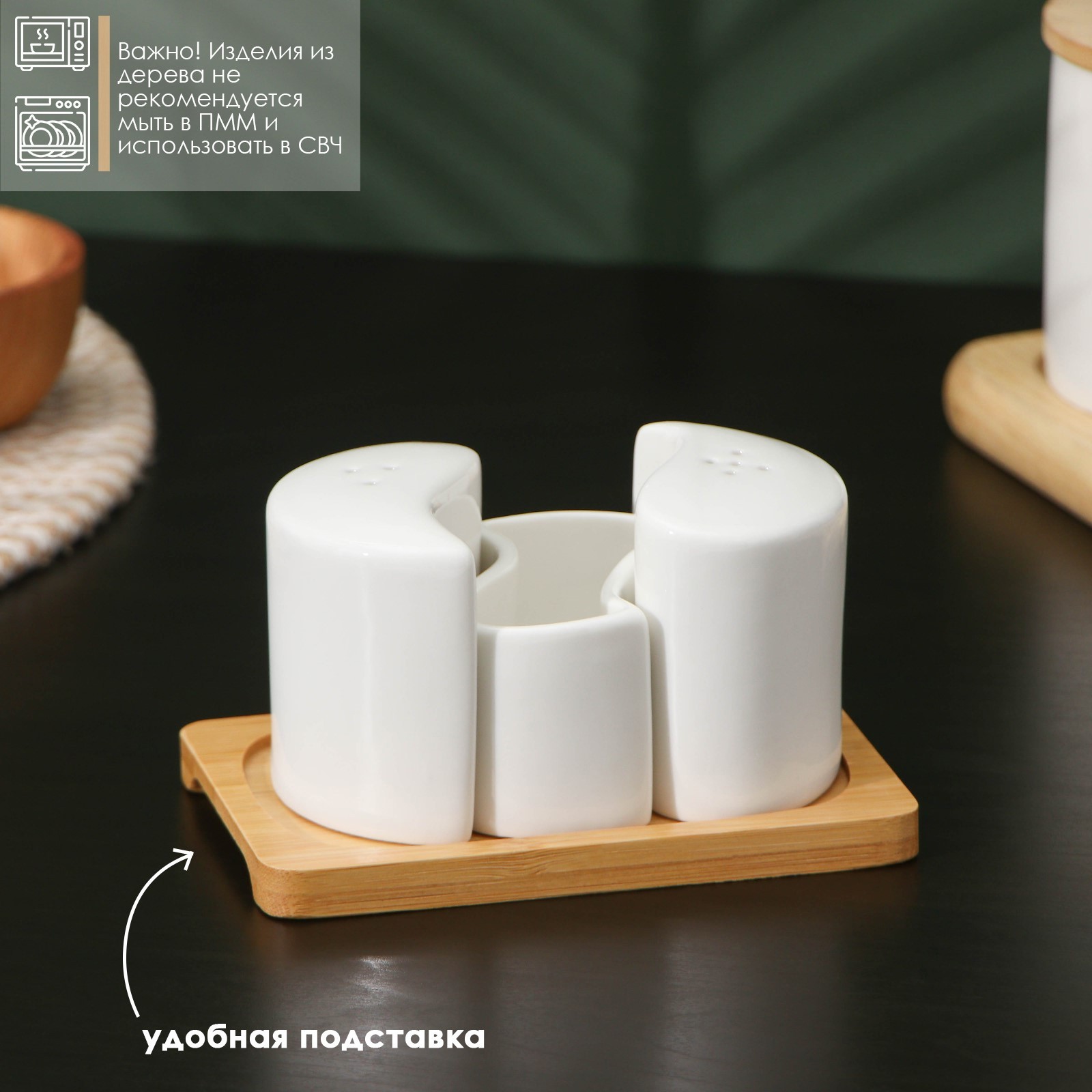Набор керамический для специй на деревянной подставке Bellatenero, 3 предмета: солонка 70 мл, перечница 70 мл, салфетница, цвет