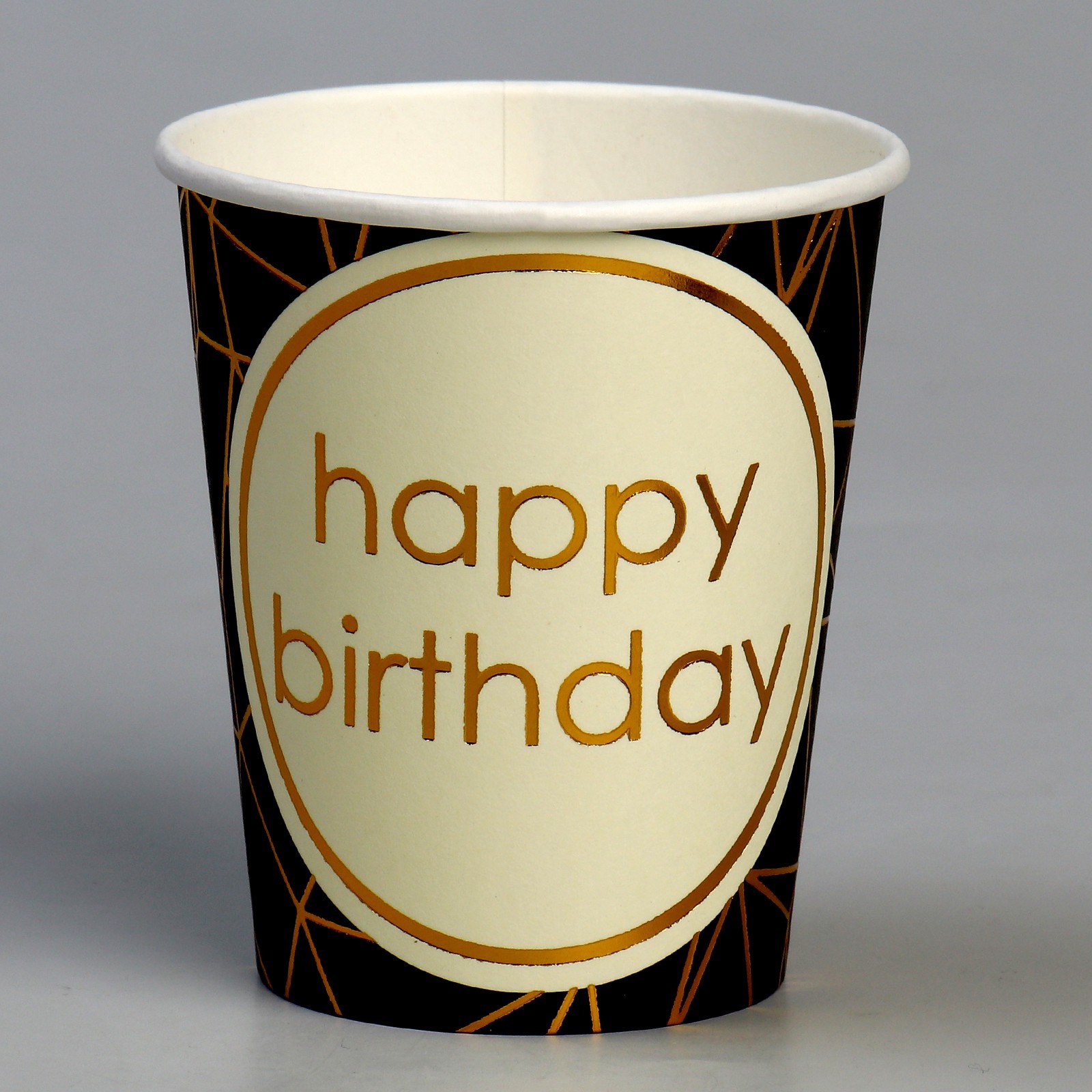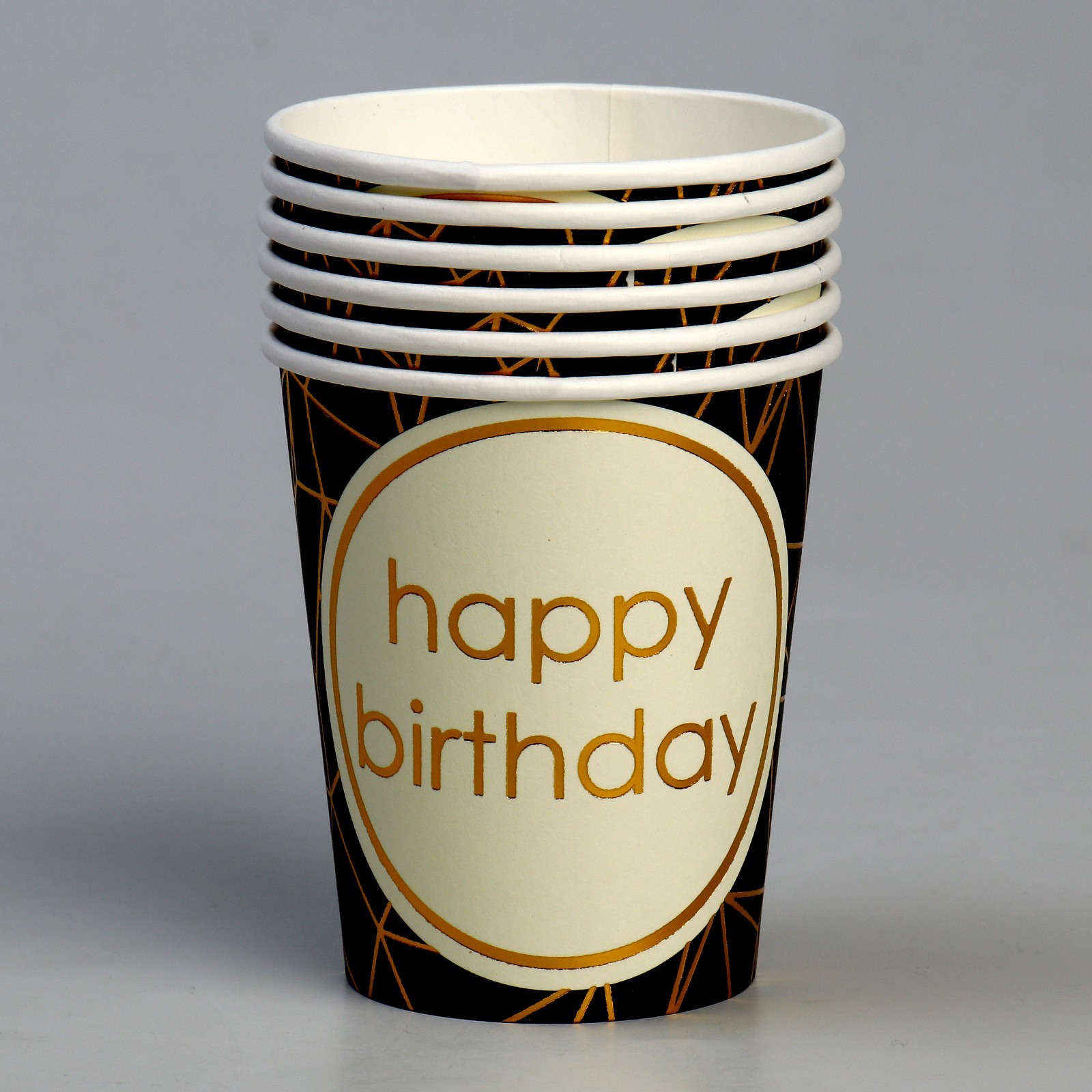 Стакан бумажный «с днём рождения», в наборе 6 штук, цвет чёрный. Посуда изготовлена из высококачественной бумаги без добавления поликарбоната, меламина и поливинилхлорида. Такие изделия безопасны, они не «раскисают» при взаимодействиями с продуктами питания. Преимущества бумажной посудыЭкологически безвредна: полностью разлагается в естественной среде. Гигиеничность и безопасность: при изготовлении используется первичный и вторичный картон с ламинацией, крафт-бумага и пищевые красители. Выдерживает высокую и низкую температуру. Сохраняет вкус еды и напитков, не выделяя вредных веществ, при нагреве. Тарелки и стаканы из бумаги приятнее на ощупь, чем аналогичная посуда из пластика. Такую посуду не надо мыть и невозможно разбить. Где применяется бумажная посуда:детские заведения и мероприятия, организация питание на свежем воздухе, точки продажи фастфуда, летние кафе и бистро, вендинг и офисы, доставка обедов. Цвет: Чёрный Диаметр, см: 7.5 Количество слоёв: 1 В наборе, шт.: 6 Объём, мл: 200 Материал: Бумага Вид: Стакан  развернуть описание ▼