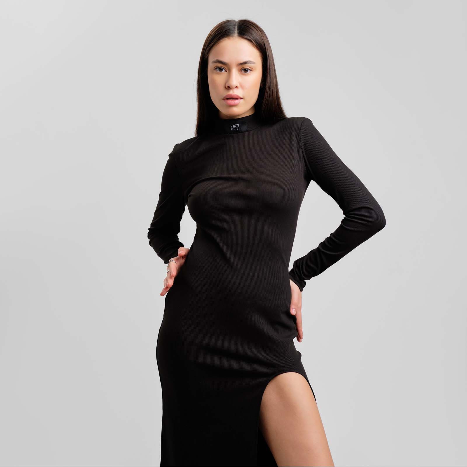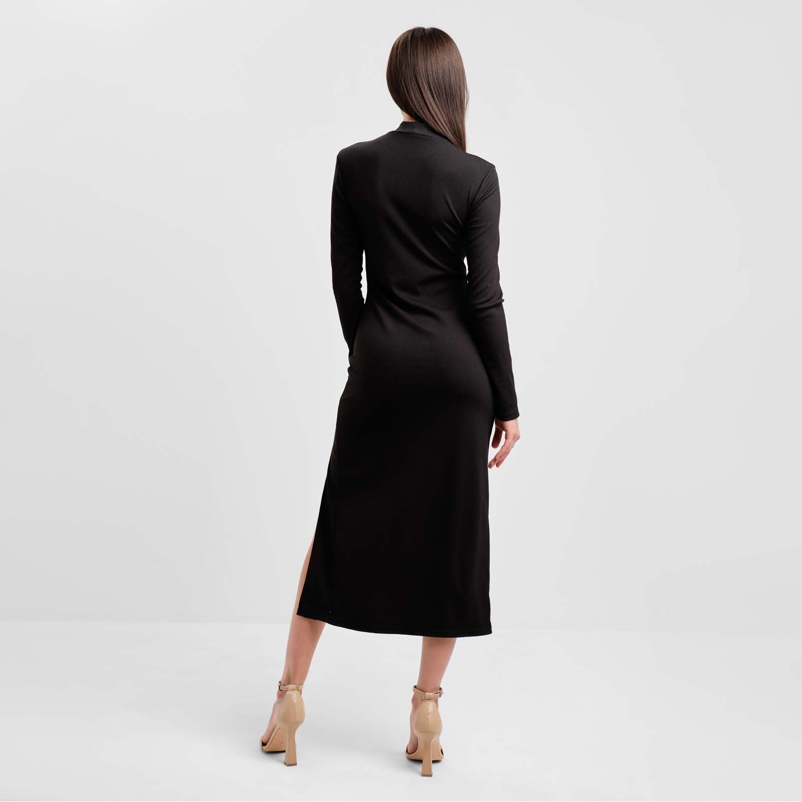 Платье с разрезом миди женское mist, размер 46, чёрное. Цвет:Чёрный|Для кого:Для женщины|Назначение:Повседневная|Ткань:Лапша|Размер:46|Рост, см:165 - 170|Длина рукава, см:63|Рост модели на фото, см:172|Сезон:Всесезонный|Вид застёжки:Без застёжки|Тематика:Однотонная|Длина рукава:Длинный|Вырез горловины:Воротник-стойка|Декоративные элементы:Разрез|Покрой:Облегающий|Тип карманов:Без карманов|Тип рукава:Втачной|Рекомендации по уходу:Стирка при 30 °С|Рекомендации по уходу:Не отбеливать|Рекомендации по уходу:Бережный режим глажки|Состав ткани:Полиэстер|Состав ткани:Эластан|Длина юбки:Миди|Обхват талии, см:72 - 76|Длина изделия по спинке, см:126.5|Обхват груди, см:92|Обхват бёдер, см:100|Параметры модели на фото (ОГ-ОТ-ОБ):80-61-91|Размер одежды:42|Страна:Россия  развернуть описание ▼