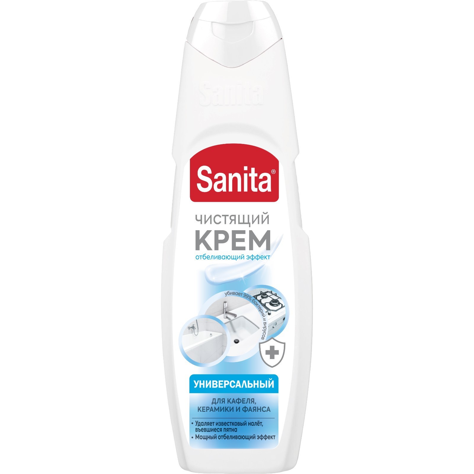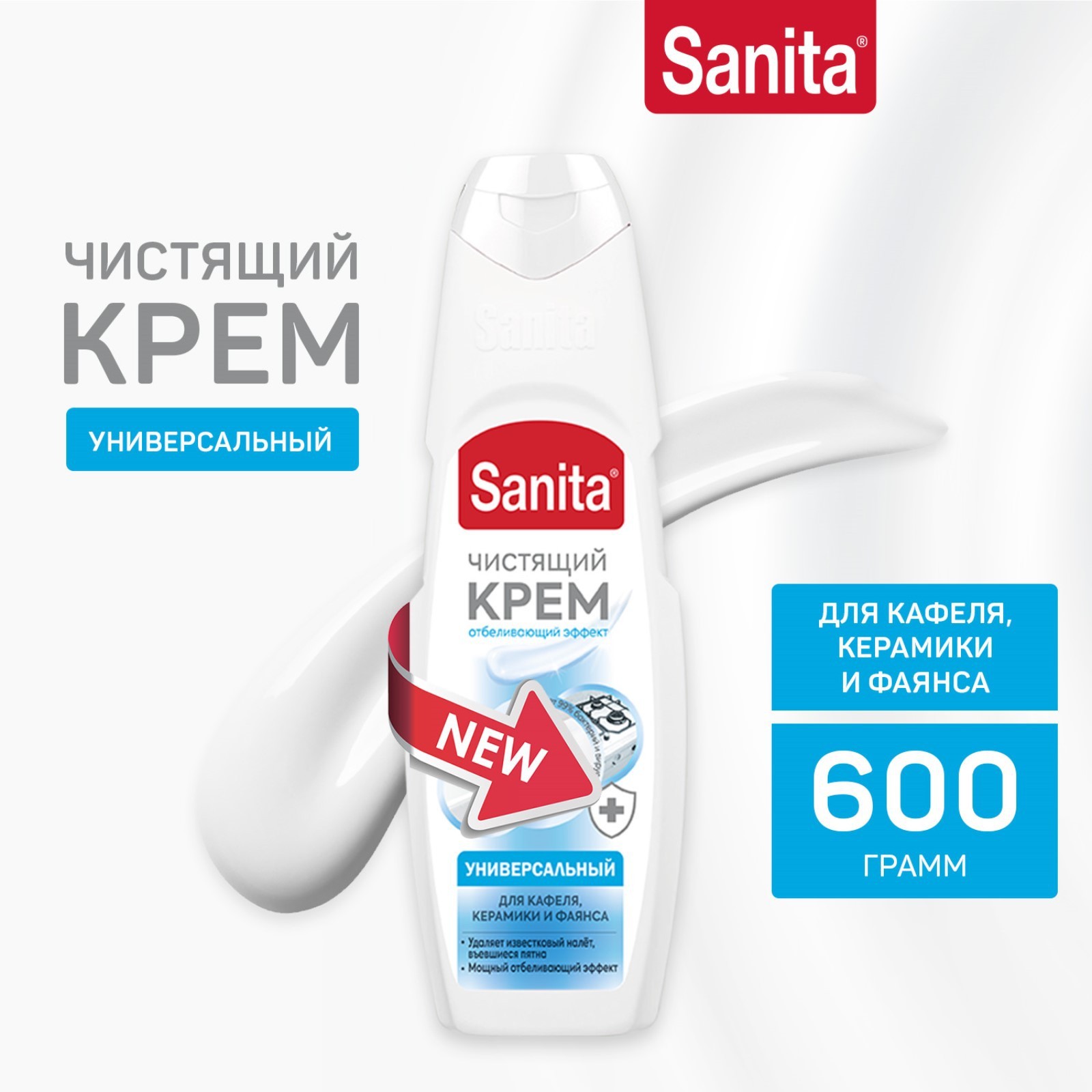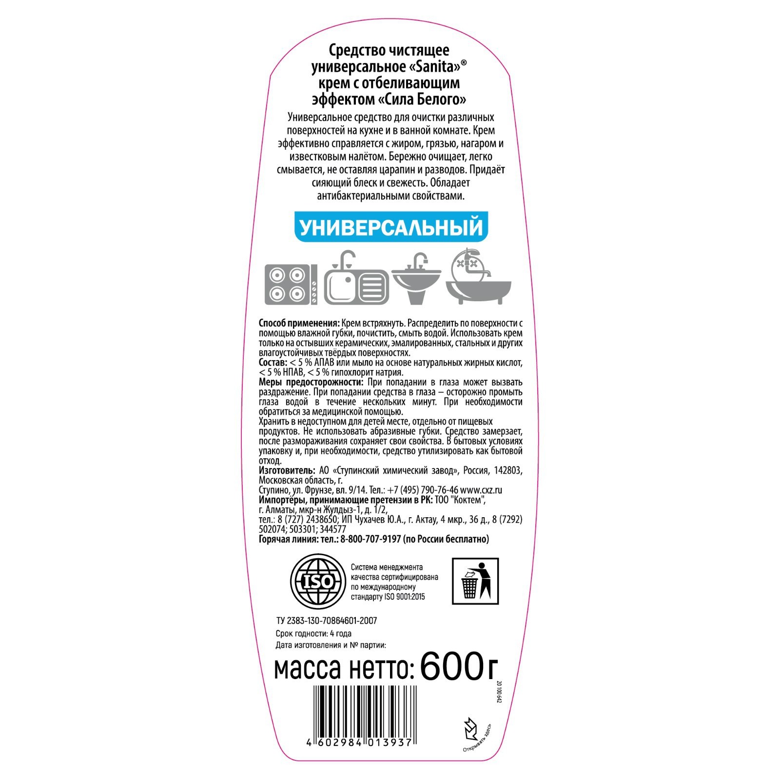 Крем универсальный sanita, с отбеливающим эффектом, 600 г. Средство чистящее универсальное, крем с отбеливающим эффектом. Универсальное средство для очистки различных поверхностей на кухне и в ванной комнате. Крем эффективно справляется с жиром, грязью, нагаром и известковым налетом. Бережно очищает, легко смывается, не оставляя царапин и разводов. Придает сияющий блеск и свежесть. Обладает антибактериальными свойствами. Способ применения: крем встряхнуть. Распределить по поверхности с помощью влажной губки, почистить, смыть водой. Использовать крем только на остывших керамических, эмалированных, стальных и других влагоустойчивых твердых поверхностях. Меры предосторожности: при попадании в глаза может вызвать раздражение. При попадании в глаза – осторожно промыть водой в течении нескольких минут. При необходимости обратиться к врачу. Рекомендуется использовать резиновые перчатки. Не использовать аброзивные губки. Перед использованием проверить стойкость покрытий на незаметном месте. Хранить в плотно закрытой упаковке в недоступном для детей месте, вдали от пищевых продуктов. Средство замерзает, после размораживания сохраняет свои свойства. Срок годности 12 месяцев с даты изготовления. Состав: 5% апав, или мыло на основе натуральных жирных кислот, 5% нпав, 5% гипохлорид натрия Объём, мл: 600 Температурное ограничение: Нет  развернуть описание ▼