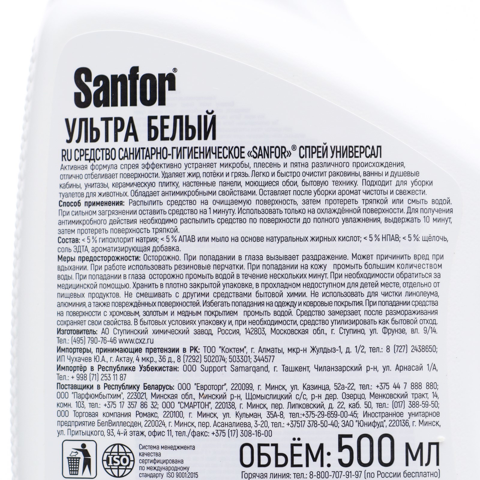 Универсальный спрей sanfor "ультра белый", 500 мл.   Санитарно-гигиенический спрей. Активная формула спрея эффективно устраняет микробы, плесень и пятна различного происхождения, отлично отбеливает поверхности. Удаляет жир, потёки и грязь. Легко и быстро очистит раковины, ванны и душевые кабины, унитазы, керамическую плитку, настенные панели, моющиеся технику. Подходит для уборки туалетов для животных. Обладает антимикробными свойствами. Оставляет после уборки аромат чистоты и свежести.  Способ применения: распылить средство на очищаемую поверхность, затем протереть тряпкой или смыть водой. При сильном загрязнении оставить средство на 1 минуту. Использовать только на охлажденной поверхности. Для получения антимикробного действия необходимо распылить средство по поверхности до полного увлажнения, выдержать 10 минут, затем протереть поверхность тряпкой.  Меры предосторожности: при попадании в глаза вызывает раздражение. Может причинить вред при вдыхании. При работе использовать резиновые перчатки. При попадании на кожу - промыть большим количеством воды. При попадании в глаза - осторожно промыть водой в течение нескольких минут. При необходимости обратиться за медицинской помощью. Хранить в плотно закрытой упаковке в недоступном н ном для детей месте, отдельно от пищевых продуктов. Не смешивать с другими и продуктами химии. Избегать попадания на одежду и ковровые покрытия. При попадании средства на поверхности с хромовым, золотым и медным покрытием промыть водой. Средство замерзает, после размораживания сохраняет свои свойства. Срок годности 24 месяца с даты производства.  Состав: <5% гипохлорид натрия, 5% апав или на основе натуральных жирных кислот; <5 % НПАВ; 5% щёлочь, соль ароматизирующая добавка.  Объём, мл: 500 Температурное ограничение: Нет  развернуть описание ▼