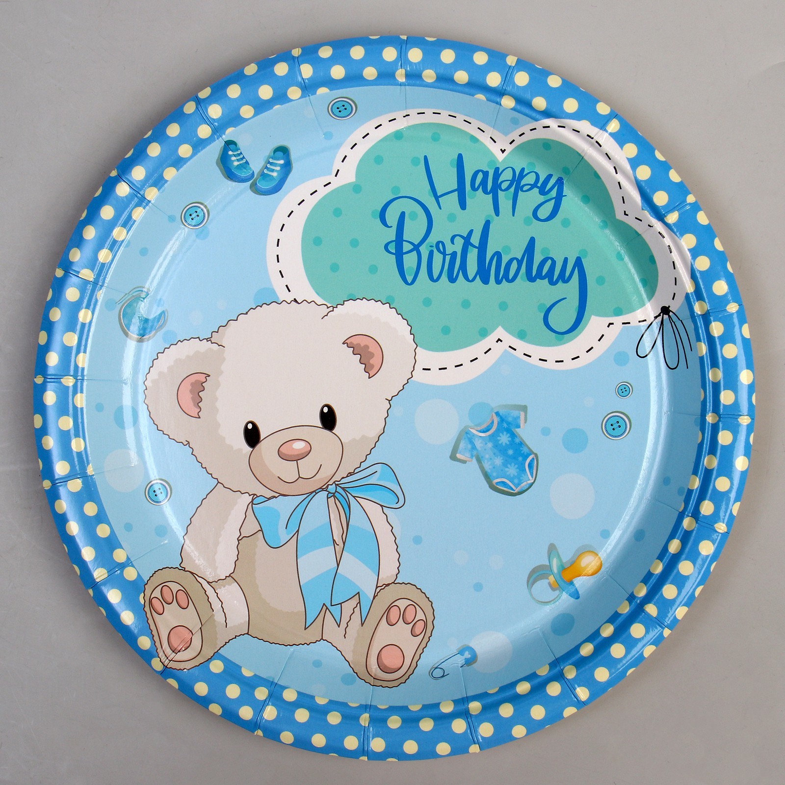 Тарелка бумажная «с днём рождения!», мишка, 18 см, в наборе 6 штук, голубая