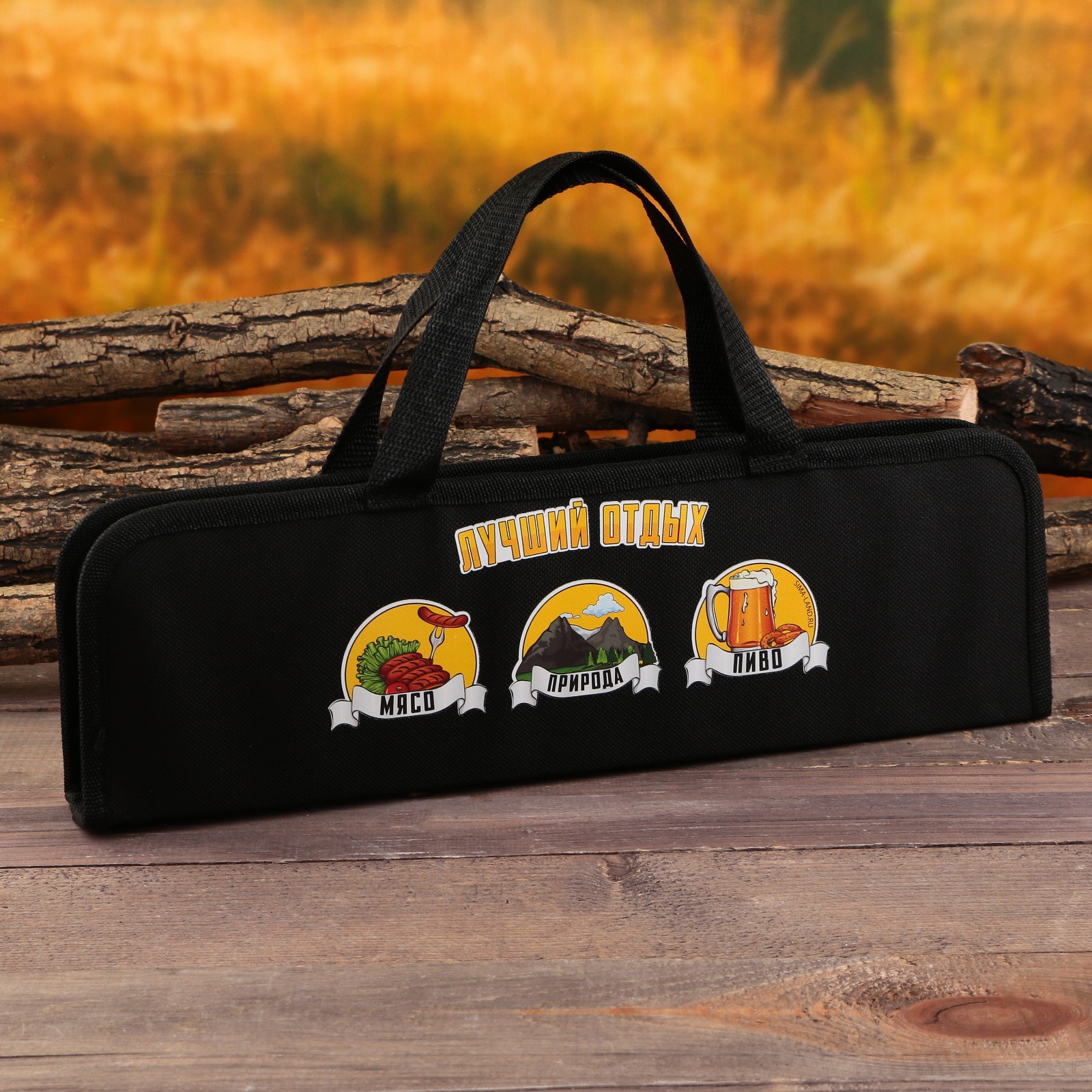Высокое качество материалов: все предметы изготовлены из прочной нержавеющей стали, что обеспечивает долговечность и устойчивость к коррозии.Удобство использования: эргономичный дизайн аксессуаров позволяет легко и быстро готовить еду на гриле, не повреждая её.Компактность и портативность: набор легко помещается в багажник автомобиля или сумку, что делает его идеальным для путешествий и кемпинга.Универсальность: подходит для разных видов грилей и барбекю, а также может использоваться дома на кухне.Отличный подарок: этот набор станет отличным подарком для друзей и родственников, которые любят проводить время на свежем воздухе и наслаждаться вкусной едой, приготовленной на гриле.Набор:Да|Цвет:Чёрный|В наборе, шт.:5|Вид упаковки:Текстильный пенал|Рисунок:Да|Материал:Полиэстер|Материал:Нержавеющая сталь|Материал:Силикон|Назначение:Универсальный|Комплектация:Посуда для приготовления пищи|Комплектация:Кухонные принадлежности|Страна:Китай