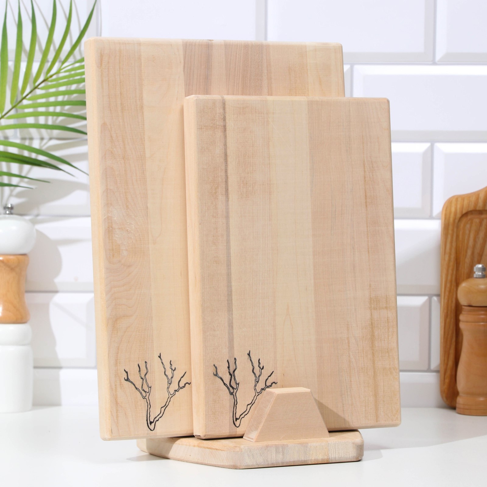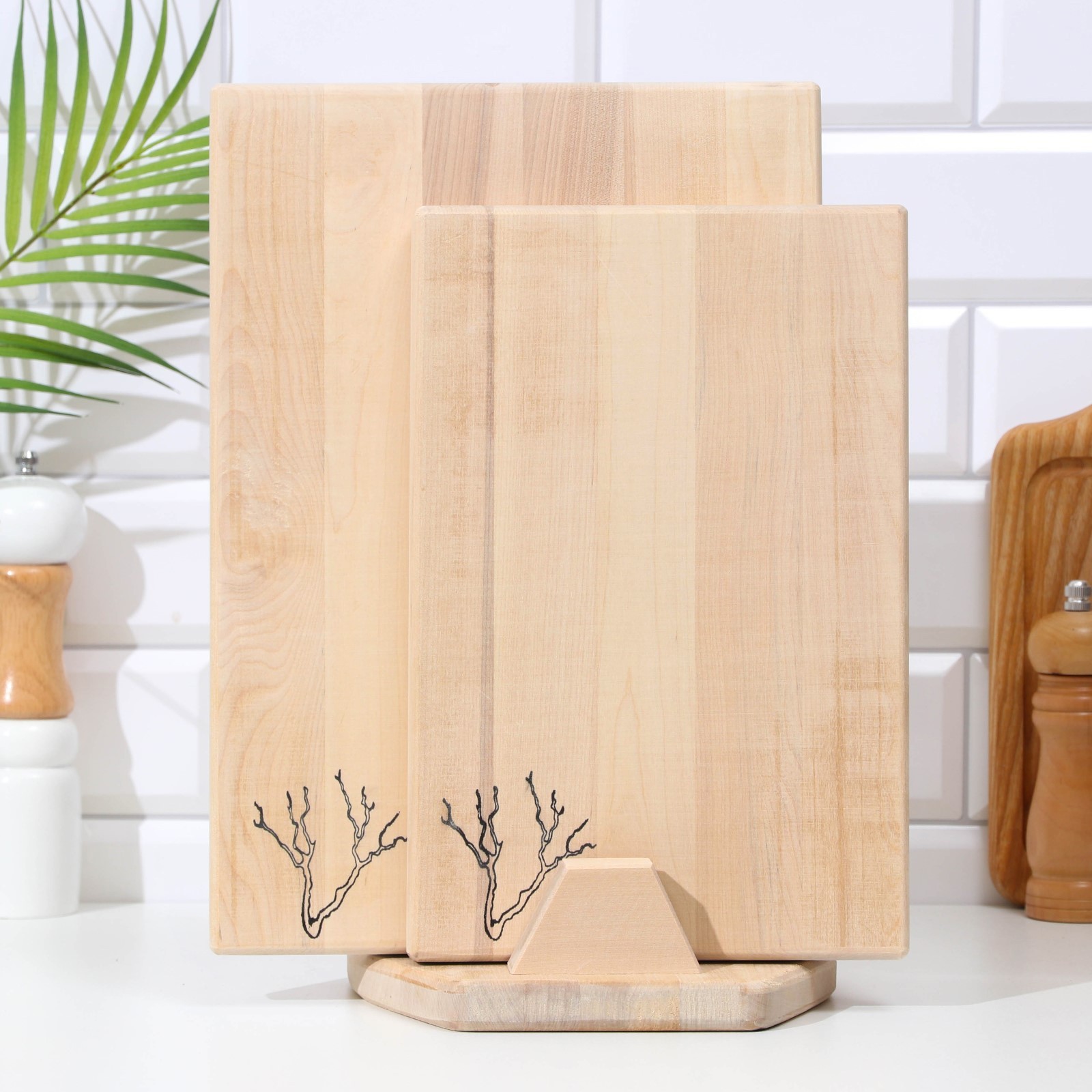 Набор разделочных и сервировочных досок на подставке 2 шт , береза. Деревянная разделочная доска — это классика, актуальная во все времена. Она не боится воды и имеет длительный срок службы. Подходит для мяса и овощей: продукты на ней не скользят, что значительно облегчает нарезку и обеспечивает безопасность повару. Также изделие почти не тупит ножи. Особенности: легко моется и быстро сушится;удобно хранить, можно подвесить на крючок;безопасный природный материал;невысокая цена. Уход за деревянной посудой: 1. Перед первым использованием ополосните деревянное изделие в тёплой воде без добавления моющих средств. Протрите предмет впитывающей тканью. Оставьте его на 1–2 часа, чтобы испарилась вся влага. 2. Не оставляйте изделие надолго в воде, так как дерево впитывает влагу и по мере высыхания может растрескаться. 3. Храните посуду в месте, куда не попадают солнечные лучи и влага. 4. Мойте посуду только вручную, мягкой губкой с добавлением небольшого количества моющего средства. 5. Не оставляете деревянную посуду грязной или мокрой надолго. 6. После мытья тщательно протрите изделие и высушите в вертикальном положении. Цвет: Бежевый Форма: Прямоугольная Длина, см: 30 Длина, см: 35 parts count: 0 В наборе, шт.: 2 tnved: 4419909000 Вид дерева: Берёза Материал: Дерево Тип доски: Стандартная Тип нанесения рисунка: Без нанесения Температурное ограничение: Нет Можно мыть в посудомоечной машине: Нет Особенности: Без особенностей Форма: Прямоугольник  развернуть описание ▼