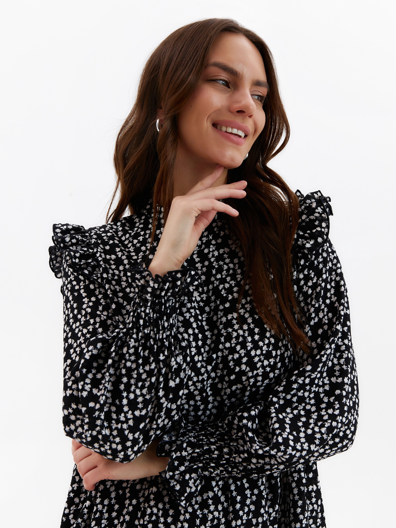 Платье с рюшами мини женское mist, размер 44, чёрное. Цвет:Чёрный|Для кого:Для женщины|Назначение:Повседневная|Ткань:Вискоза|Размер:44|Рост, см:160 - 165|Рост модели на фото, см:170|Сезон:Всесезонный|Тематика:Орнамент|Длина рукава:Длинный|Вырез горловины:Круглый|Декоративные элементы:Рюши|Покрой:Свободный|Рекомендации по уходу:Не отбеливать|Рекомендации по уходу:Стирка при 30 °С|Рекомендации по уходу:Бережный режим глажки|Состав ткани:Вискоза|Длина юбки:Мини|Вид юбки:А-силуэт|Параметры модели на фото (ОГ-ОТ-ОБ):78-64-89|Размер одежды:42|Страна:Россия  развернуть описание ▼