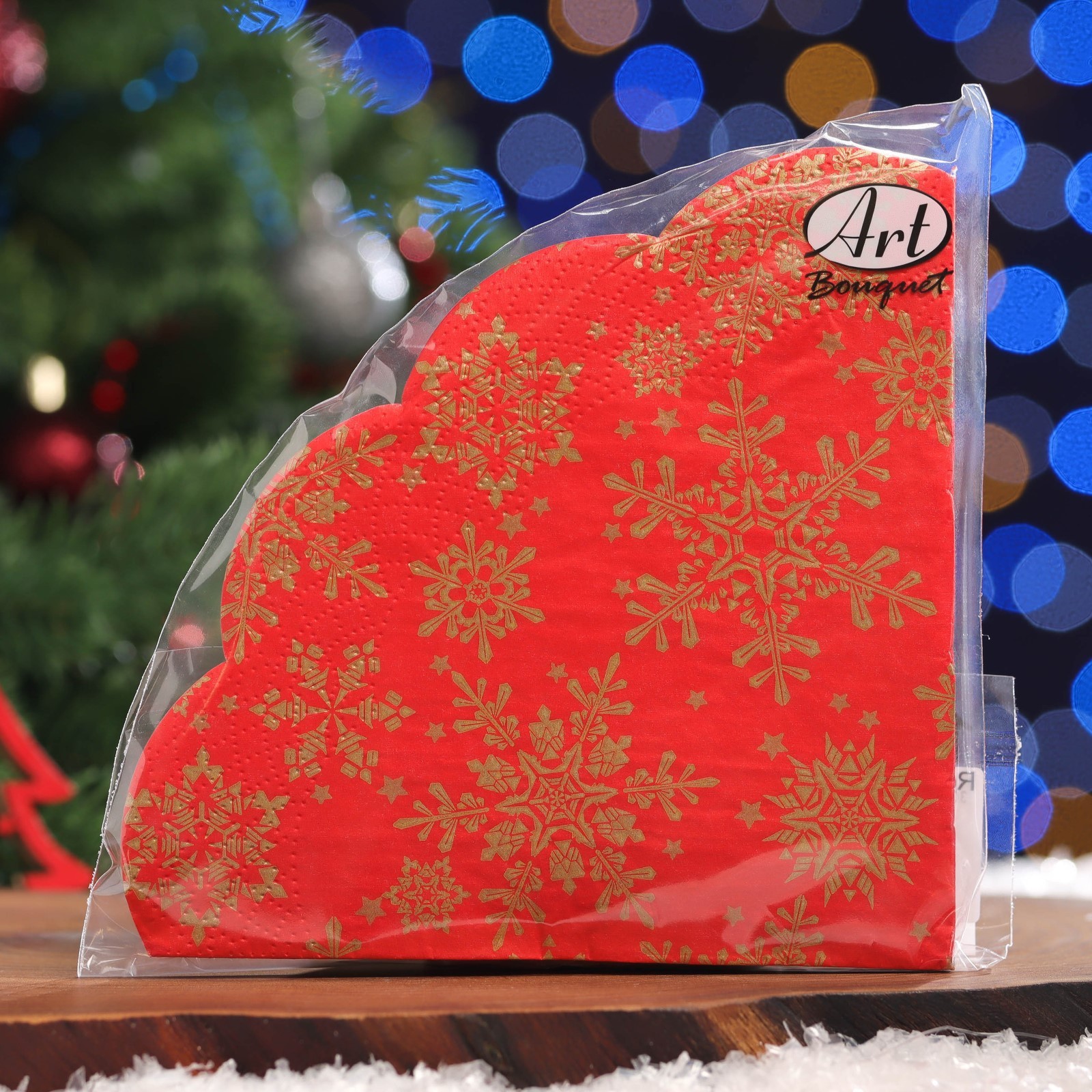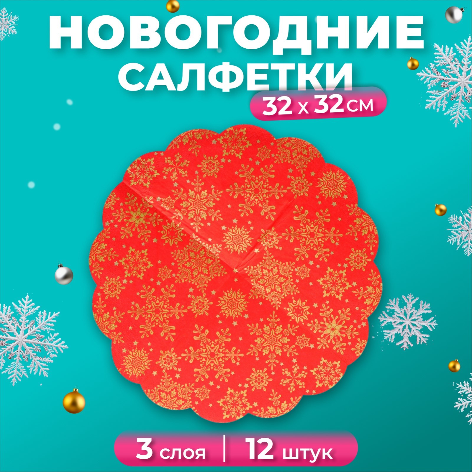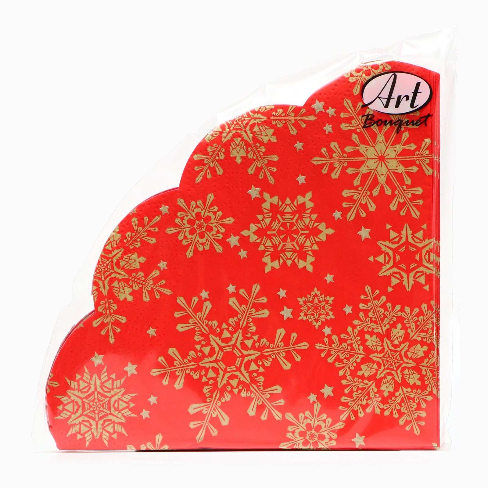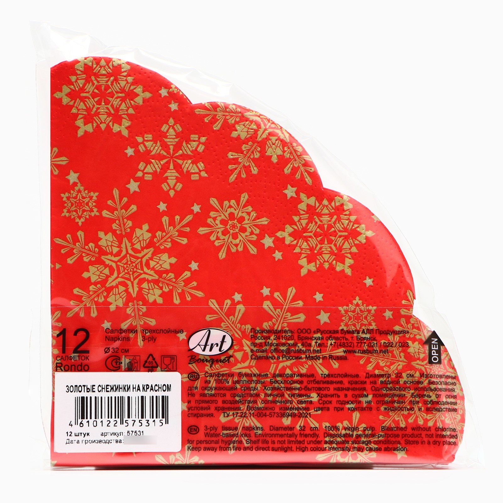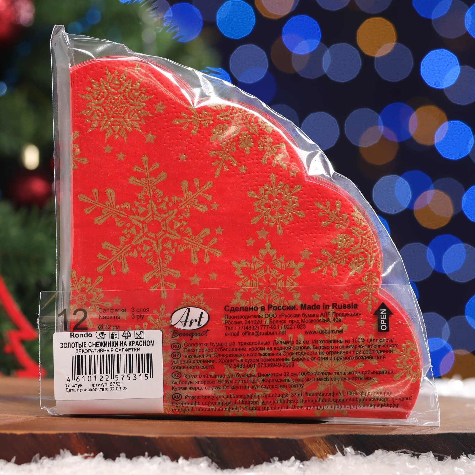 Новогодние салфетки бумажные круглые Art Bouquet Rondo «золотые снежинки на красном», 3 слоя, D 32 см, 12 шт