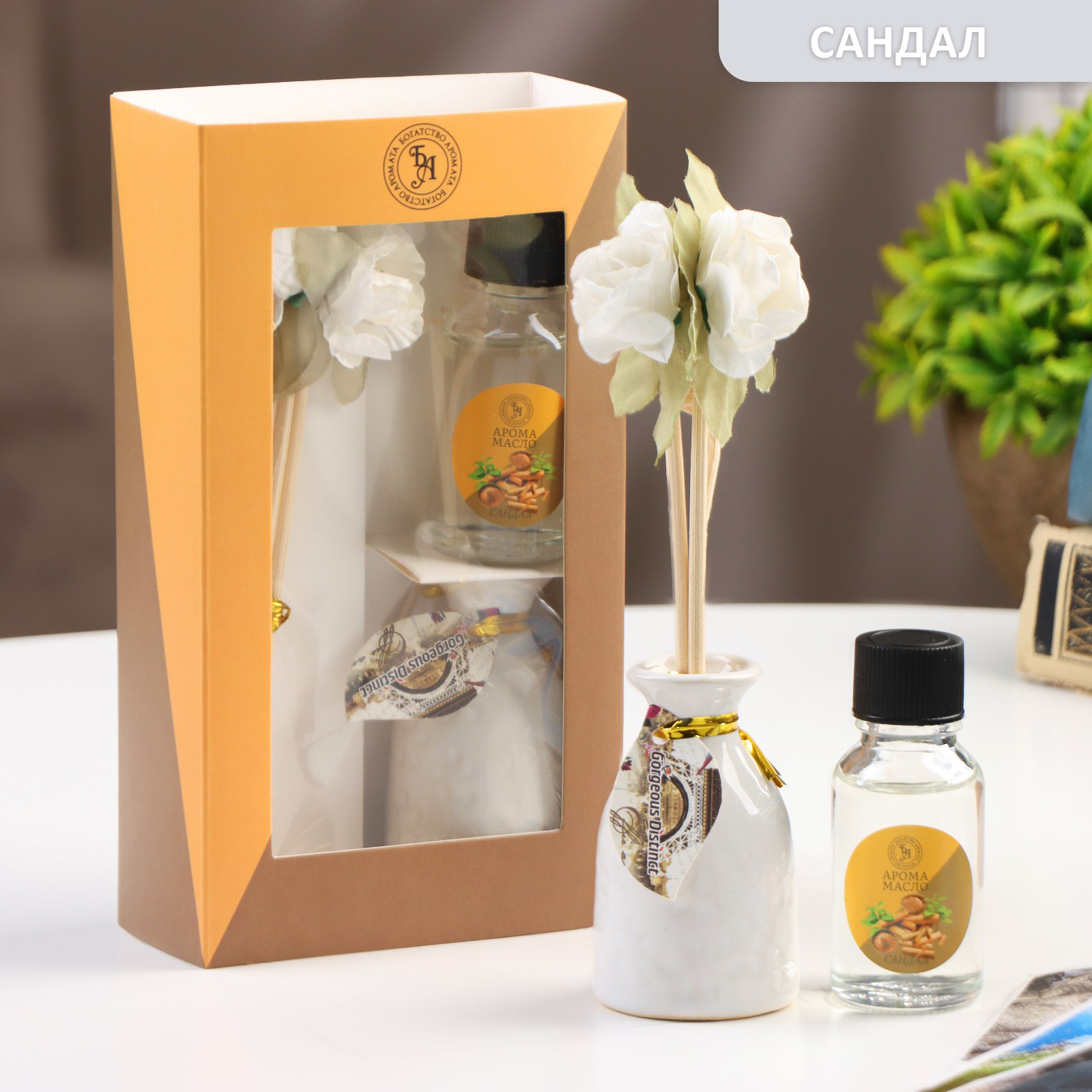 Набор подарочный с диффузором "ваза с цветком" сандал, "богатство аромата". Для кого: Унисекс В наборе, шт.: 3 Объём, мл: 15 Вид упаковки: Коробка Адресат: Без адресата Вид ароматизатора: Диффузор Аромат: Сандал Составляющие набора: Декор Составляющие набора: Ваза Составляющие набора: Аромамасло Возраст: Для взрослых Тематика подарка: Интерьер  развернуть описание ▼