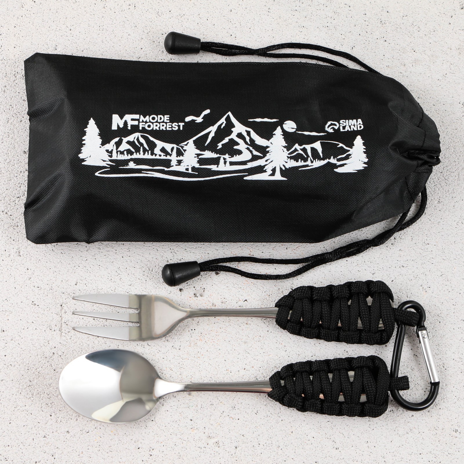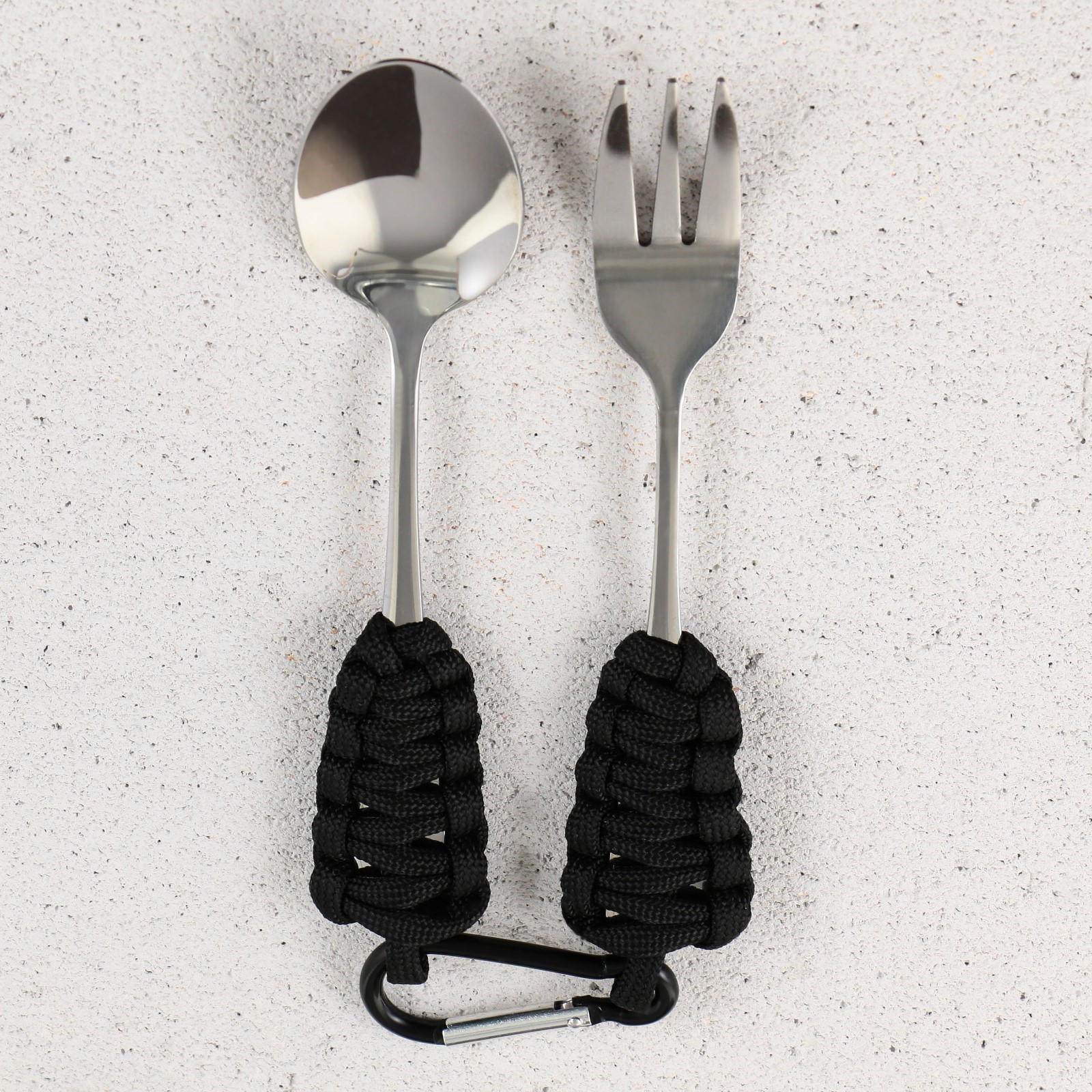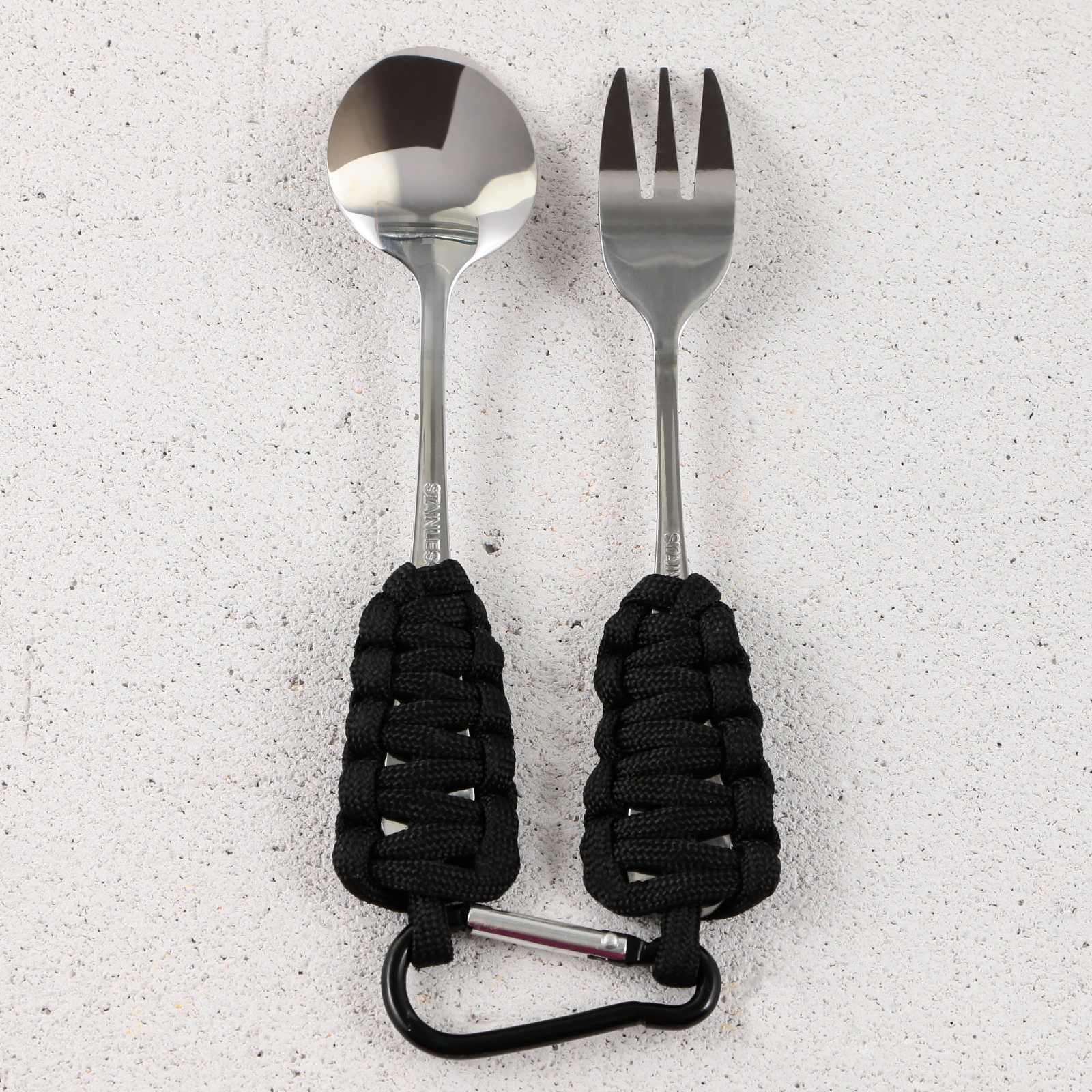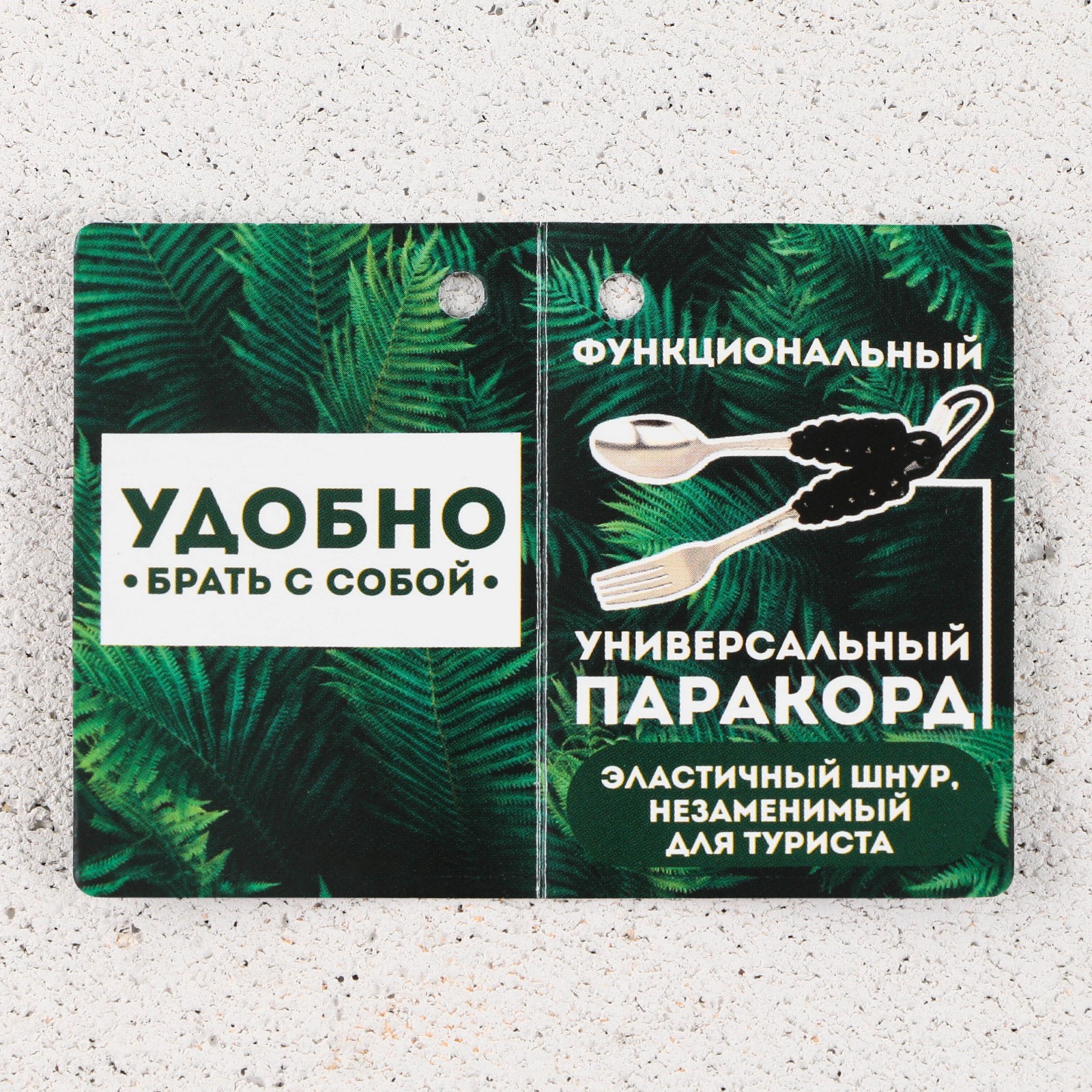Набор ложка с вилкой на паракорде, 13 см. Цвет: Чёрный parts count: 0 Количество персон: 1 В наборе, шт.: 2 Вид упаковки: Тканевый мешок Материал: Полиэстер Материал: Нержавеющая сталь Вид: Набор для приготовления и принятия пищи Назначение: Для приёма пищи Комплектация: Столовые приборы  развернуть описание ▼