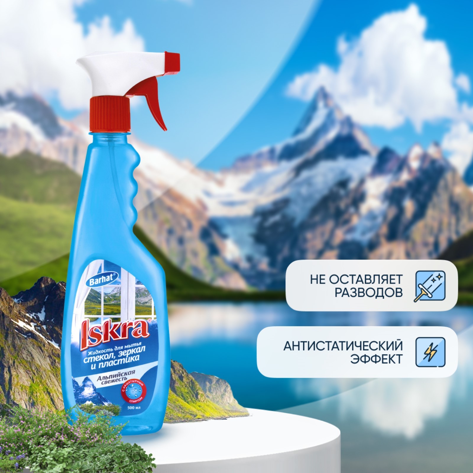 Средство для мытья стёкол, бархат Iskra, "альпийская свежесть" , с курком, 500 мл