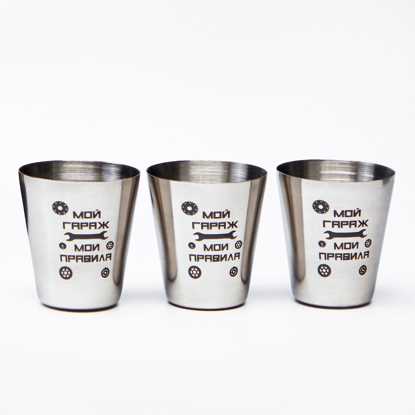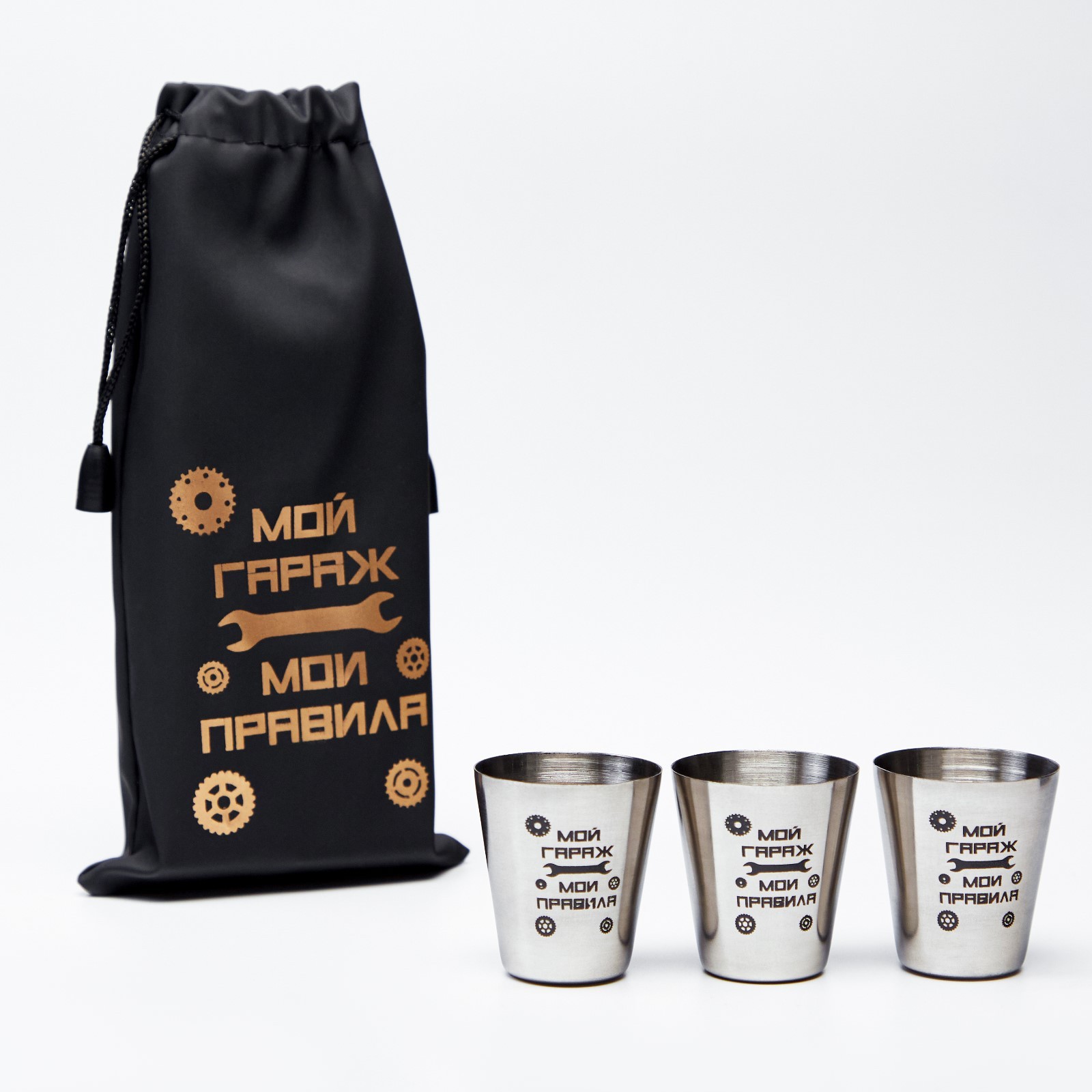 Стопки, 23 февраля, "мой гараж - мои правила", набор 3 шт по 30 мл, 4 х 3.5 см. Набор стопок из 3 штук по 30 мл из пищевой нержавеющей стали с удобным и компактным мешочком с завязками для хранения и переноски. Легкие и компактные, удобно брать с собой на отдых, рыбалку, охоту, природу или в путешествия. Супер прочные и стильные, эти стопки изготовлены из высокого качества 304 нержавеющей стали, они не только красиво смотрятся, но и обеспечивают долгий срок службы изделия. Легко моются и подходят для повседневного использования. Отлично заменят стеклянные рюмки и бокалы, смотрятся эффектно и стильно. Стопки не слишком высокие, удобно помещаются в руке и имеют оптимальный объем 30 мл. Это подарочный набор на все случаи жизни! Стаканчики станут прекрасным подарком на новый год папе или маме, бабушке или дедушке, а еще коллеге или начальнику боссу на день рождения или 23 февраля, 9 мая, 8 марта, юбилей. Этот набор шоттов удивит и порадует каждого получателя. Рюмки подойдут для водки, самогона, коньяка, виски, рома, ликера и другого алкоголя. Также допустимо использовать для безалкогольных напитков, таких как сок, вода или морс. Небольшие шоты идеальны для коктейлей, текилы или настоек. Цвет: Хромированный parts count: 0 В наборе, шт.: 3 Объём, мл: 90 tnved: 7323930000 Материал: Нержавеющая сталь  развернуть описание ▼