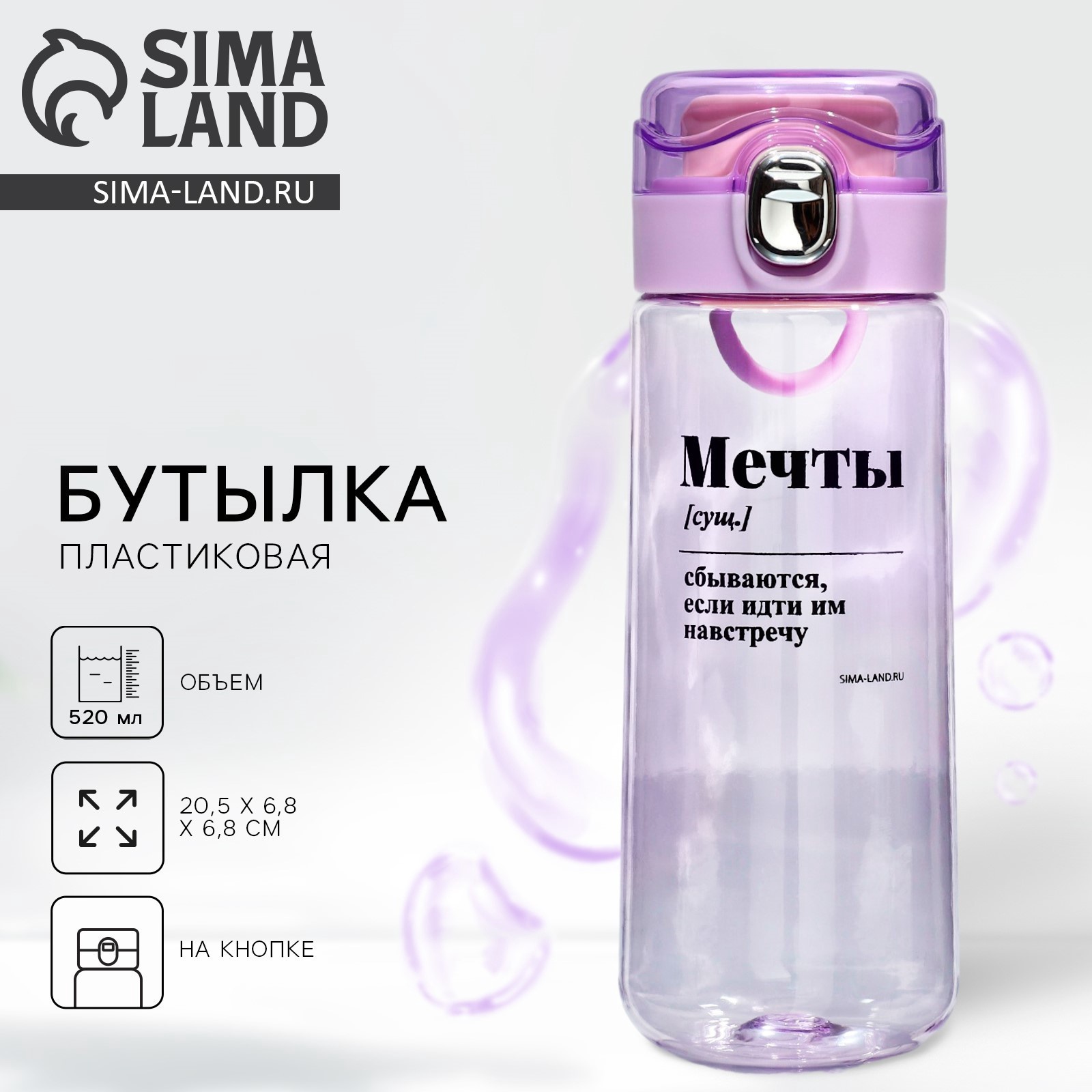 Бутылка для воды «мечты», 520 мл. Цвет: Розовый Цвет: Прозрачный Объём, мл: 520 Материал: Пластик Вид: Бутылка Особенности: На кнопке  развернуть описание ▼