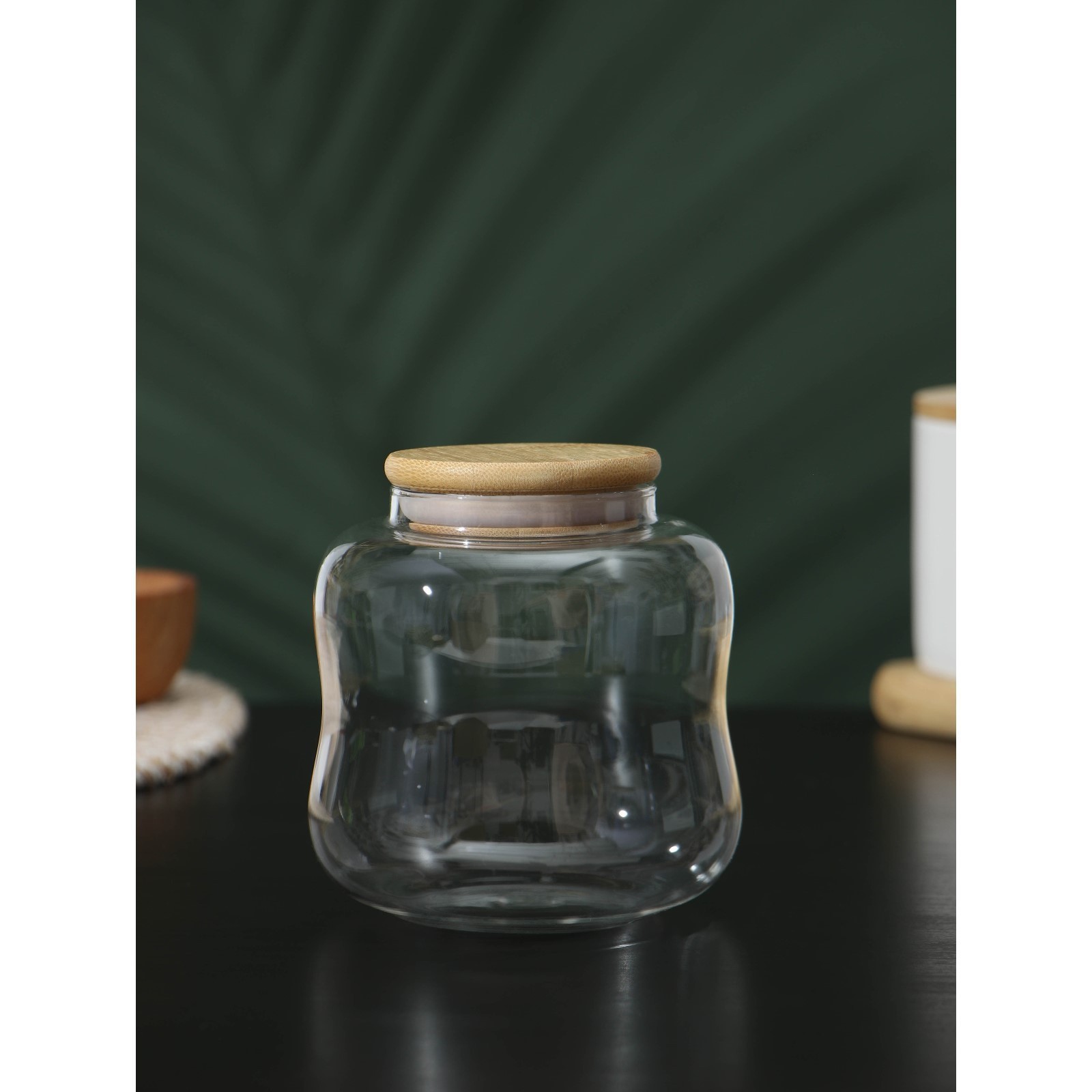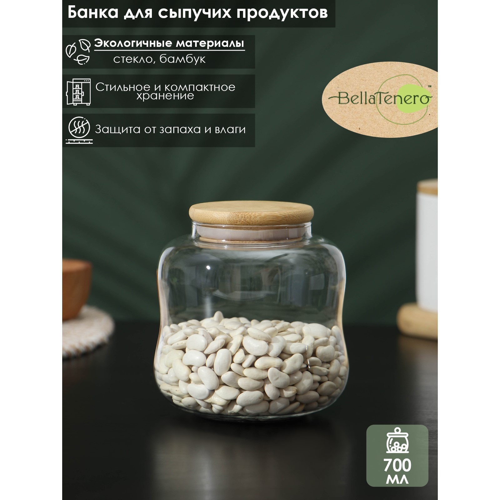 Банка стеклянная для сыпучих продуктов с бамбуковой крышкой Bellatenero «эко. изгиб», 700 мл, 10,5x11,5 см