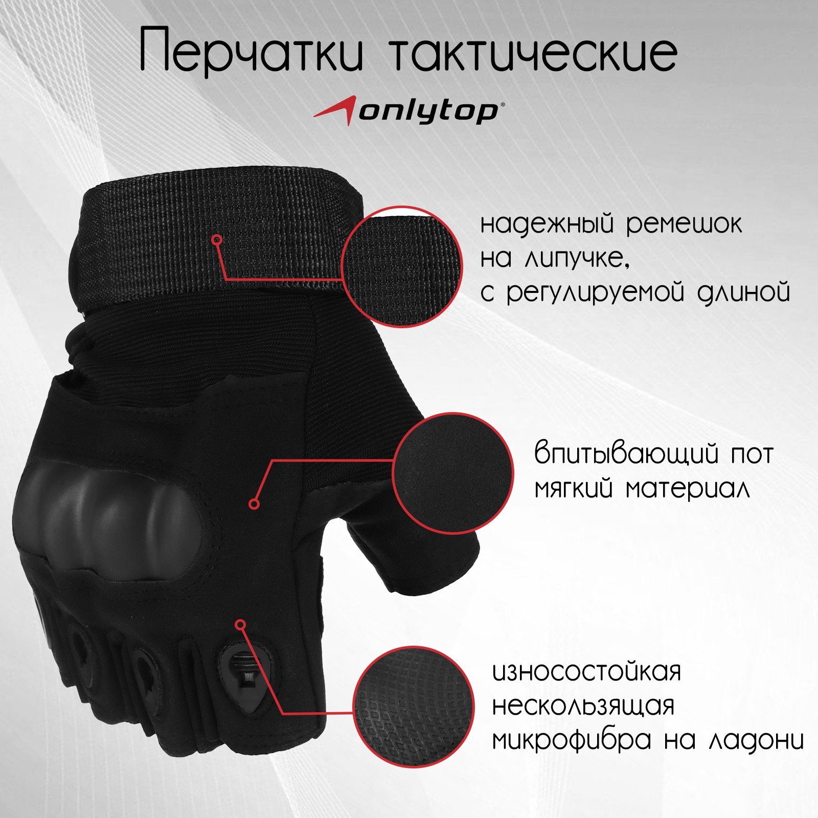 Перчатки тактические onlytop, без пальцев, р. l, цвет чёрный. Тактические перчатки подходят для любителей армейского снаряжения, страйкбола, мото- и велоспорта. Предохраняют кожу, кости и мягкие ткани рук от механических повреждений, действия высокой температуры и агрессивных сред. ОсобенностиИмеют противоскользящее покрытие на стороне ладони. Есть дополнительные отверстия для улучшения вентиляции. Фиксируются липучим ремешком для лёгкости в использовании. Цвет: Чёрный Материал: Пластик Материал: Текстиль Размер: L Вид: Перчатки Вид: Перчатки/Рукавицы  развернуть описание ▼
