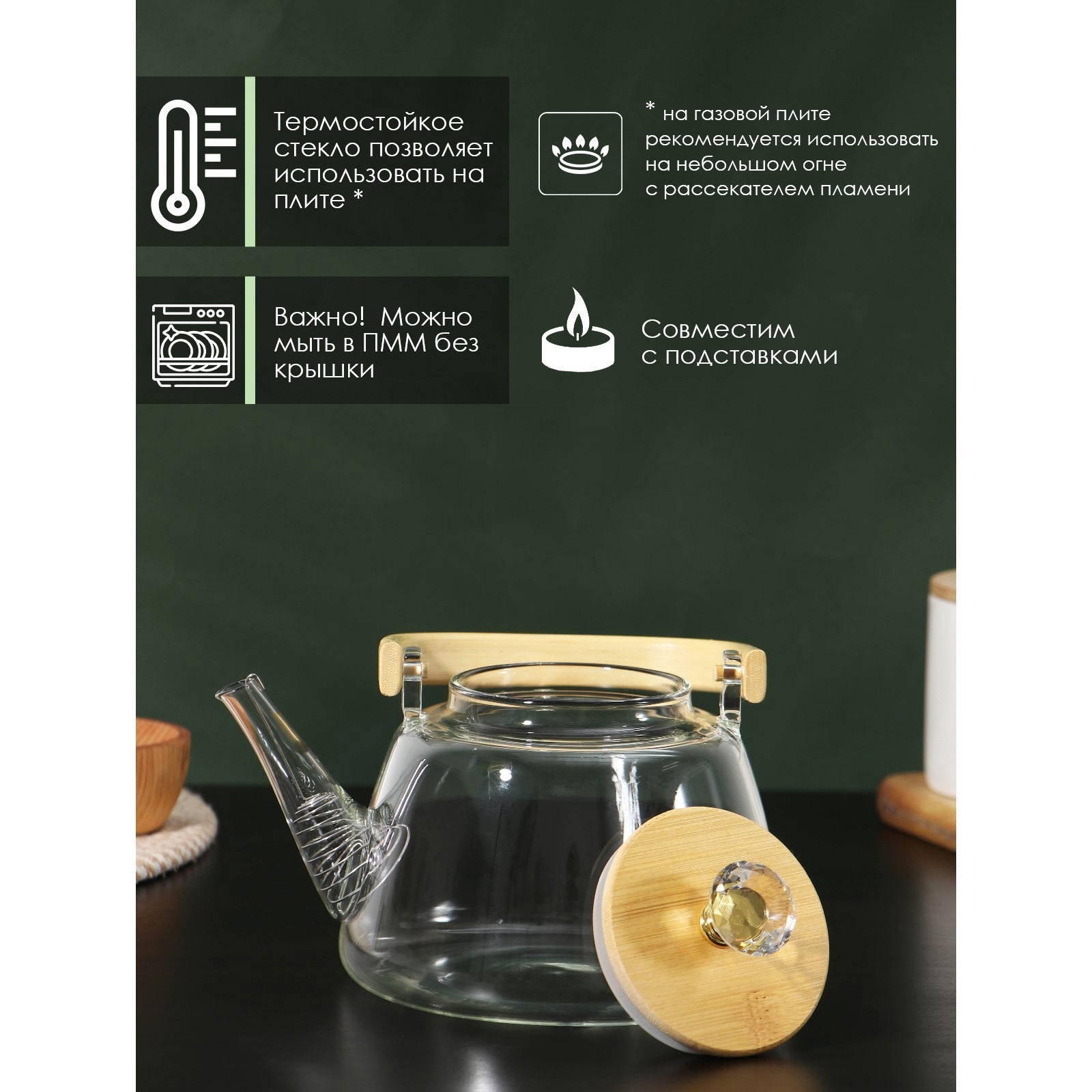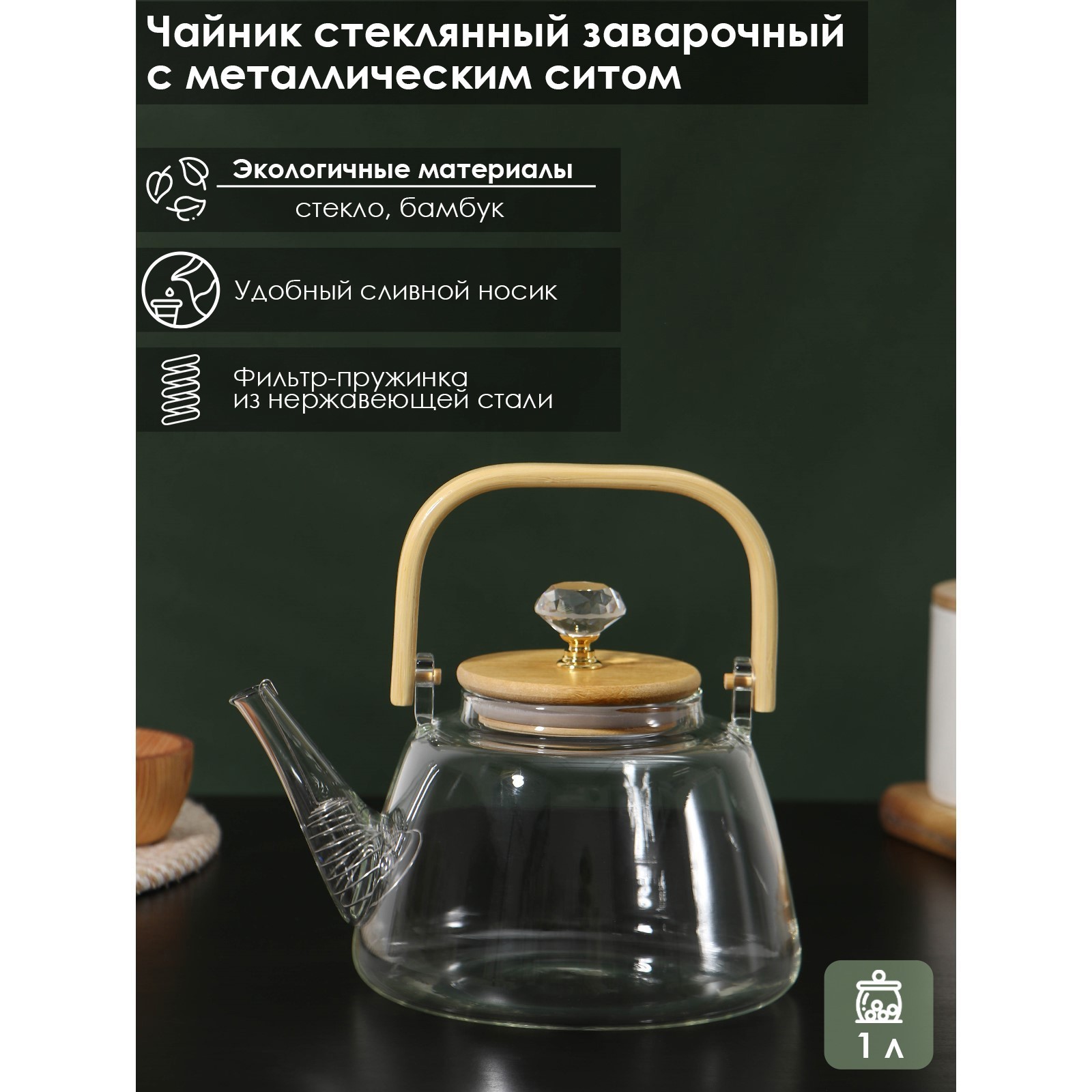 Чайник заварочный стеклянный с металлическим ситом Bellatenero «эко. бриллиант», 1 л, 17x15x19 см