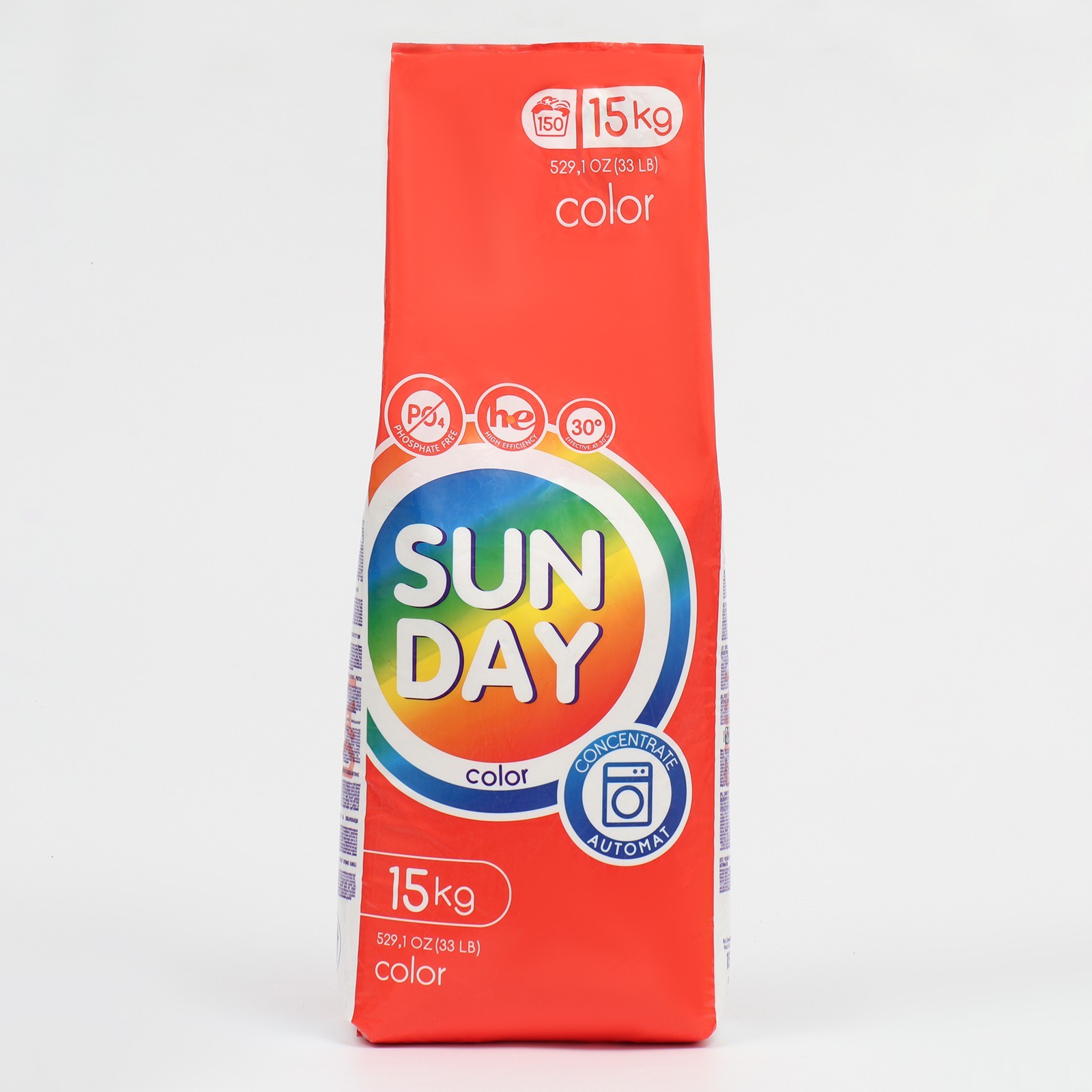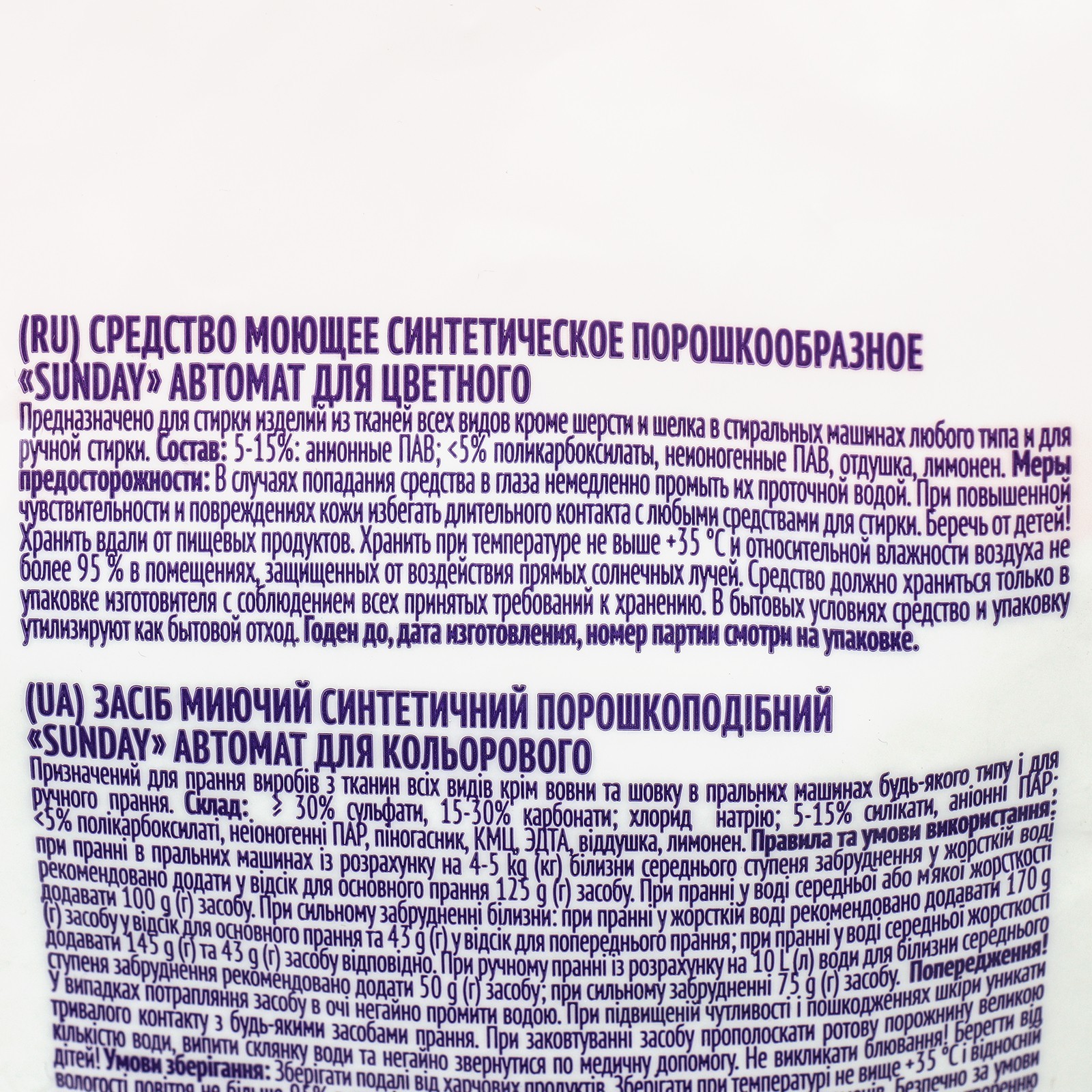 Стиральный порошок sunday для автоматической стирки цветного, 15 кг. Стиральный порошок Sunday для автоматической стирки цветного белья весом 15 кг представляет собой эффективное средство, специально разработанное для удаления загрязнений и заботы о цветных тканях в автоматических стиральных машинах. Вот основные характеристики этого продукта: Объем упаковки: 15 кг - большой объем упаковки обеспечивает долгосрочное использование и является удобным для семей с большим количеством белья. Целевое применение: Разработан специально для стирки цветного белья, чтобы сохранить яркость и стойкость цветов при каждом цикле стирки. Защита цветов: Имеет специальные компоненты, предотвращающие выцветание и сохраняющие насыщенность цветов, что особенно важно при стирке разноцветного и яркого белья. Эффективное удаление загрязнений: Обеспечивает высокую эффективность в удалении различных видов загрязнений, включая пятна от пищи, грязи и других повседневных загрязнений. Сбалансированный состав: Включает в себя компоненты для мягкости тканей, предотвращая их износ и сохраняя качество белья на протяжении длительного времени. Подходит для автоматических стиральных машин: Разработан специально для использования в автоматических стиральных машинах, обеспечивая удобство и эффективность в применении. Стиральный порошок Sunday для цветного белья весом 15 кг является надежным выбором для семей, которые ценят качественную стирку и долговременное сохранение цветов своего белья. Объём, л: 15 Вес, кг: 15 Вес, г/Объём, мл: 15000 Форма выпуска: Порошок Назначение: Для цветных тканей Вид стирки: Автомат : 0 Температурное ограничение: Нет Особенности средства: Антибактериальный эффект Особенности средства: Антистатический эффект  развернуть описание ▼