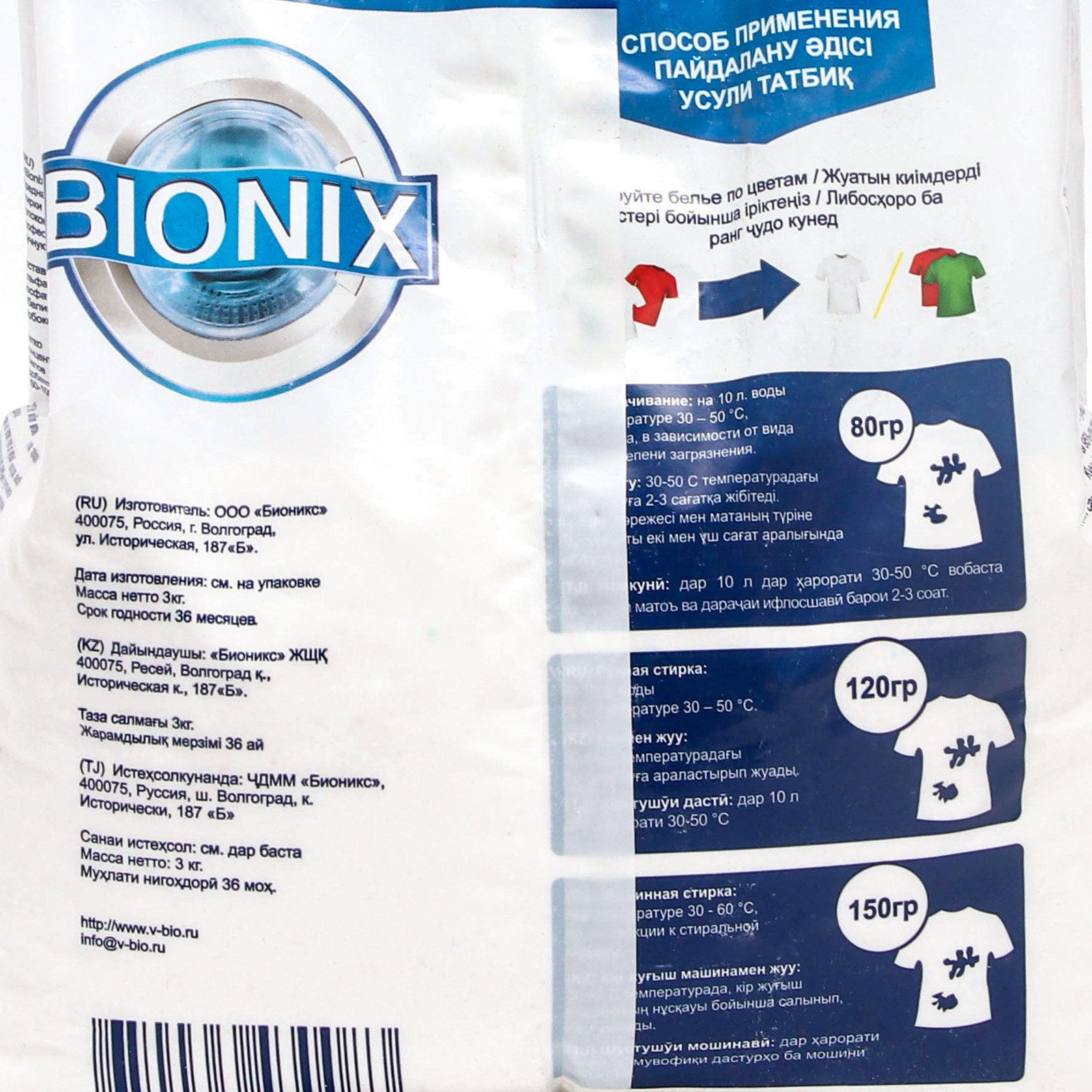 Стиральный порошок bionix для автоматической стирки, 3 кг. Средство моющее синтетическое порошкообразное универсал автомат. Стиральный порошок предназначен для замачивания и стирки в стиральных машинах изделий из хлопчатобумажных, льняных, синтетических, смешенных волокон и цвета кроме шерсти и натурального шелка. Способ применения: замачивание изделий – 80-90 г/10 л в течении 2-3 ч при температуре 30-50 С. Ручная стирка – 90-120 г/ 10 л при температуре 30-50 С. Машинная стирка – 180-250 г при температуре 30-60 С. Следуйте рекомендациям на ярлыках одежды при стирки и температуры. Светлое белье стирать отдельно от темноокрашенных. Цветное замачивать и стирать отдельно от белого. Меры предосторожности: хранить вдали от пищевых продуктов, в недоступном для детей месте. В случае попадания средства в глаза – немедленно промыть проточной водой, при повышенной чувствительности и повреждениях кожи следует избегать длительного контакта с стиральными порошками. Хранить в крытых, вентилируемых помещениях на расстоянии от нагревательных приборов, при температуре не выше + 35 С и относительной влажностью воздуха не более 95%. Порошки должны быть защищены от воздействия прямых солнечных лучей. Беречь от влаги. Срок годности 24 месяца с даты изготовления. Состав: анионные пав 5-15%, неионогенные пав менее 5%, сульфат натрия, перкарбонат натрия менее 5%, фосфаты менее 5%, taed, силикат натрия, оптический отбеливатель, поликарбоксилаты, сода кальцинированная, карбоксиметилцеллюлоза, энзимы, отдушка. Вес, кг: 3 Назначение: Для всех видов тканей Вид стирки: Автомат Температурное ограничение: Нет  развернуть описание ▼