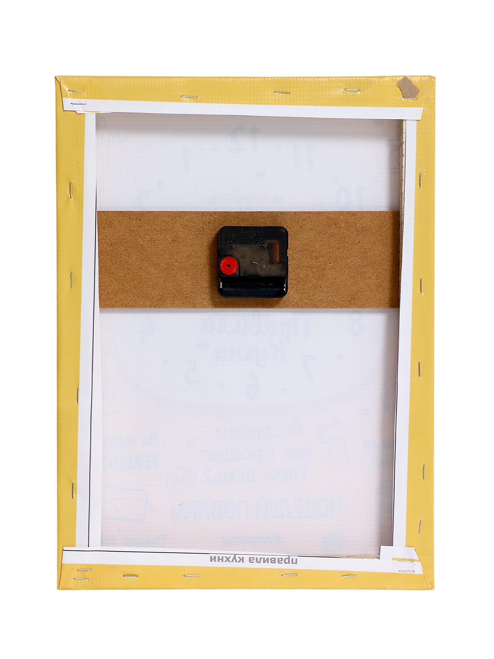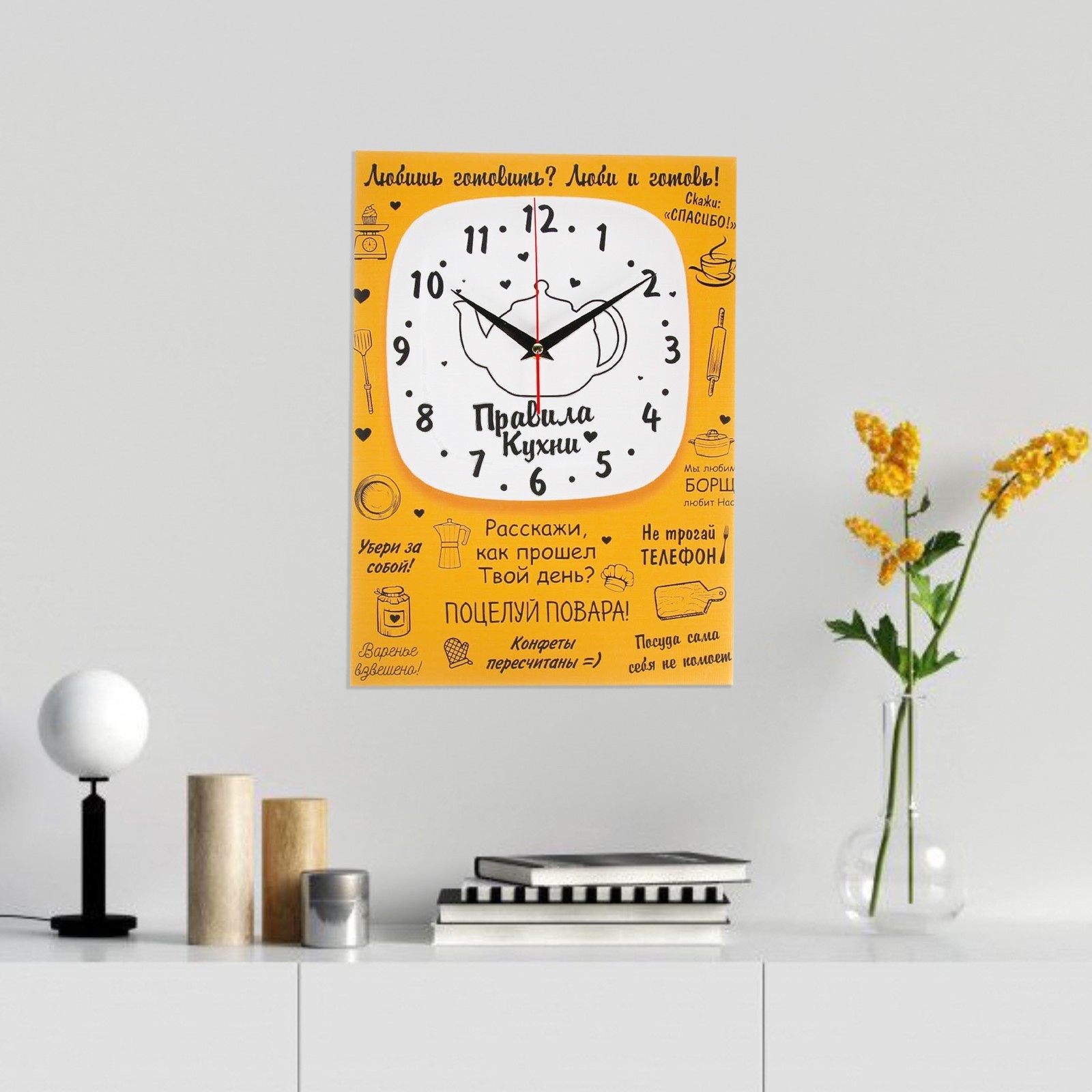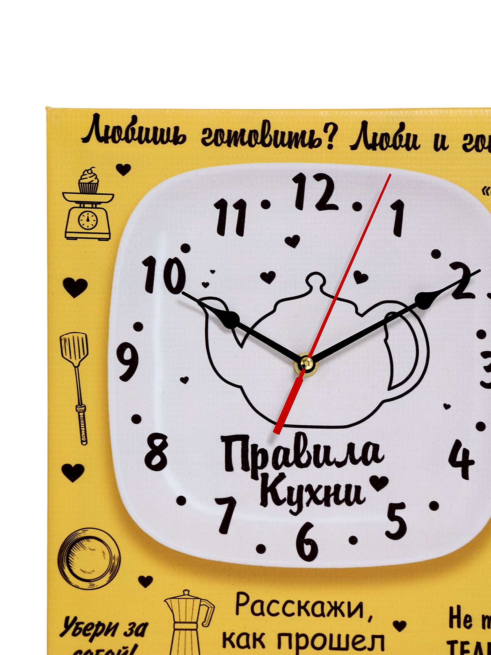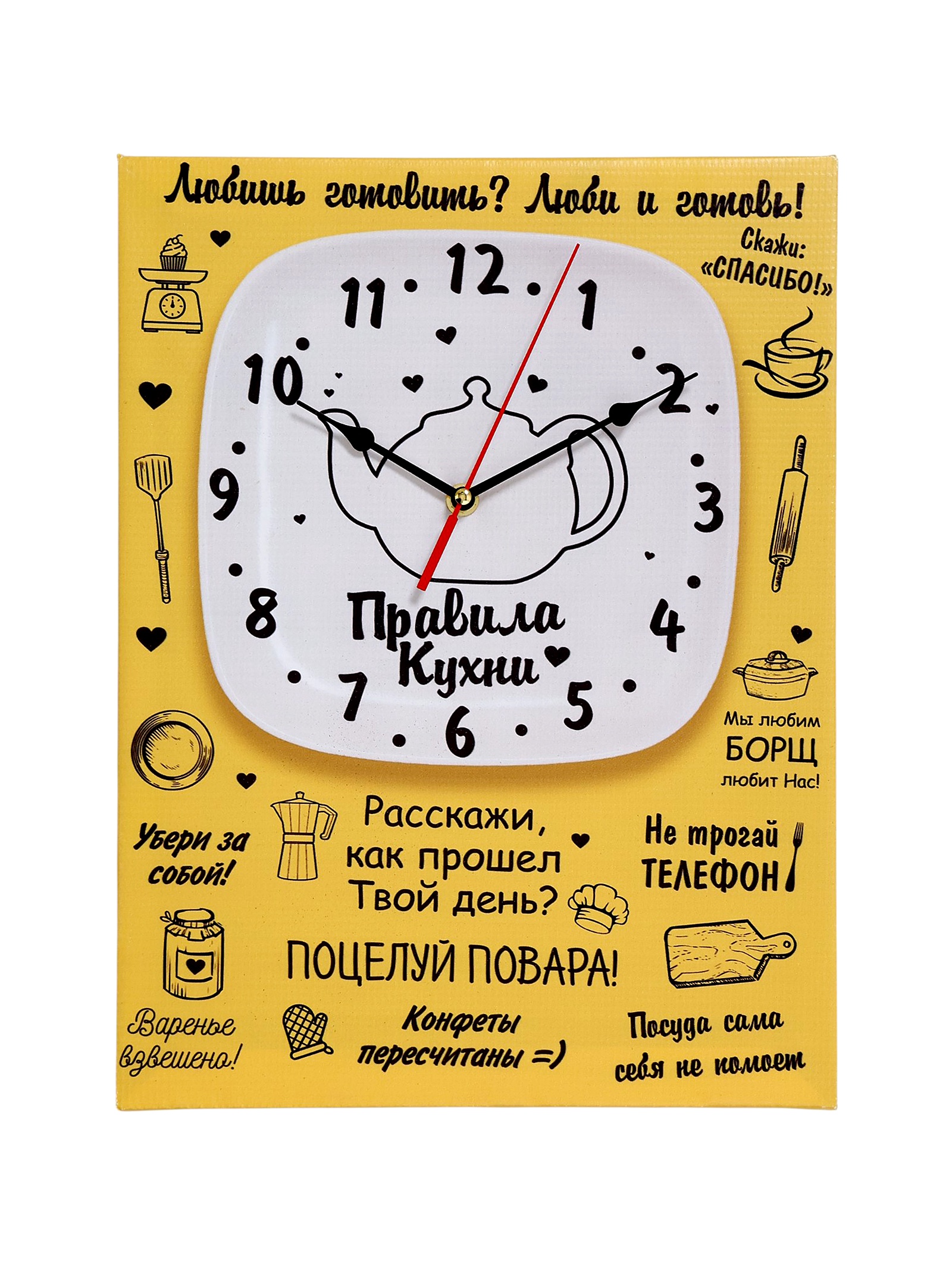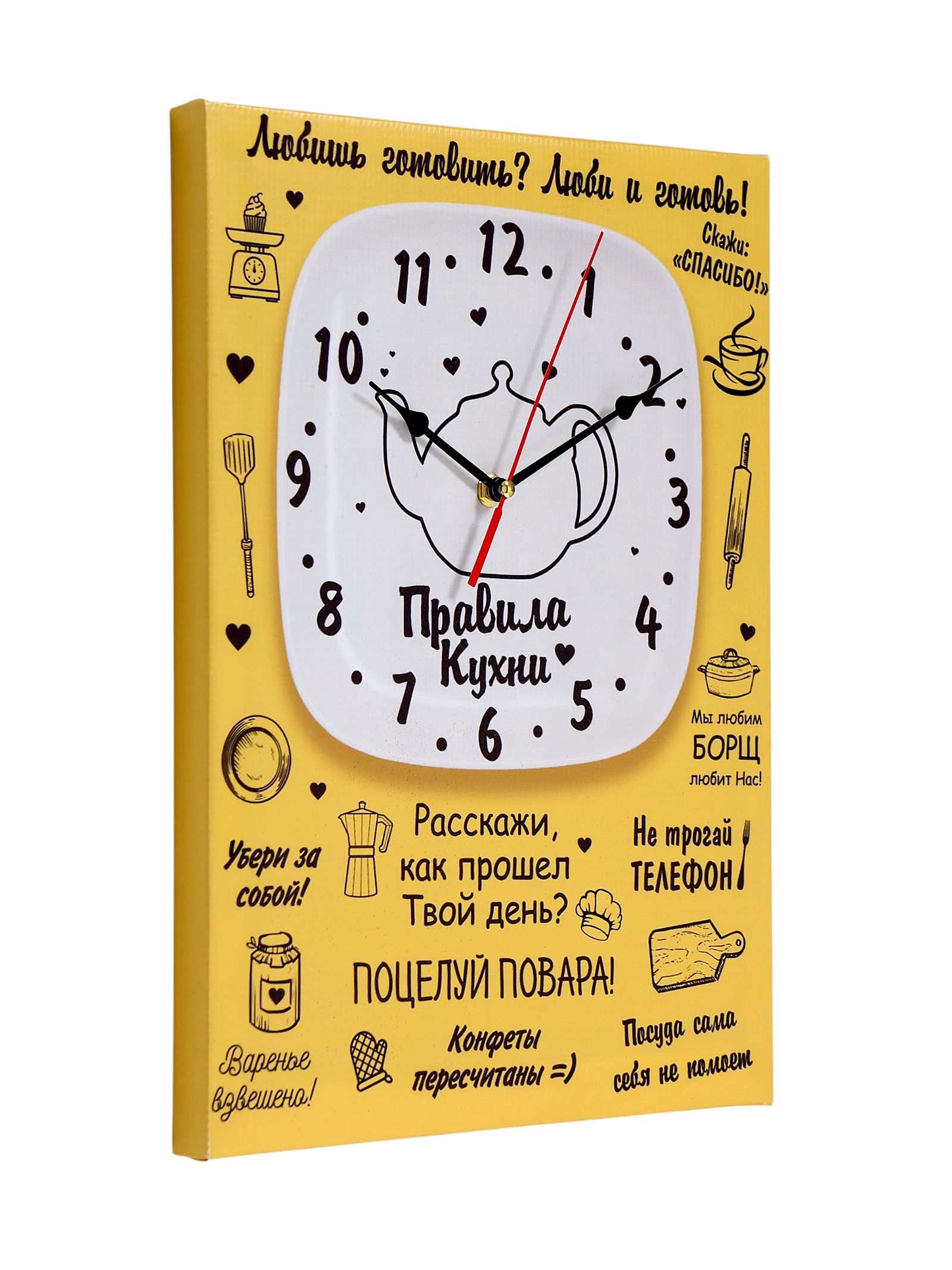 Часы-картина настенные, интерьерные правила кухни, 30 х 40 см, на холсте, бесшумные. Стильные бесшумные часы-картина удачно оформят любой интерьер от современного до классического. Картина с часами оснащена кварцевым часовым механизмом с тихим ходом. Она идеально подойдет для кухни, а также спальни и гостиной, кабинета, офиса, прихожей, пригодится в квартире, дома, на даче. Размер часов: 30 40 см. Толщина 2.5 см, толщина со стрелками 4 см. Часы выполнены на холсте, который не выцветает на солнце, не деформируется под влиянием повышенной влажности или перепадов температуры. Подрамник выполнен из МДФ - крепкого, экологически чистого материала. Качество сборки препятствует провисанию полотна со временем. Упакованы в картонную коробку. Используется HD печать для высокой детализации изображения. У часов простая система креплений. Часы идут без стекла, с открытой стрелкой. Механизм бесшумный, батарейка формата АА в комплект не входит. Тип индикации - арабские цифры, что делает время на часах четко видимым и легко читаемым. Актуальный декор и необходимый предмет в любом доме, наши оригинальные настенные часы с рисунком станут хорошим дополнением интерьера. Картина интерьерная отлично подойдет в кафе, салон красоты, гостиницу. Часы подойдут в качестве подарка женщине, друзьям и близким. Такой аксессуар для дома станет отличным подарком маме, бабушке, подруге, сестре, брату, девушке, парню, коллеге на день рождения, 14 февраля, 8 марта, юбилей, новый год, рождество. Часы-постеры имеют множество преимуществ: функциональность: помимо декоративного эффекта, часы на картине также выполняют свою основную функцию - показывают времяиндивидуальный дизайн: вы можете выбрать картину с изображением, которое вам нравится и будет сочетаться по стилю и цвету с вашим интерьеромдолговечность: часы-картины не прихотливы в уходе и сохраняют свой первоначальный вид долгое времяЦвет:Жёлтый|Форма:Прямоугольная|Ширина, см:30|Высота, см:40|Тематика:Надписи, цифры, буквы|Тематика:Кухня|Тип механизма:Кварцевый|Материал:МДФ|Ход стрелок:Плавный|Бесшумные:Да|Страна:Россия  развернуть описание ▼