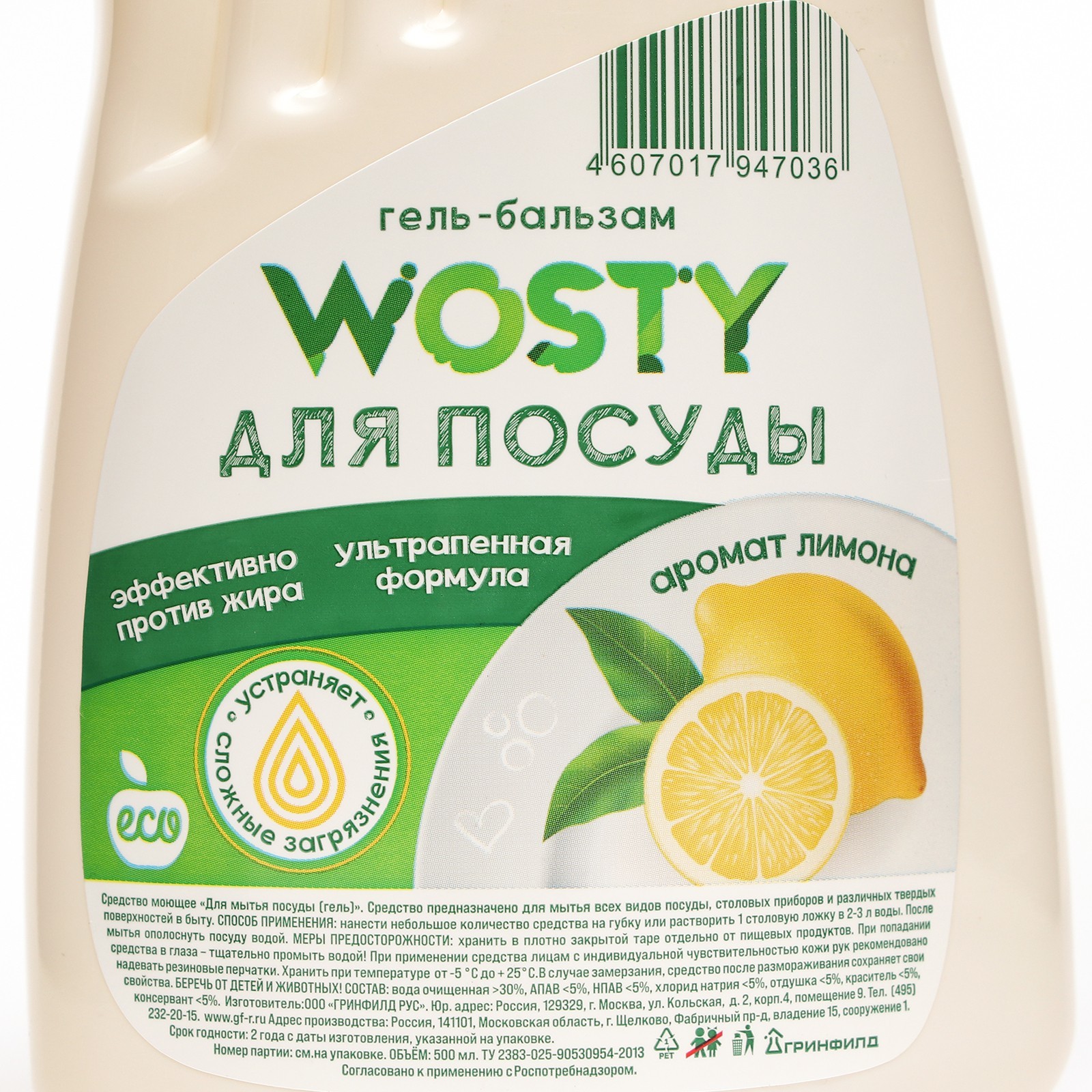Средство для мытья посуды Wosty "лимон", 500 мл