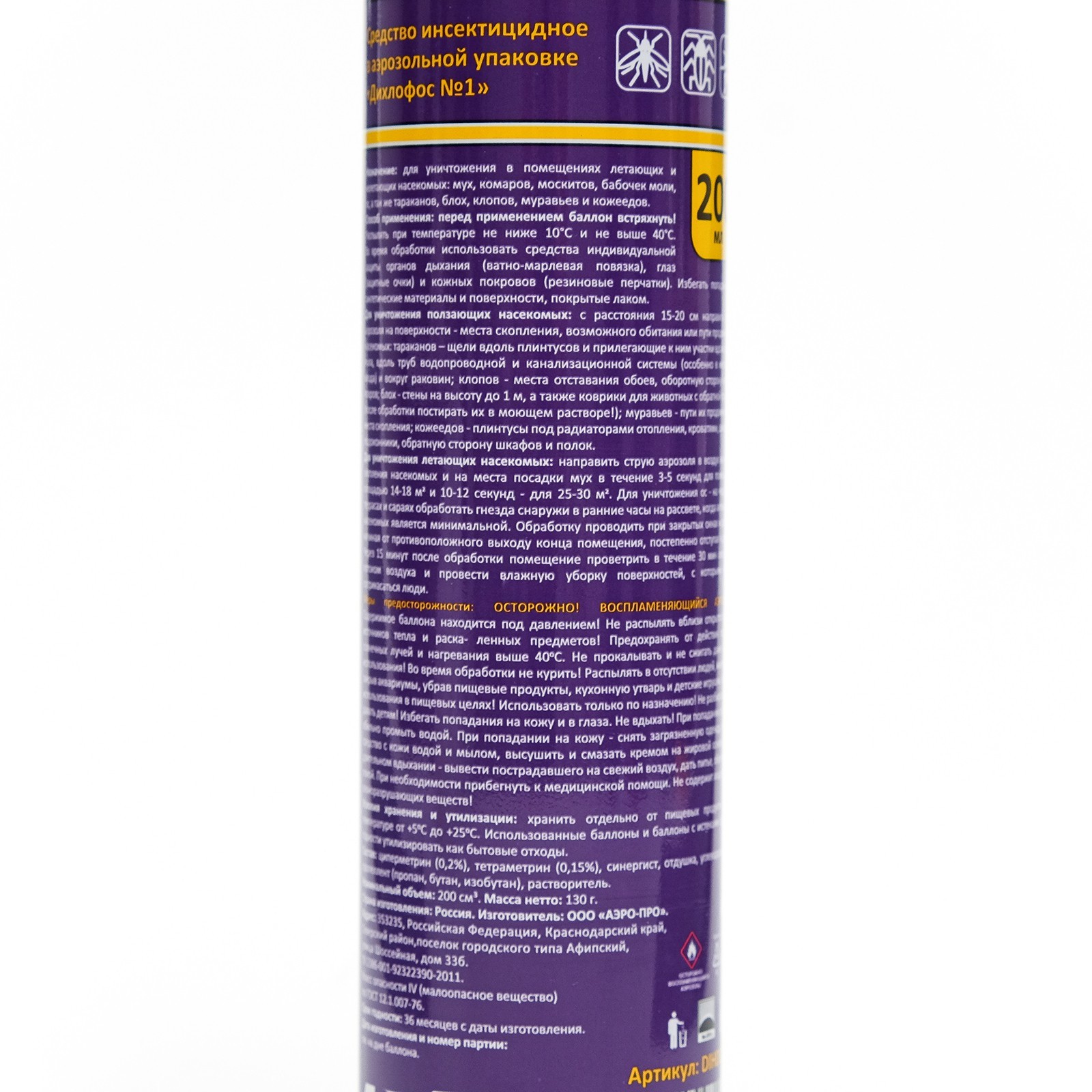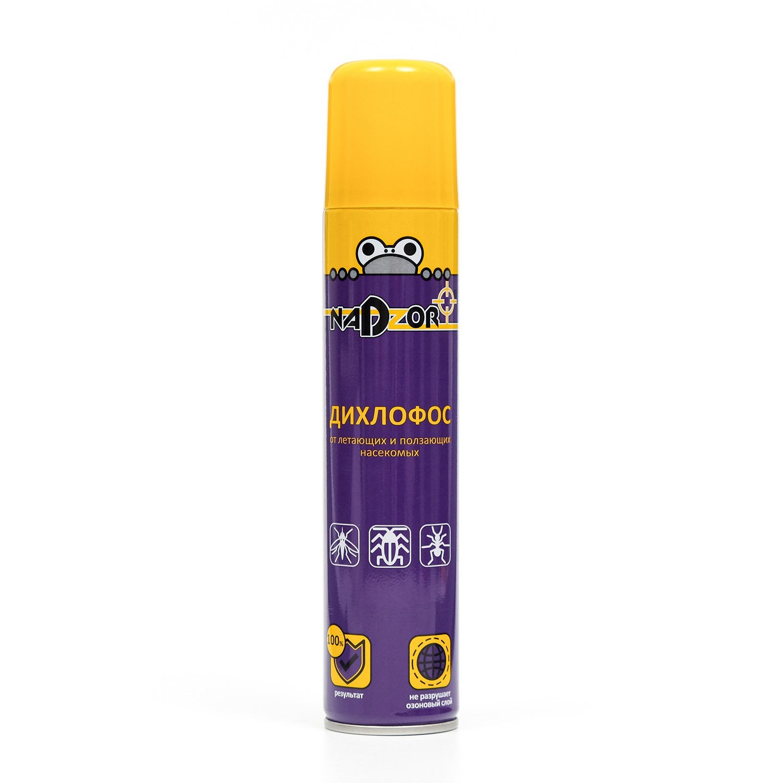 Дихлофос "nadzor", универсальный, 200 мл. Дихлофос за считанные минуты избавляет от насекомых в помещении. Высокоэффективная многокомпонентная формула аэрозоля гарантирует защиту от широкого спектра насекомых. Дихлофос - одно из самых популярных средств, используемое для уничтожения домашних, ползающих и летающих насекомых-паразитов, применяемое для обработки помещений. Применяется для уничтожения летающих насекомых (мухи, комары, осы, москиты, бабочки моли) и нелетающих насекомых (тараканы, клопы, блохи, муравьи, кожееды) в помещениях. 100% результат. Действия дихлофоса, сначала парализуется передвижение насекомых, после чего насекомые погибают от токсического действия препарата. Способ использования: для уничтожения нелетающих насекомых - с расстояния 15-20 см направить струю аэрозоля на поверхности – места скопления, возможного обитания или пути передвижения насекомых. Баллон объемом 210-270 см3 рассчитан на обработку помещения площадью 25-35 м2. Для уничтожения тараканов и клопов – обработать места их скопления и возможного обитания (плинтусы, щели в стенах и мебели, места отхождения обоев, обратную сторону картин, ковров). Блох – щели в полу и за плинтусами, пороги, стены на высоту до 1 м, подстилки для животных, которые перед использованием должны быть выстираны. Муравьев - пути их передвижения (дорожки) и гнезда. Кожеедов – плинтус. Меры предосторожности: огнеопасно! Не распылять вблизи открытого огня. Предохранять от воздействия прямых солнечных лучей. Не допускать нагревания свыше 40С. Не курить во время использования. Не давать детям. Распылять в отсутствие людей, домашних животных, птиц. Закрыть аквариумы, убрать пищевые продукты, кухонные предметы. Избегать попадания на синтетические материалы, поверхности покрытые лаком. Беречь от попадания средства в глаза, промыть большим количеством воды. После работы тщательно вымыть руки с мылом. Состав: циперметрин (0, 2%), тетраметрин (0, 15%), синергист, отдушка, углеводородный пропеллент (пропан, бутан). Вид средства: Спрей Назначение: Универсальное Температурное ограничение: Нет  развернуть описание ▼