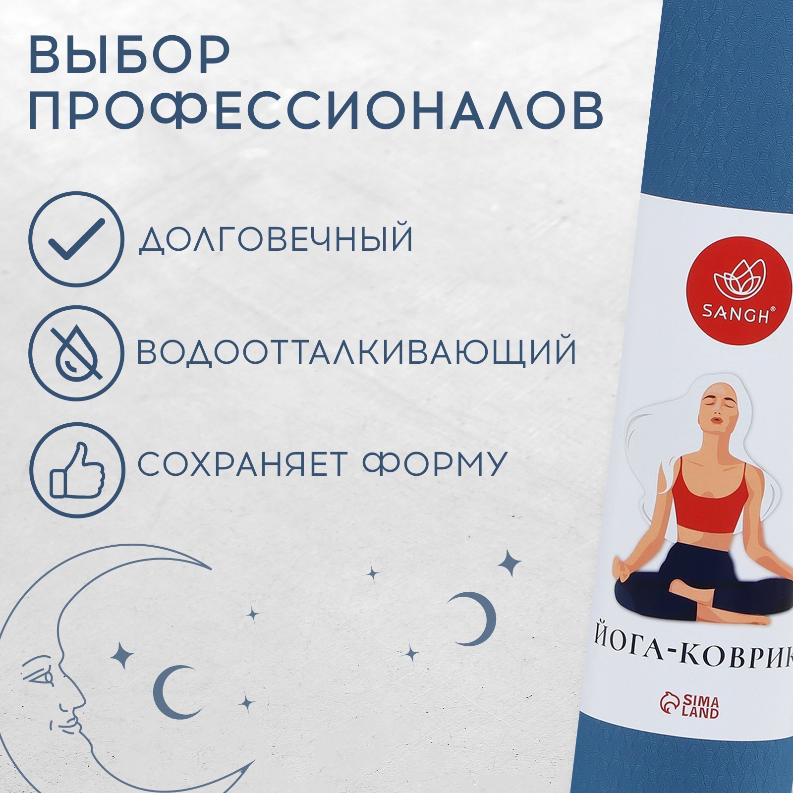 Коврик для йоги sangh, 183х61х0,6 см, цвет синий. Коврик подходит для занятий йогой и фитнесом дома и в спортивных залах. Помогает в выполнении асан или других упражнений. Смягчает упор тела на твёрдую поверхность. Сохраняет форму после выполнения упражнений. Цвет: Синий Длина, см: 183 Ширина, см: 61 Толщина, мм: 6 Возраст: Любой Материал: TPE Особенности: Водоотталкивающий Особенности: Нескользящий Вид: Классический  развернуть описание ▼
