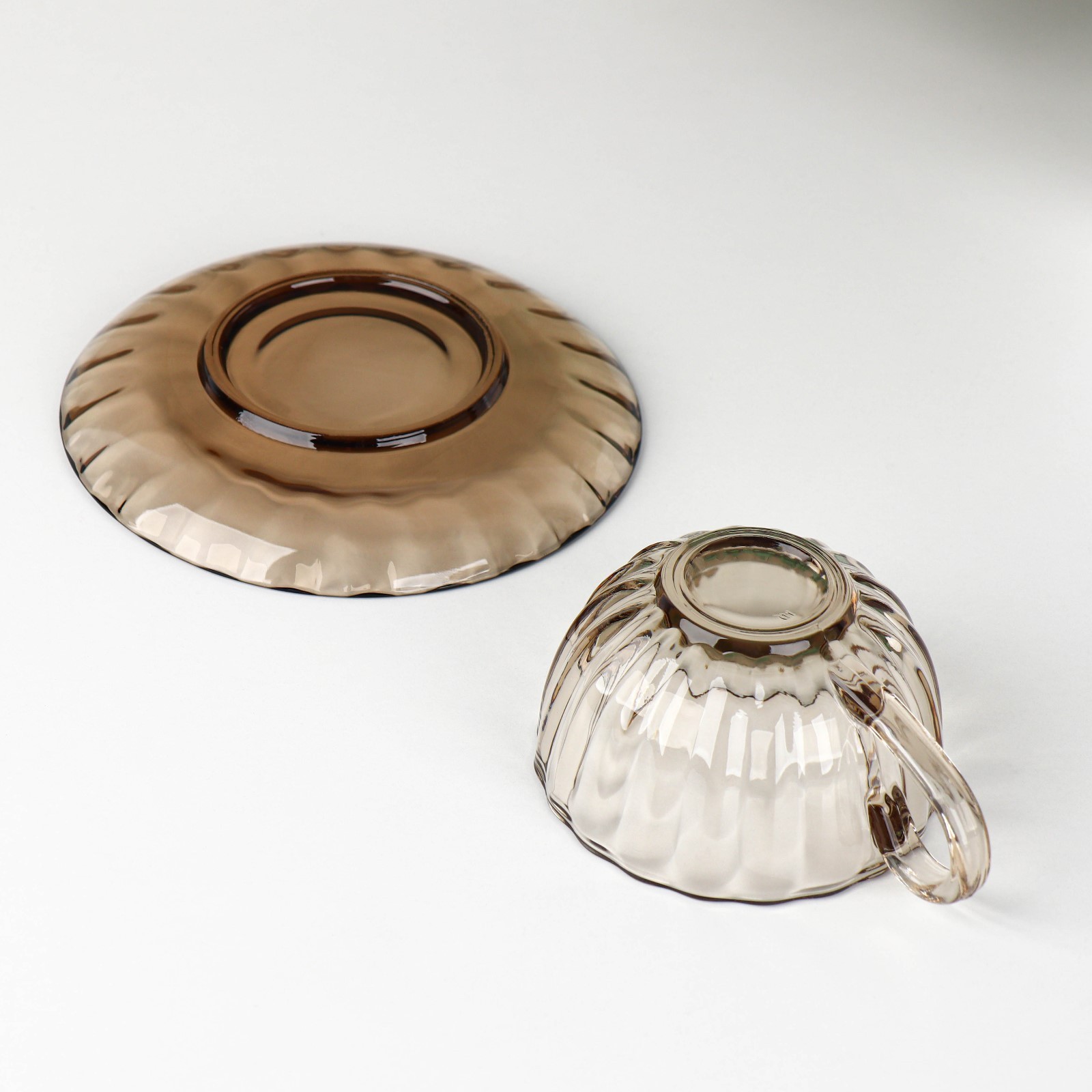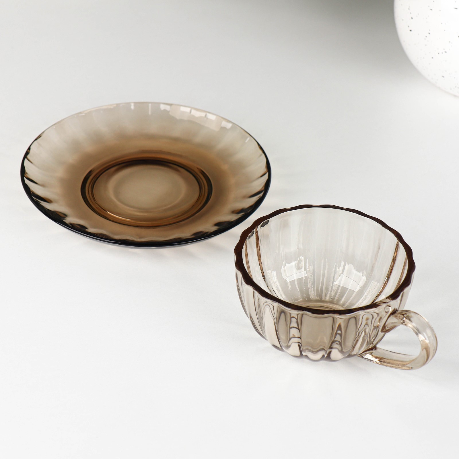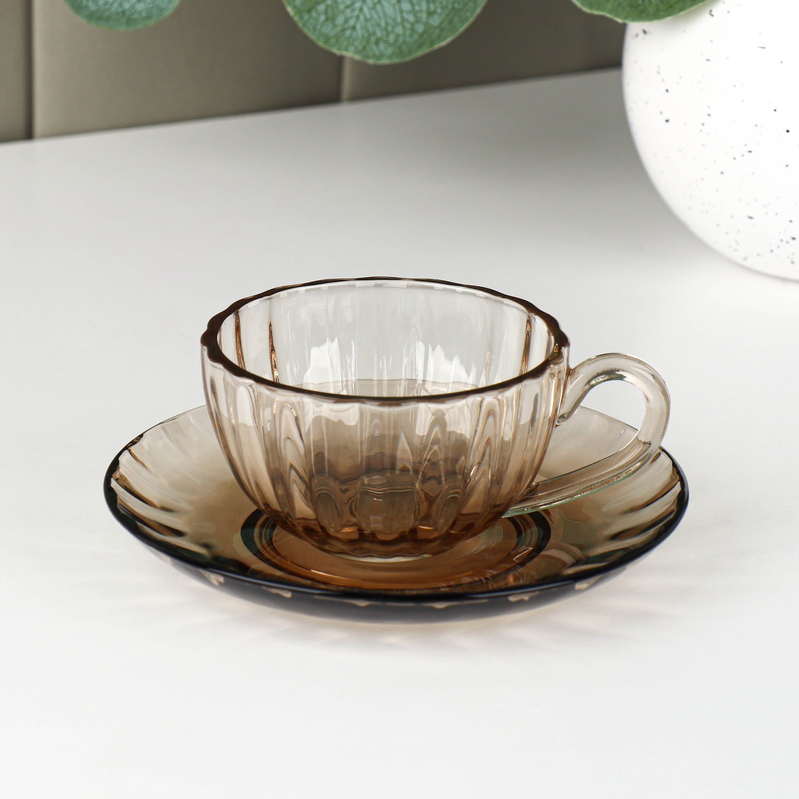 Чайная пара стеклянная «дымка», 2 предмета: чашка 200 мл, блюдце. Чайная пара «Дымка» изготовлена из прочного стекла. Стеклянное изделие легко украсит вашу кухню и станет отличным дополнением даже к классическому сервизу. Чашка и блюдце прекрасно подойдут в качестве подарка по любому поводу. Можно использовать в СВЧ и посудомоечной машине. Преимущества товара: Стекло является экологически чистым материалом, который не содержит вредных веществ и не влияет на вкус напитков. Стеклянные кружки обладают высокой термостойкостью, что позволяет использовать их для горячих и холодных напитков. Стекло прозрачно, что позволяет видеть цвет и консистенцию напитка. Стеклянные кружки легко моются и не впитывают запахи. Стеклянные кружки имеют стильный и современный вид, который подходит для любого интерьера. Цвет: Коричневый parts count: 0 Количество персон: 1 В наборе, шт.: 2 Объём, мл: 200 tnved: 7013379100 Вид упаковки: Коробка картонная Материал: Стекло Наличие подставки: Нет Для детей до 3 лет: Нет Можно мыть в посудомоечной машине: Да Можно использовать в СВЧ-печи: Да Текстура: С рельефом Особенности: Без особенностей Запрет реализации по сегментам: 00000000485  развернуть описание ▼