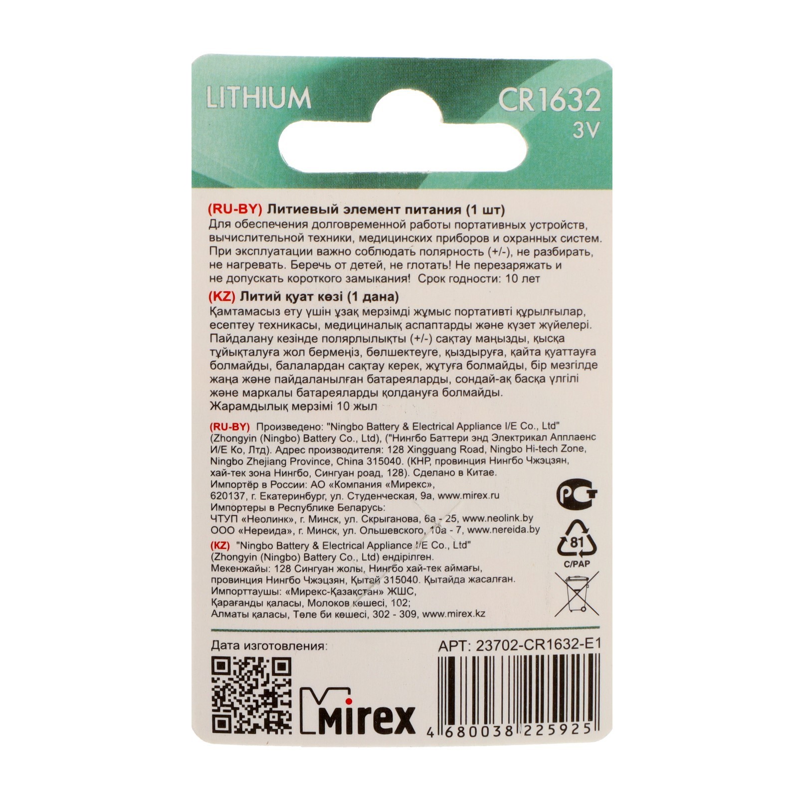 Батарейка литиевая Mirex, Cr1632-1bl, 3в, блистер, 1 шт.
