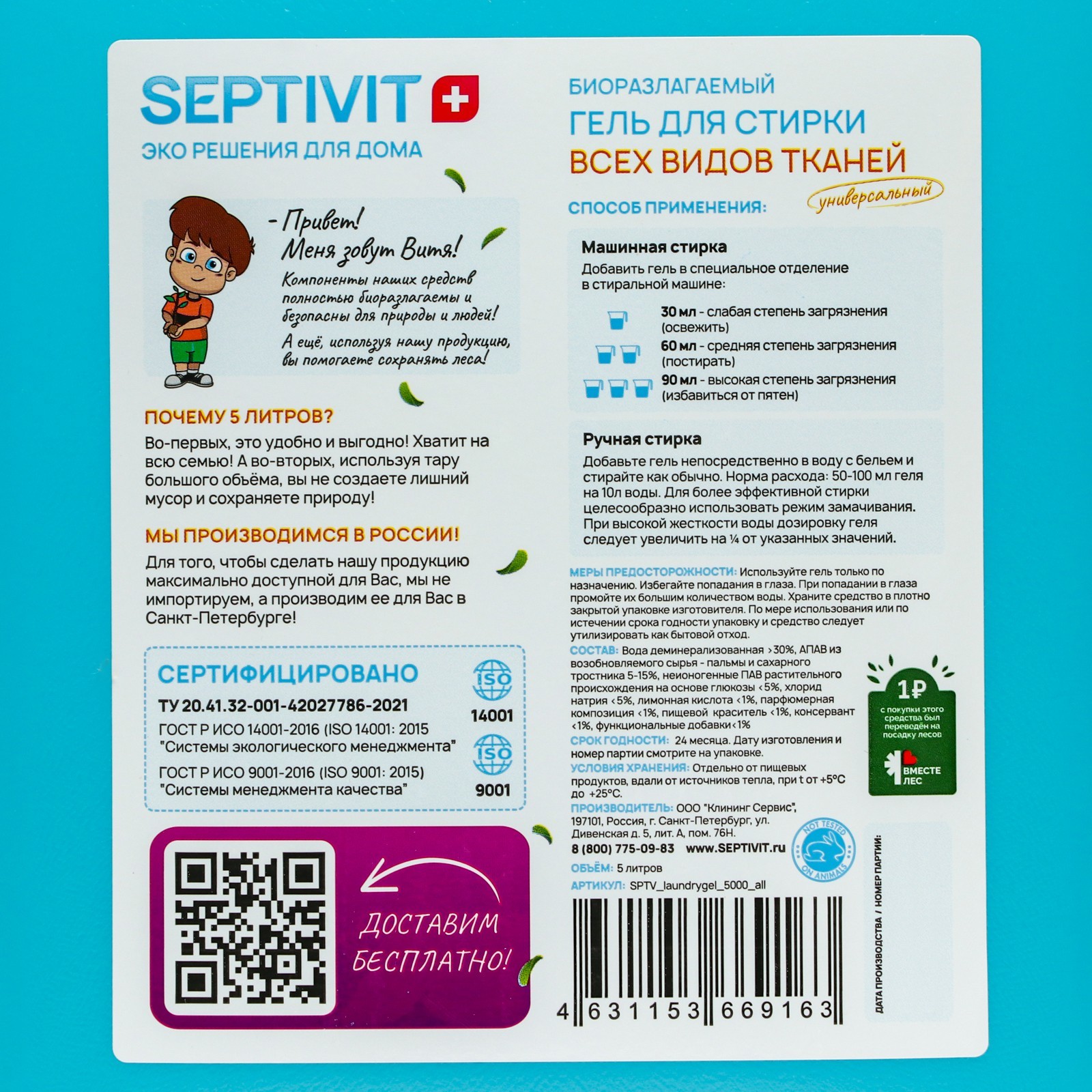 Гель для стирки septivit "голубой лён" для всех видов тканей, 5 л. Гель для стирки SEPTIVIT Premium - удобная и эффективная формула для стирки белья. Жидкий порошок для стирки обеспечивает бережный уход за вещами, не оставляя разводов и сохраняя первоначальный вид ткани. Экологичный, гипоаллергенный состав подходит для людей с чувствительной кожей, ведь средство полностью вымывается из волокон ткани, а на одежде не остается запаха отдушки. Гель для стирки белья можно использовать для ручной и машинной стирки. Продуманная линейка средств, позволит каждому найти "свое" идеальное средство для стирки. Septivit Premium - ЭКО-решения для Вашего дома! Состав: вода деминерализованная >·30 % ПАВ из возобновляемого сырья - пальмы и сахарного тросника 5-15%, неиногенные ПАВ растительного происхождения на основе глюкозы <5%, хлорид натрия <5%, лимонная кислота <1%, парфюмерная композиция <1%, пищевой краситель <1%, консервант <1%. функциональные добавки <1%. Объём, л: 5 Вес, г/Объём, мл: 5000 Форма выпуска: Жидкость Назначение: Для всех видов тканей Вид стирки: Для всех видов стирки : 0 Температурное ограничение: Нет Особенности средства: Экосредство  развернуть описание ▼