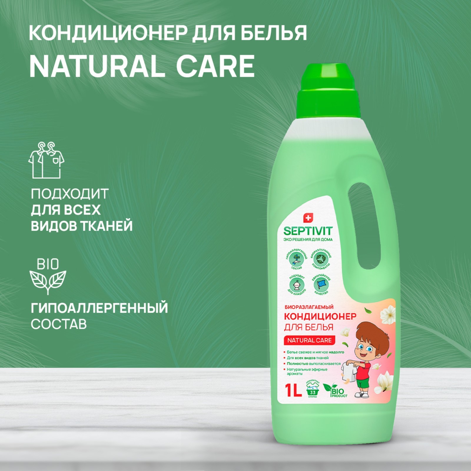 Кондиционер septivit "забота природы", 1 л. КОНДИЦИОНЕР ОПОЛАСКИВАТЕЛЬ для белья SEPTIVIT Premium придаст белью невероятную мягкость и обеспечит вещам бережный уход. Гипоаллергенный кондиционер-ополаскиватель для белья - высокоэффективное средство, бережно ухаживающее за всеми типами ткани и придающее особую мягкость белью после стирки. Он может использоваться при ручной стирке и в машине автомат. Биоразлагемый кондиционер полностью выполаскивается из волокон ткани и не остаётся на одежде, облегчает глажение и обладает антистатическим эффектом. Жидкость подходит для черной, цветной и белой одежды, деликатных тканей. За счет же того, что у кондиционера гипоаллергенный состав, бытовая химия станет идеальным решением для стирки детских вещей. Кондиционер ополаскиватель сертифицирован в Международной организации по стандартизации ISO. Рекомендуем использовать совместно с гелем для стирки белья бренда Septivit PREMIUM. Septivit Premium - ЭКО-решения для Вашего дома! Состав: вода деминерализованная >30%, катионный ПАВ (произведенный на рапсовом масле) 5-15%, консервант <1%, краситель пищевой <1%, парфюмерная композиция <1%. Объём, л: 1 Назначение: Для всех видов тканей Температурное ограничение: Нет Особенности средства: Гипоаллергенность  развернуть описание ▼